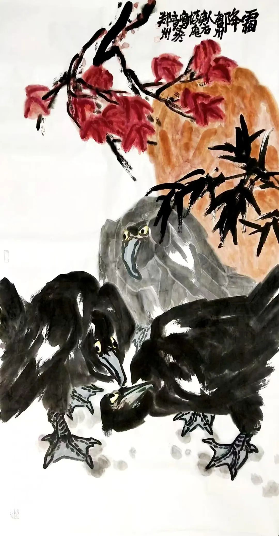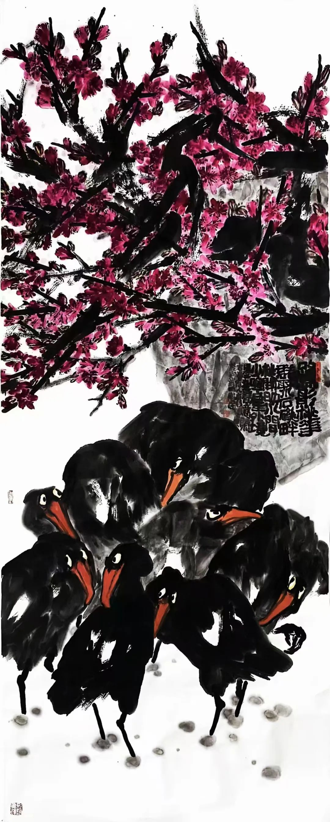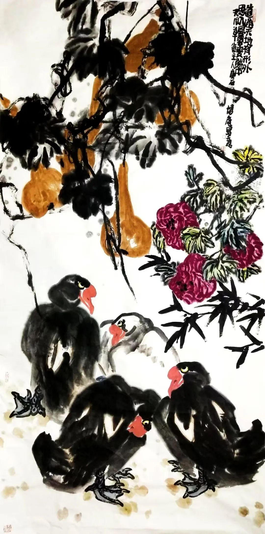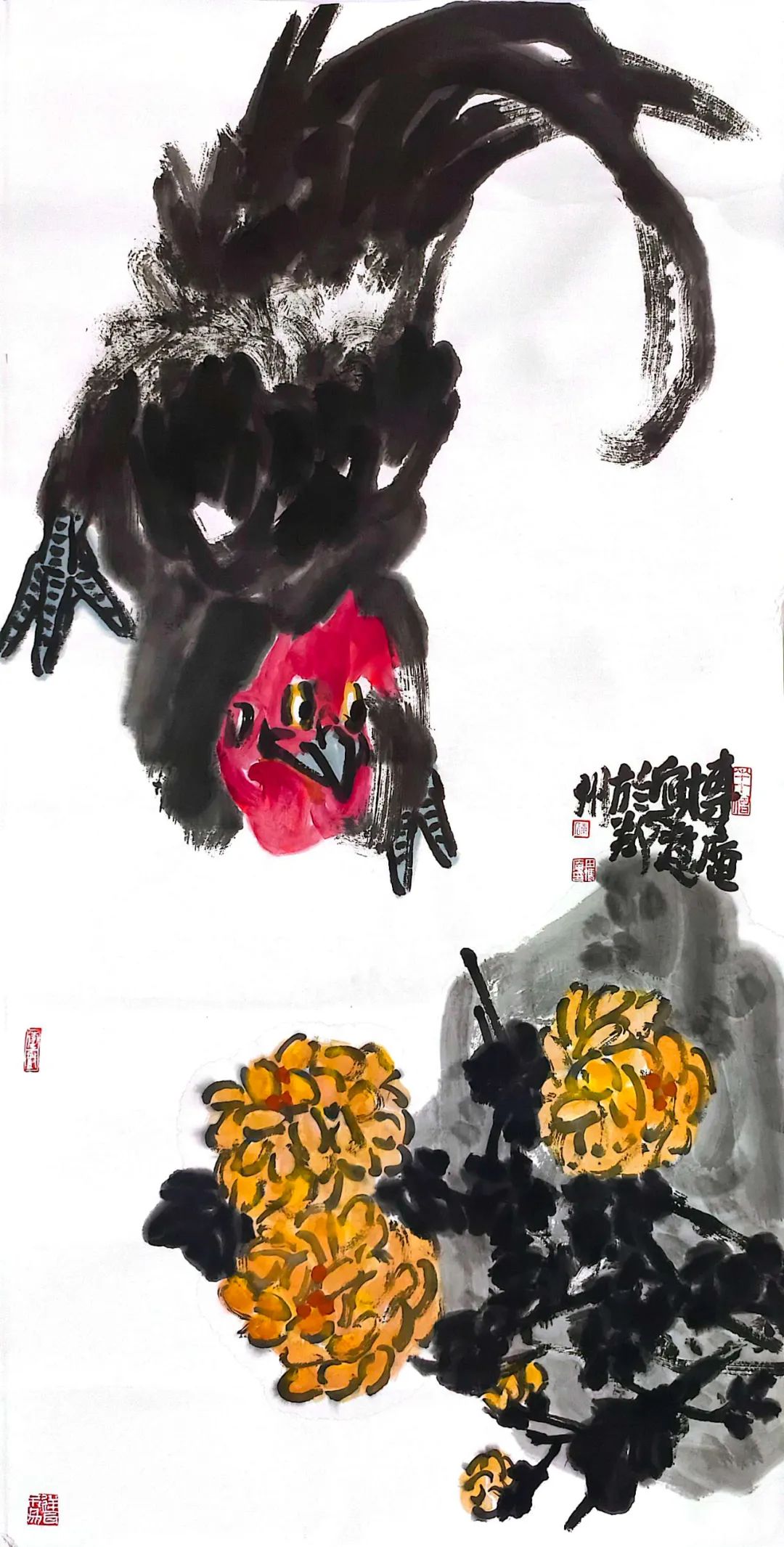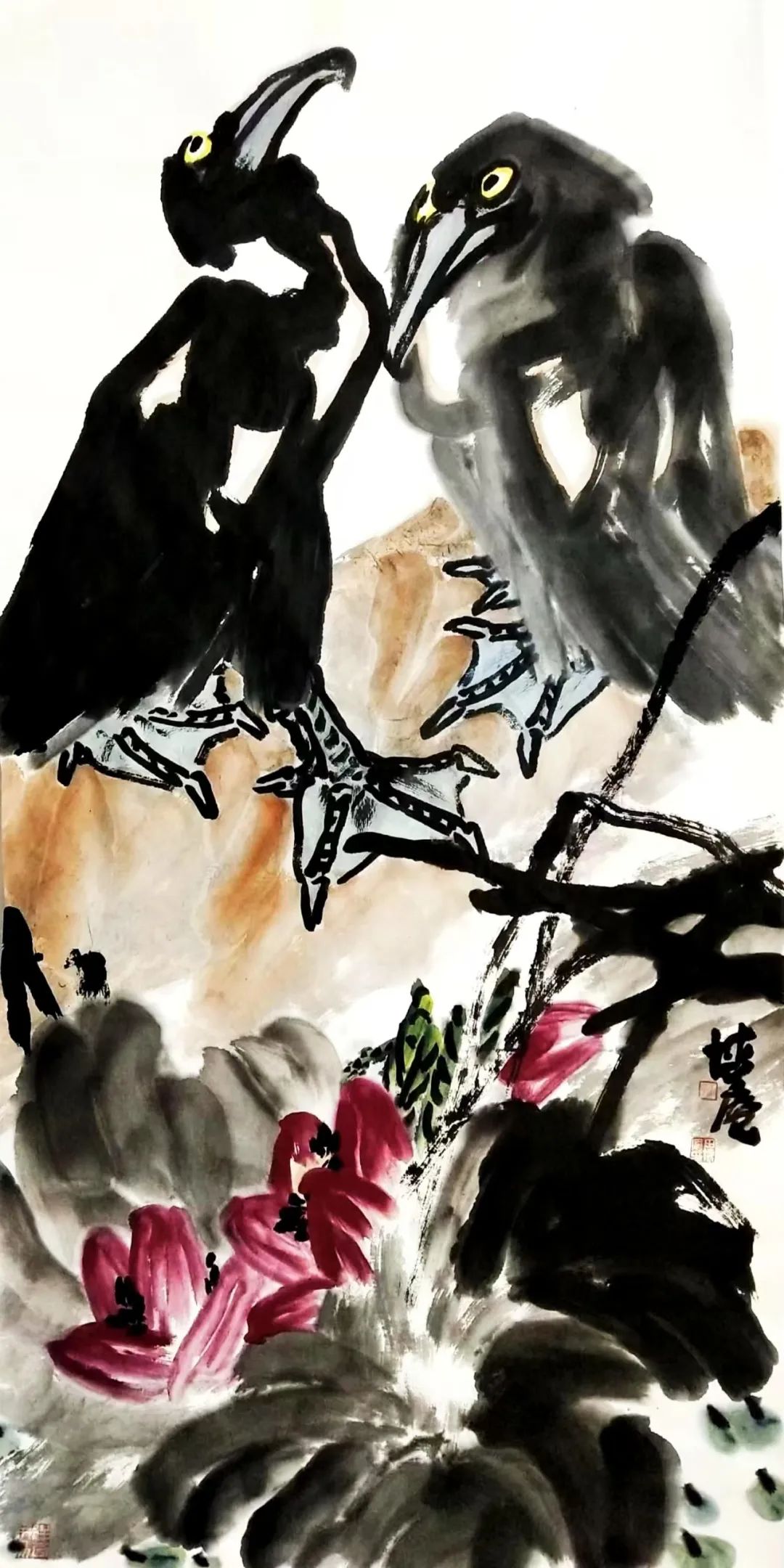 山东菏泽的沃土赋予他朴野鲜活的原生力量一一那是水浒故事流传的豪勇之地,是曹州牡丹甲天下的炽烈乡情,更是高台戏腔与木版年画交织的民俗盛宴;而中岳嵩山的云烟苍茫,则为他注入雄浑苍劲的天地意识。从曹州书画院到嵩山书画院,他怀揣两片厚土的馈赠,以墨为犁、以笔为钺,在中国大写意花鸟画的疆域上,刻下一部名为“重、拙、大”的视觉史诗。