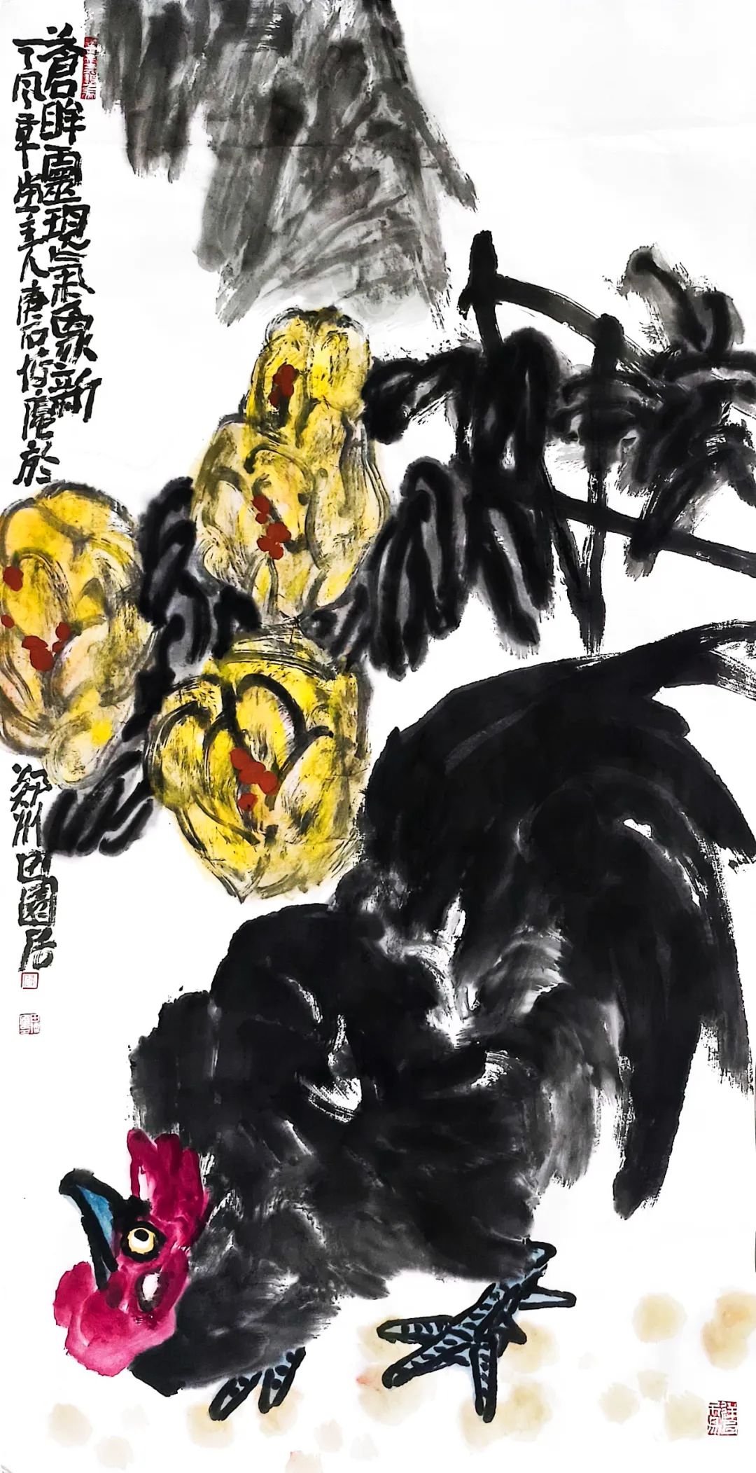 他摒弃文人画的清雅范式,从曹州红陶的粗粝肌理、乡间染坊的浓烈色谱中提炼出铁汁般的沉厚墨韵。焦墨积染如深耕后的墒土,泼墨奔淌似决堤的黄河故道,在“黑到极致”处迸发出土地窖藏的生命之光(《秋实图》中乌亮石榴绽开的朱砂籽粒)。