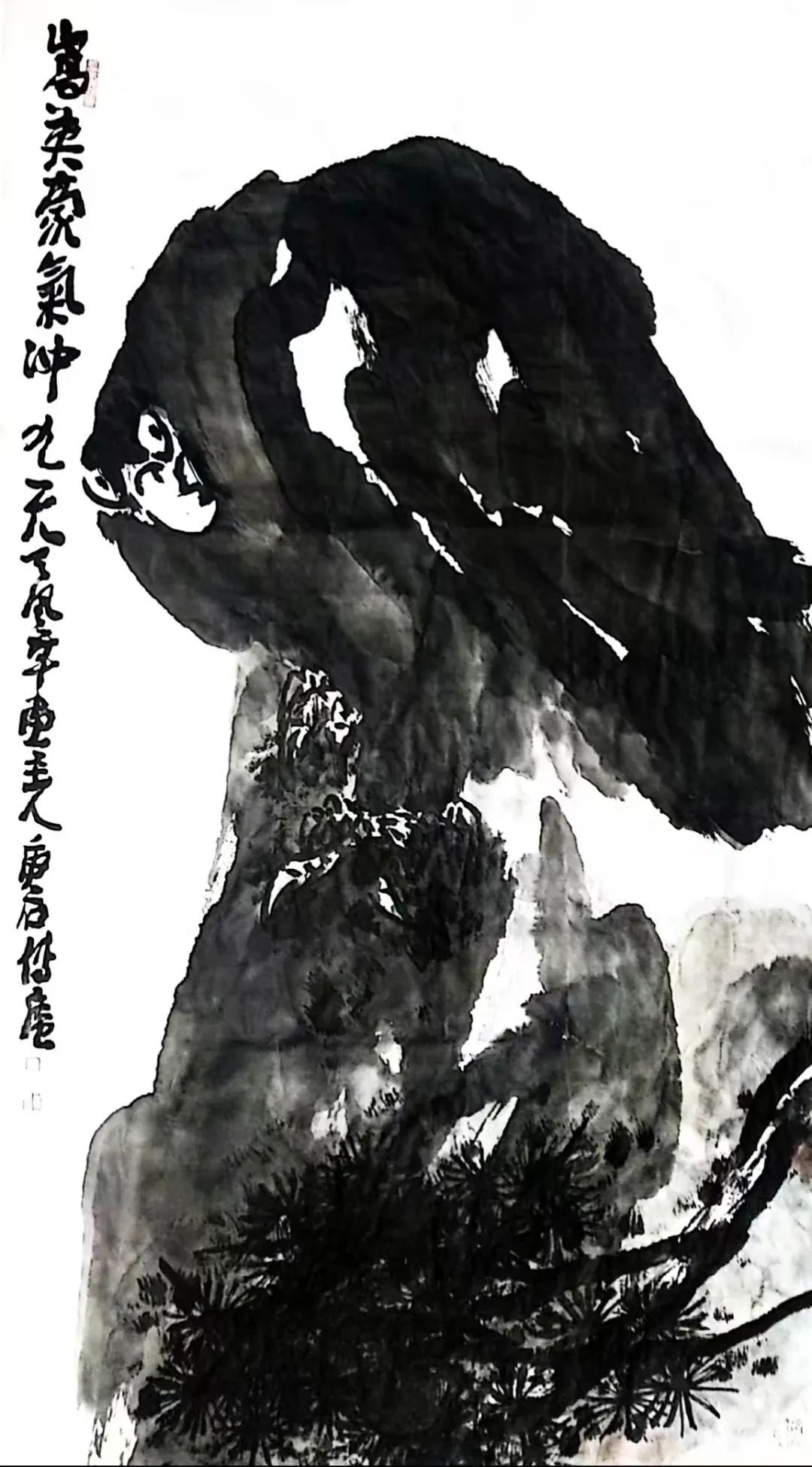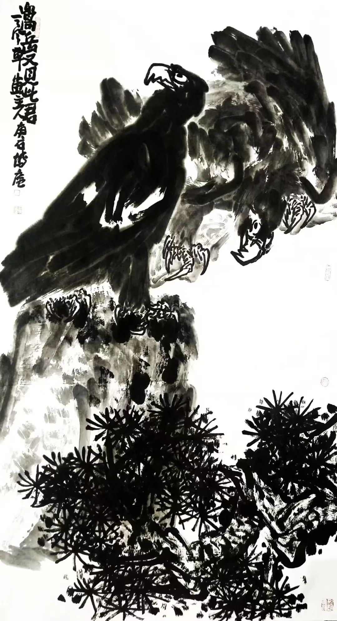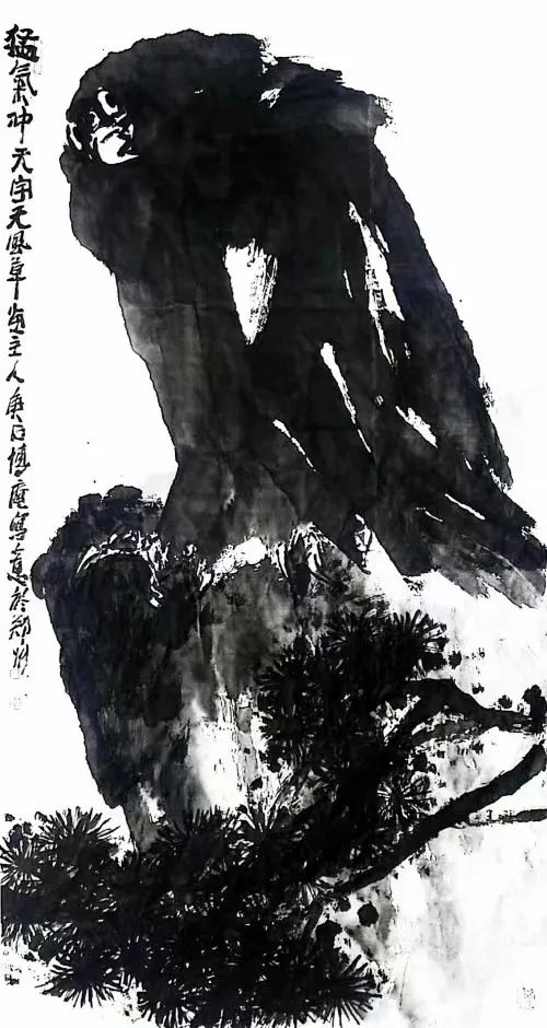 菏泽大平调的高亢唱腔,化作笔下顿挫如雷的斩铁笔锋;水浒英雄的朴刀身影,凝成老藤虬枝的刚健线势(《古木寒鸦图》中刀劈斧凿的枝干);民间拳术的发力轨迹,演变为雄鹰振翅的遒劲弧线(《嵩岳击云》翅梢如枪尖挑月)。