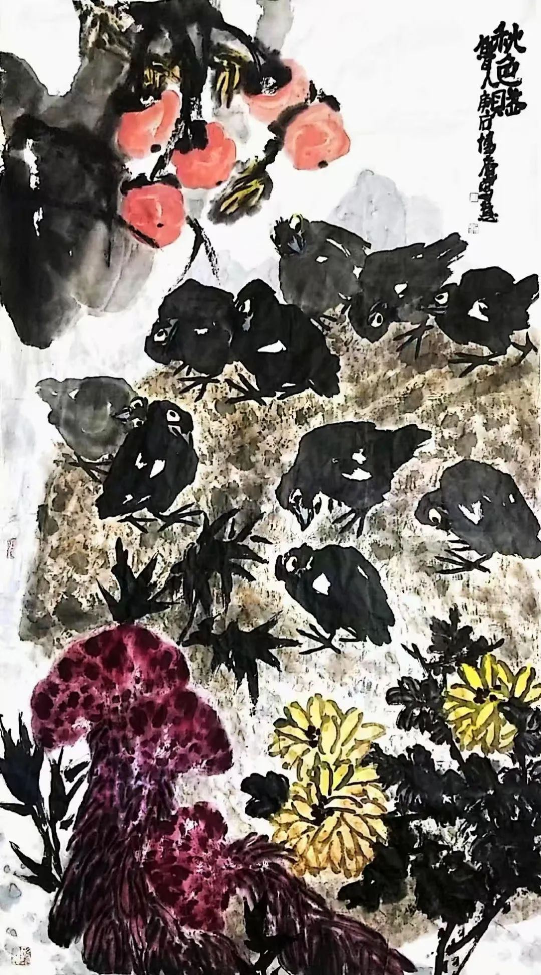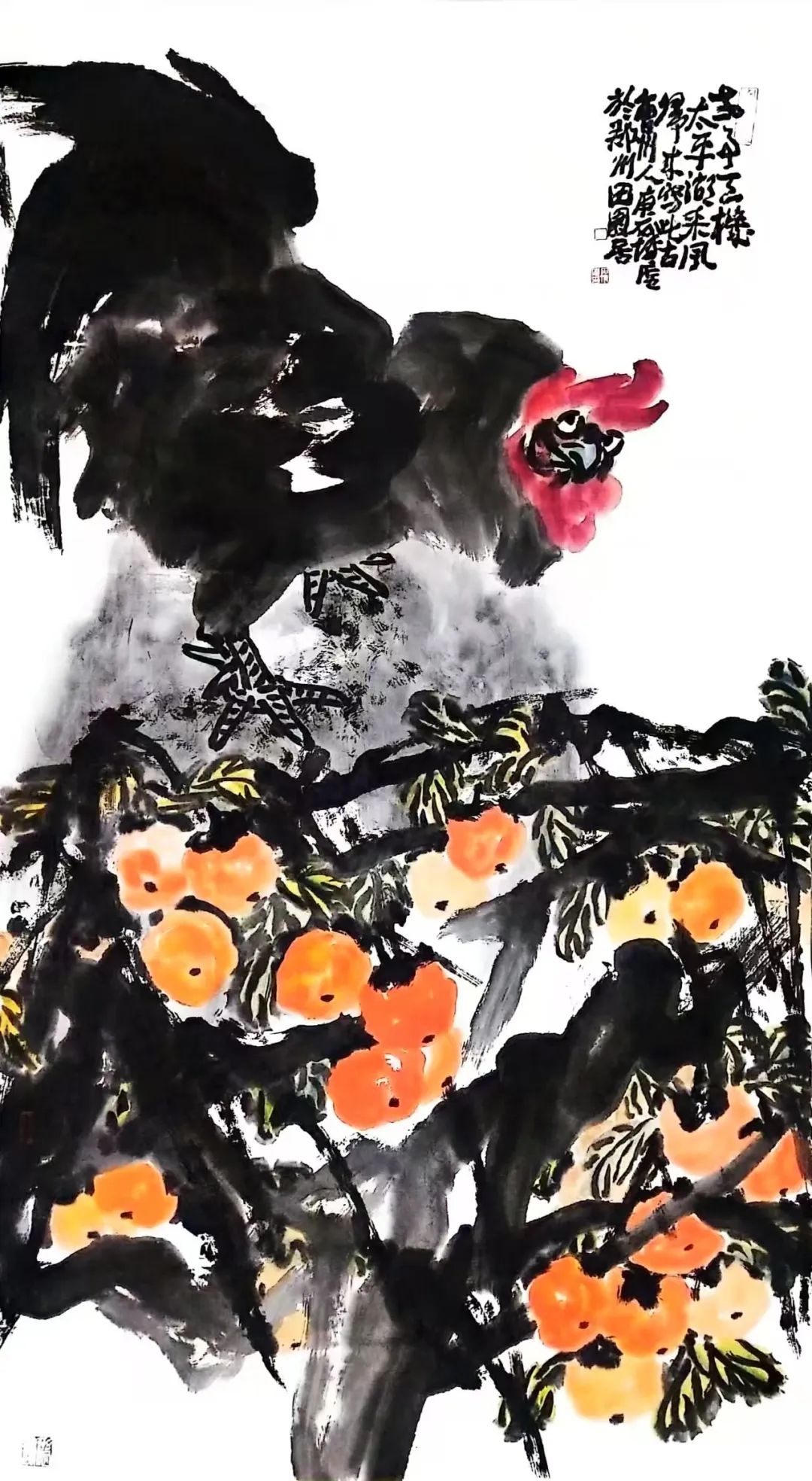 《大河秋熟》里压弯枝头的红柿如星火燎原,是对鲁西南“五谷蕃熟穰穰满家”(《史记》语)的图腾礼赞。密不透风的墨象丛林间,流淌着民间社戏般的热烈呼吸。