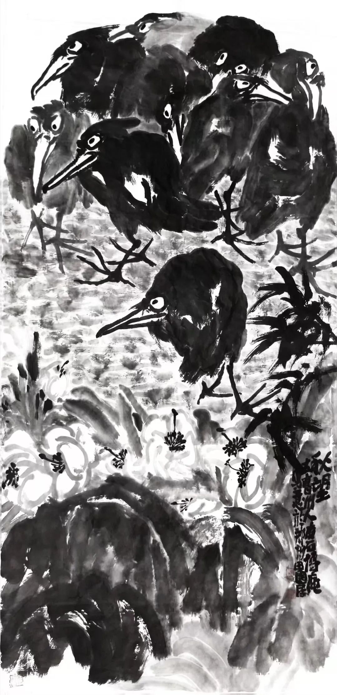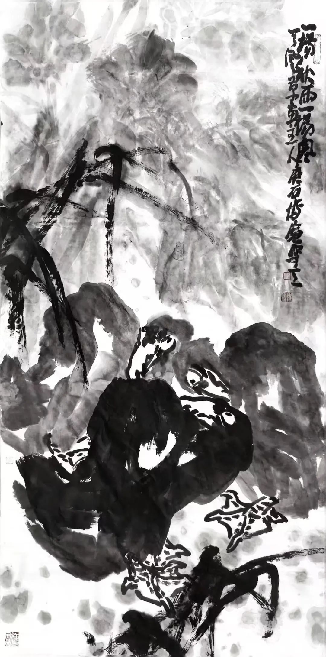 菏泽木版年画的饱满构图、炽烈对比启迪其墨色张力一一他以墨代彩,在《墨莲交响》中以浓淡冲撞模拟青红交错的民间色彩逻辑,让水墨释放出堪比农民画的生命呐喊。