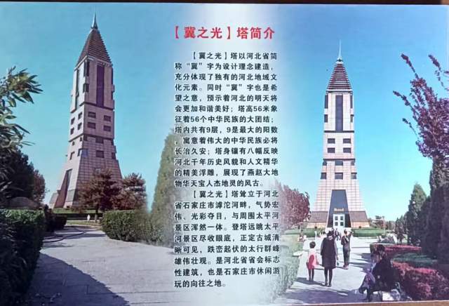 【冀之光】塔以河北省简称“冀”字为设计理念建造,充分体现了独有的河北地域文化元素。同时“冀”字也是希望之意,预示着河北的明天将会更加和谐美好;塔高56米象征着56个中华民族的大团结;塔内共有9层,9是最大的阳数,寓意着伟大的中华民族必将长治久安;塔身镶有八幅反映河北千年历史风貌和人文精华的精美浮雕,展现了燕赵大地物华天宝、人杰地灵的风古。