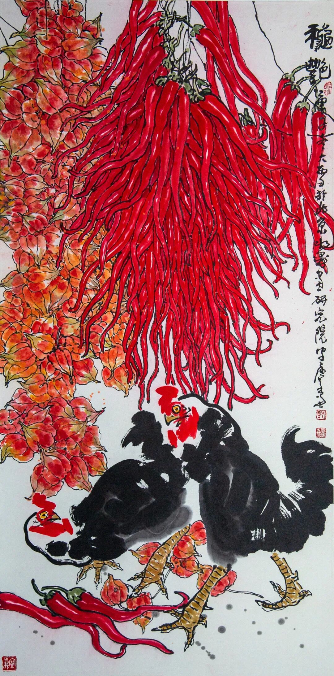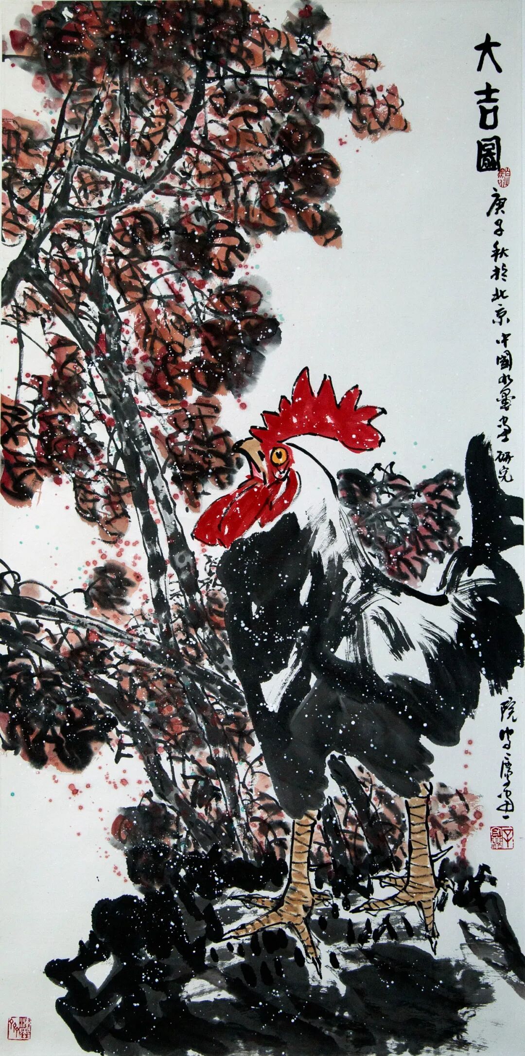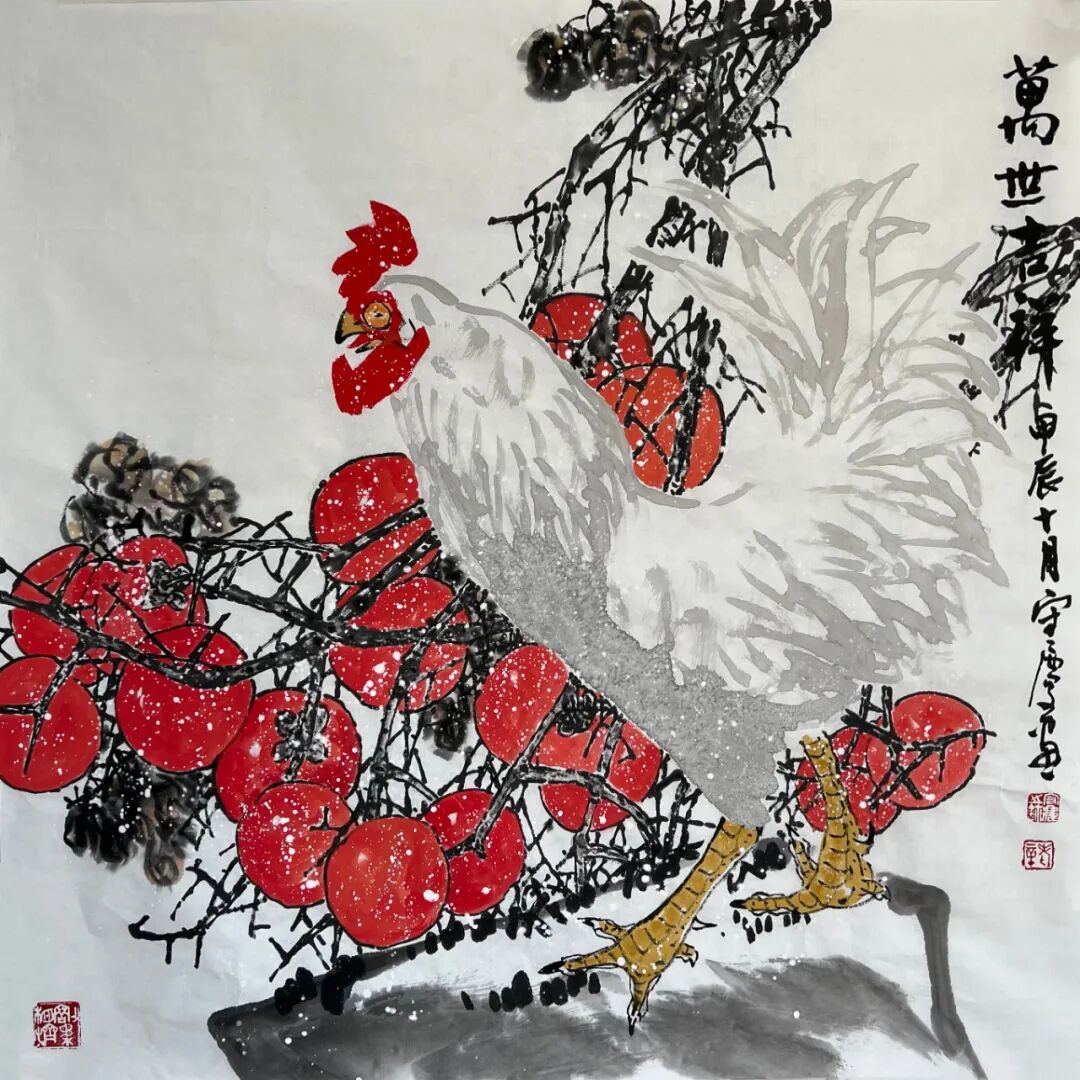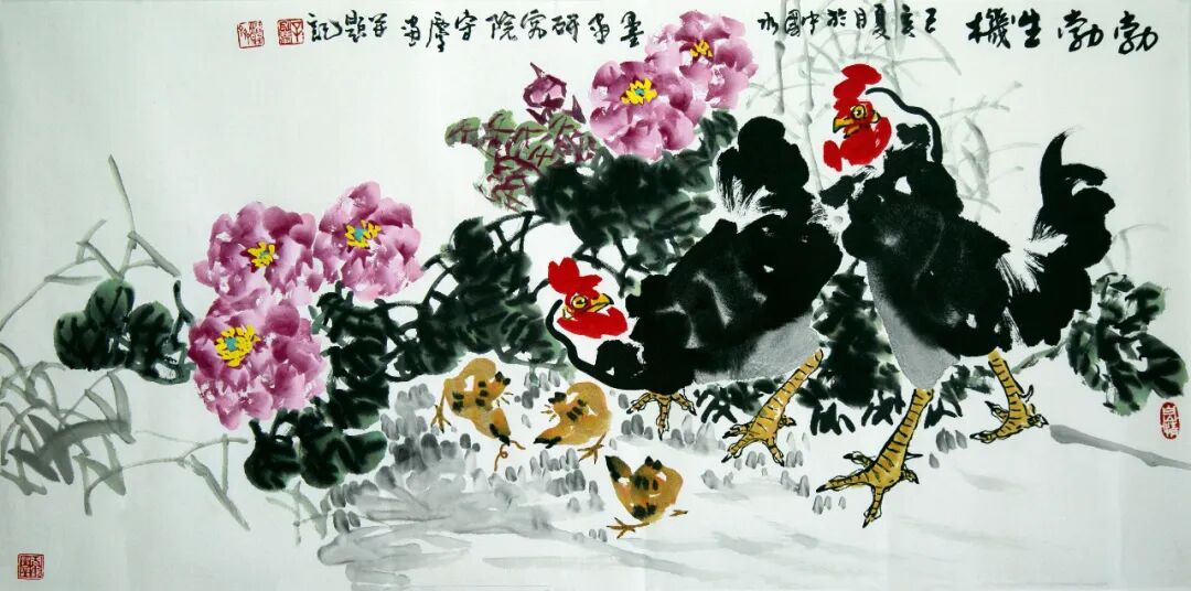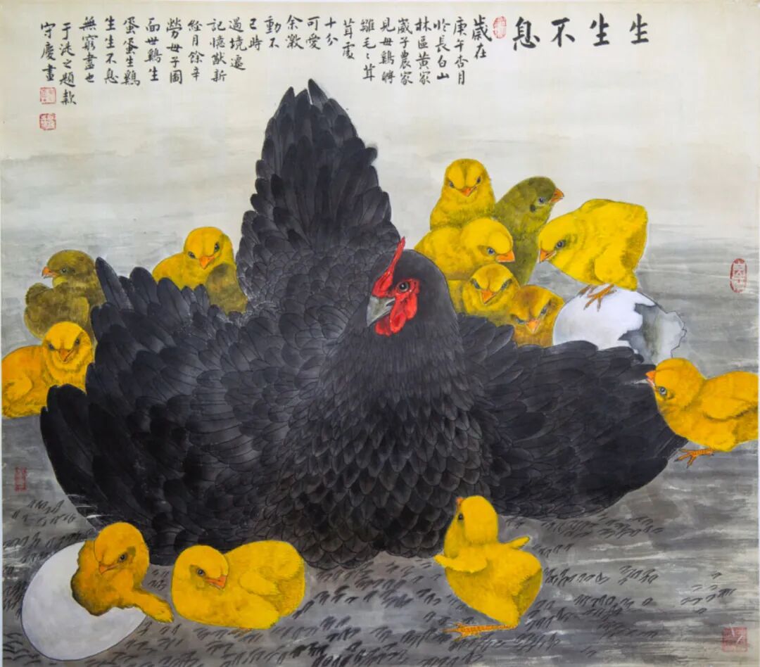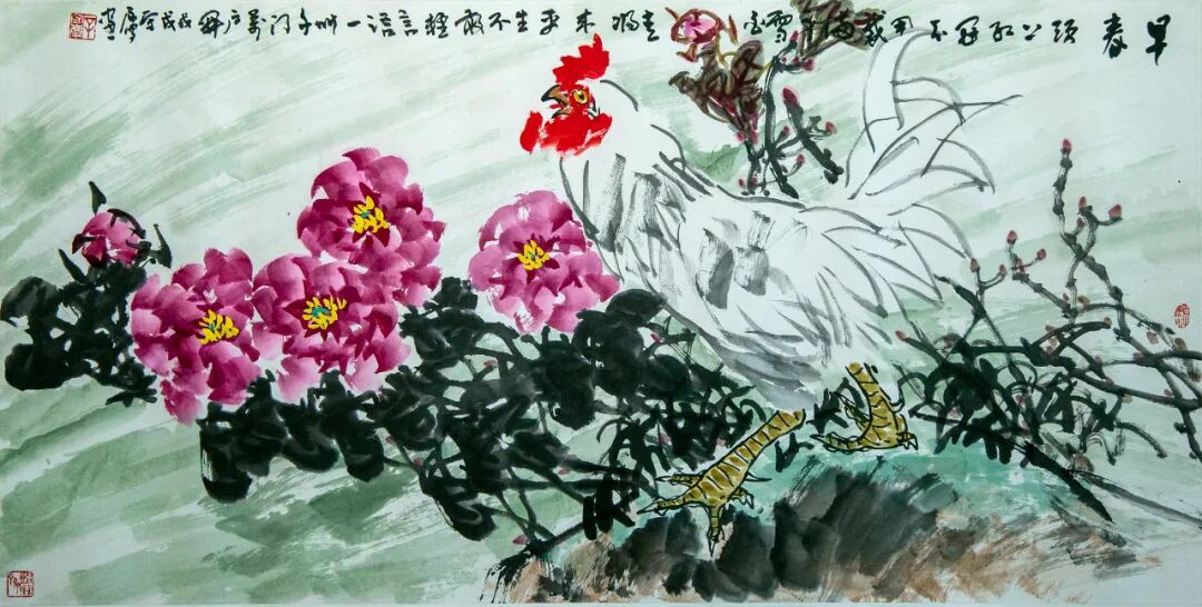 辛守庆的花鸟画作品以其独特的艺术风格和深厚的文化底蕴而著称。他的画作题材广泛,松树、孔雀、群鸡、牡丹等都被他赋予了新的生命和活力。他的作品不仅展现了自然之美,还蕴含着深刻的文化内涵和哲学思想。