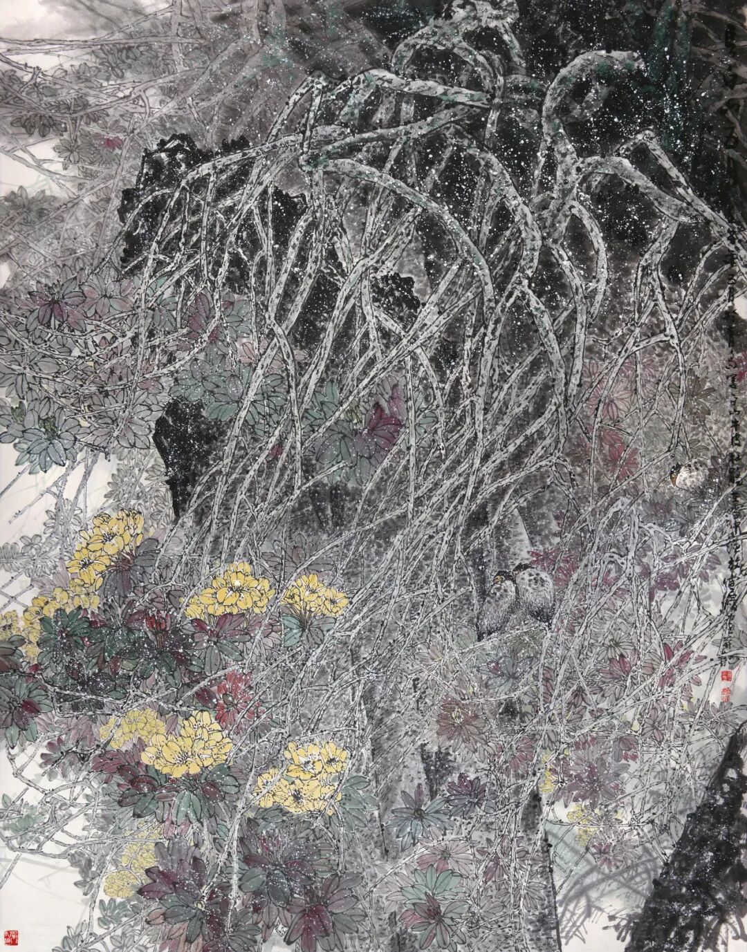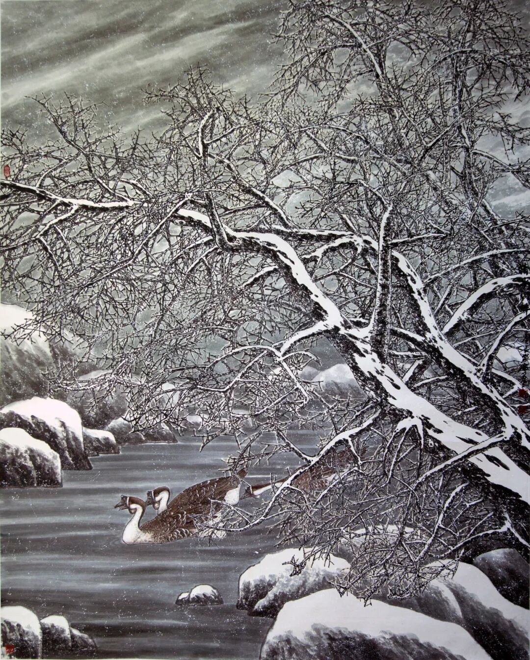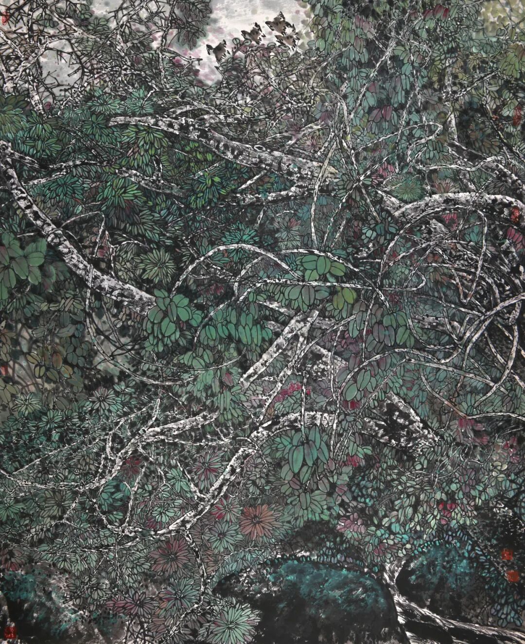 辛守庆的花鸟画作品特别注重意境的营造和神韵的表达。他善于通过独特的笔墨语言,传达出自然万物的生机与活力。他的作品构图新颖,不拘泥于传统和谐对称的形式,追求构图的奇突与美感。他以粗犷有力的笔触和对比强烈的色彩,展现了自然万物的生机与活力。他尤其擅长表现北方茂密杂树,利用这些题材传达对自然生态环境的担忧和对生态美景的向往。