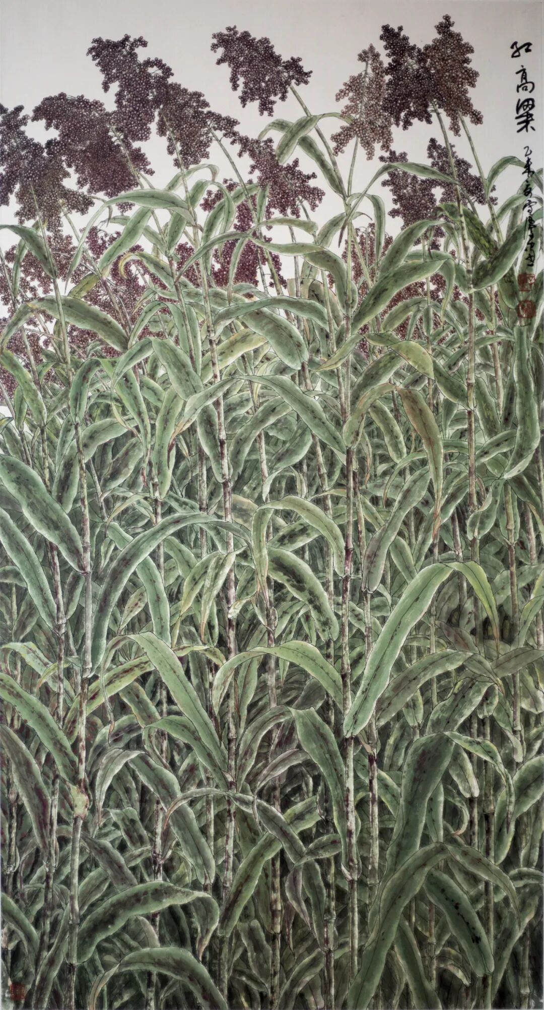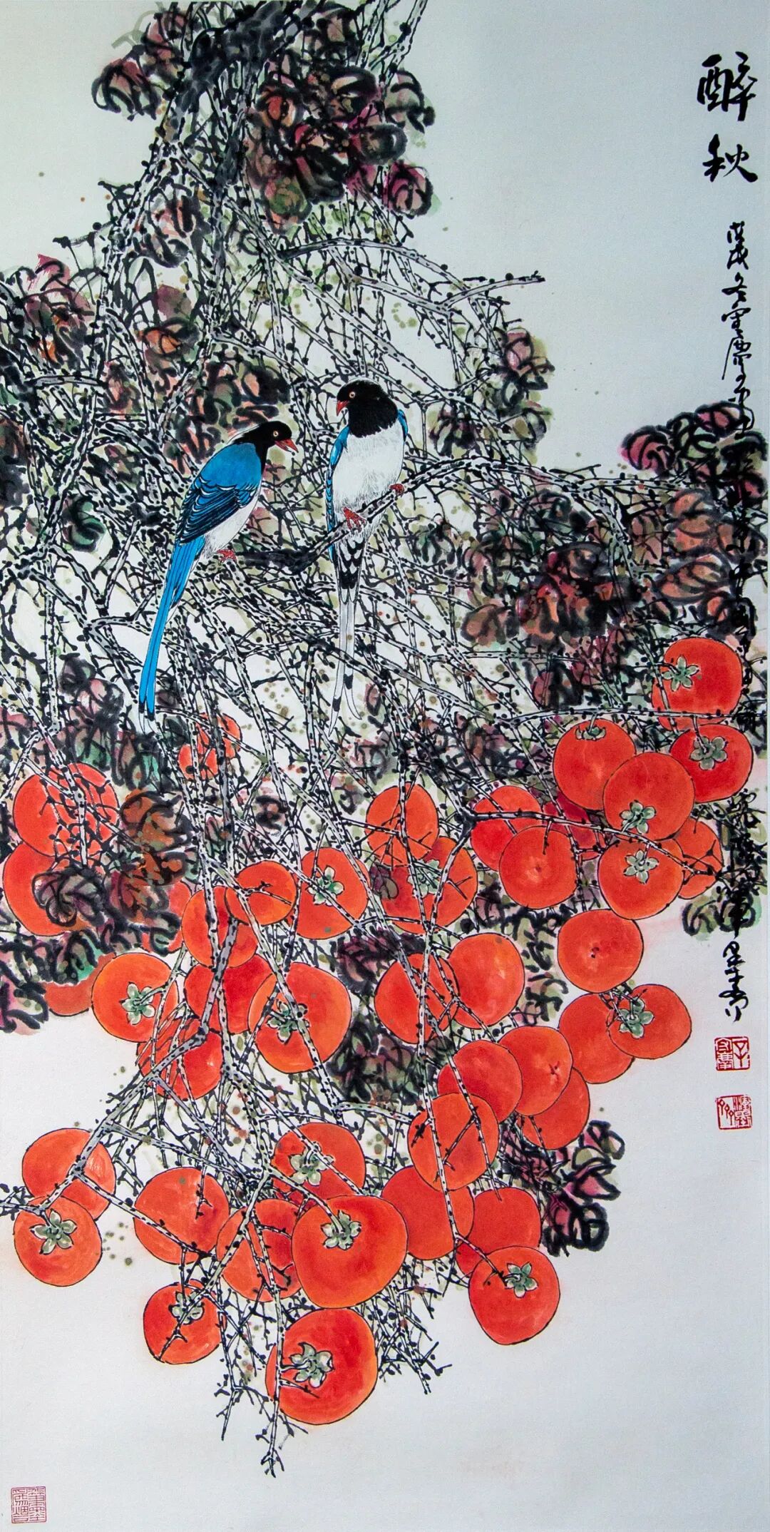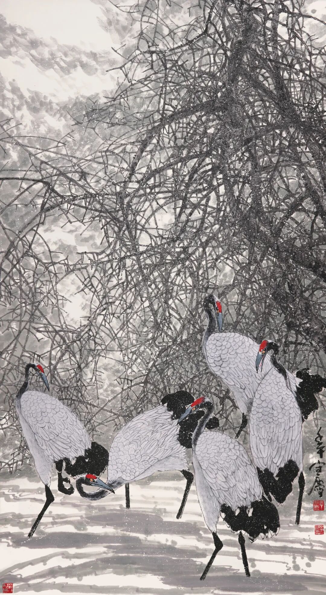 辛守庆的花鸟画作品特别注重意境的营造和神韵的表达。他善于通过独特的笔墨语言,传达出自然万物的生机与活力。他的作品构图新颖,不拘泥于传统和谐对称的形式,追求构图的奇突与美感。他以粗犷有力的笔触和对比强烈的色彩,展现了自然万物的生机与活力。他尤其擅长表现北方茂密杂树,利用这些题材传达对自然生态环境的担忧和对生态美景的向往。