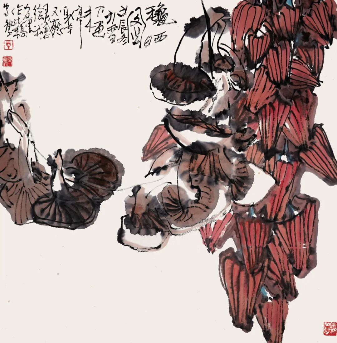 辛守庆是花鸟画界少见的工、写兼擅的画家。他的工笔花鸟画细腻入微,线条流畅而富有弹性,色彩鲜艳而不俗气。他的写意花鸟画则笔墨淋漓,挥洒自如,充满了动感和生命力。他的用笔举重若轻,融合汉魏风韵与隋唐之气,即使在渴笔运用中,也能保持清新温润。他的用色光亮淡雅又绵厚,用墨则大胆融合多种技法,如以重墨、湿墨、渍墨介入,兼用墨破色、撞水等,使画面呈现出独特的韵味。