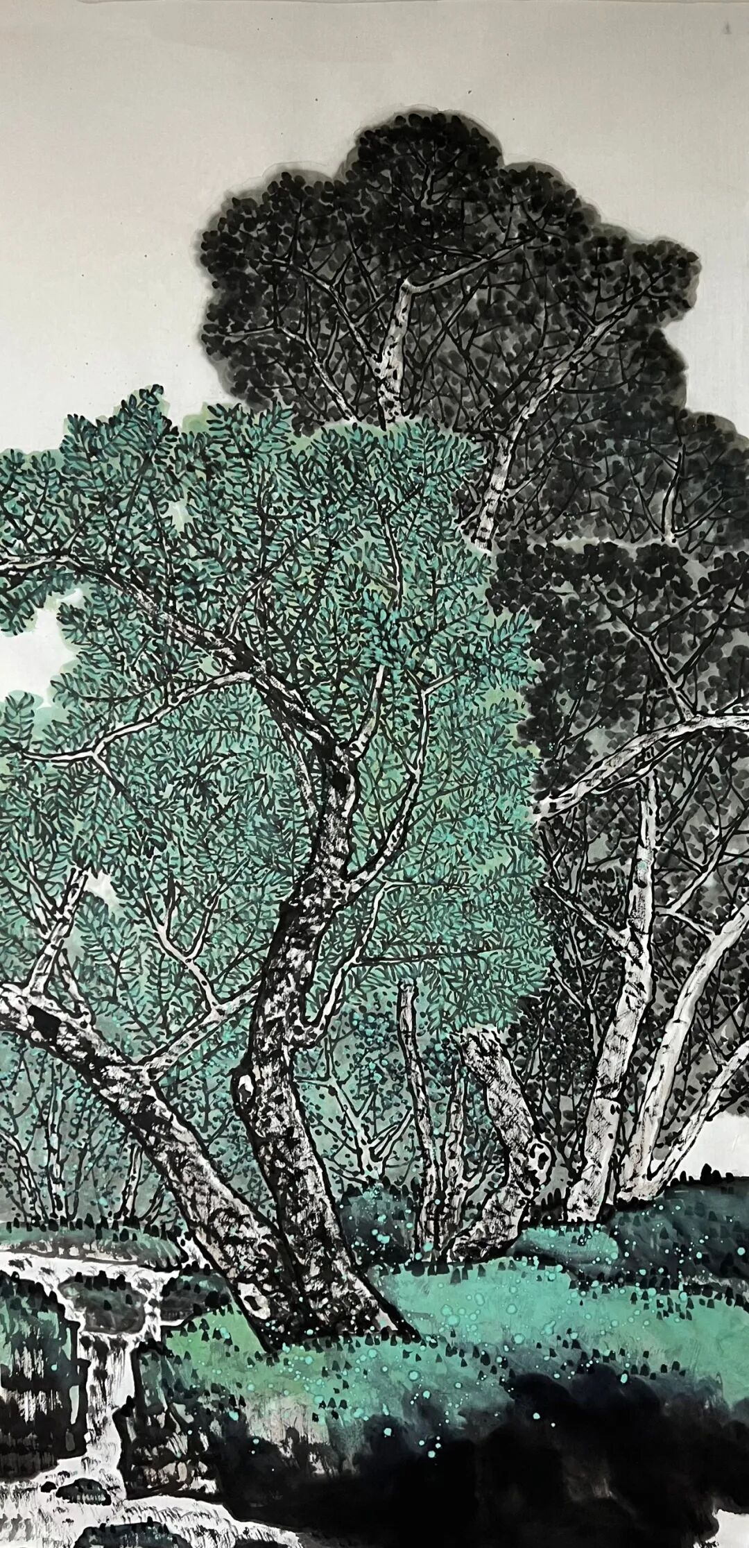 《参天》则以长白山的森林为背景,展现了长白山的雄浑与壮美。画面中,参天大树挺拔而立,枝叶繁茂,展现出一种强大的生命力。画家运用粗犷有力的笔触和对比强烈的色彩,展现了长白山森林的雄浑与壮美。画面中,树木的枝干被画家用浓墨重彩勾勒出来,展现出一种强大的力量感。同时,画家在画面中巧妙地融入了阳光和云雾,使画面充满了灵动与生机。这幅作品不仅展现了长白山森林的自然之美,也体现了画家对自然生态环境的敬畏和保护之情。