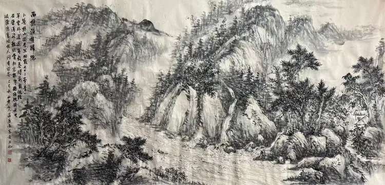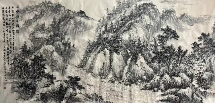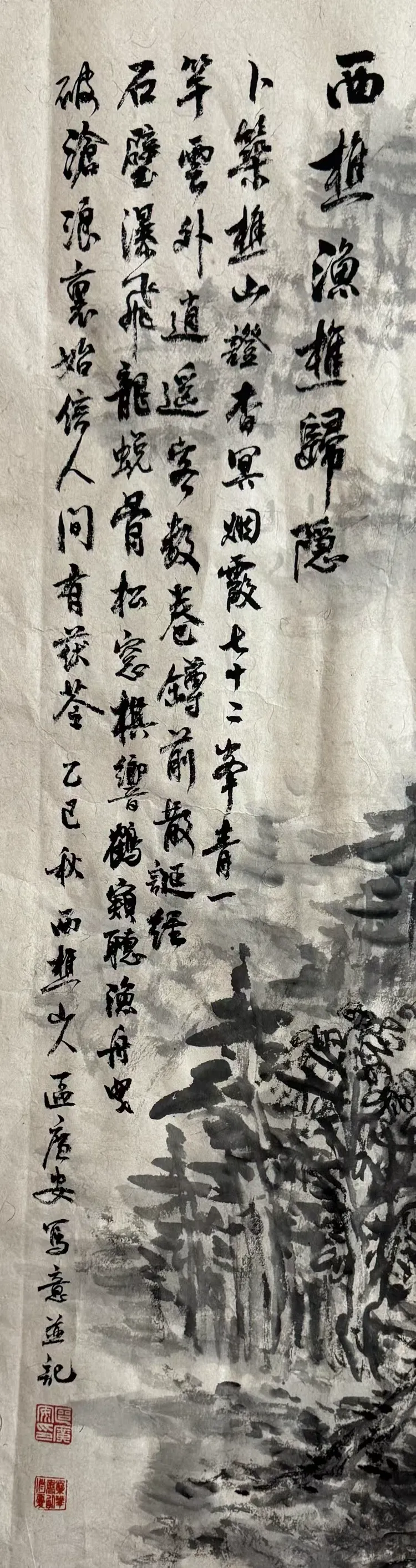 昔者庄周垂钓濠梁,渔父鼓桨沧浪,皆托山水以明志,寄烟霞而养真。今写八尺巨幛,西樵胜景粲然目前,以述其志。