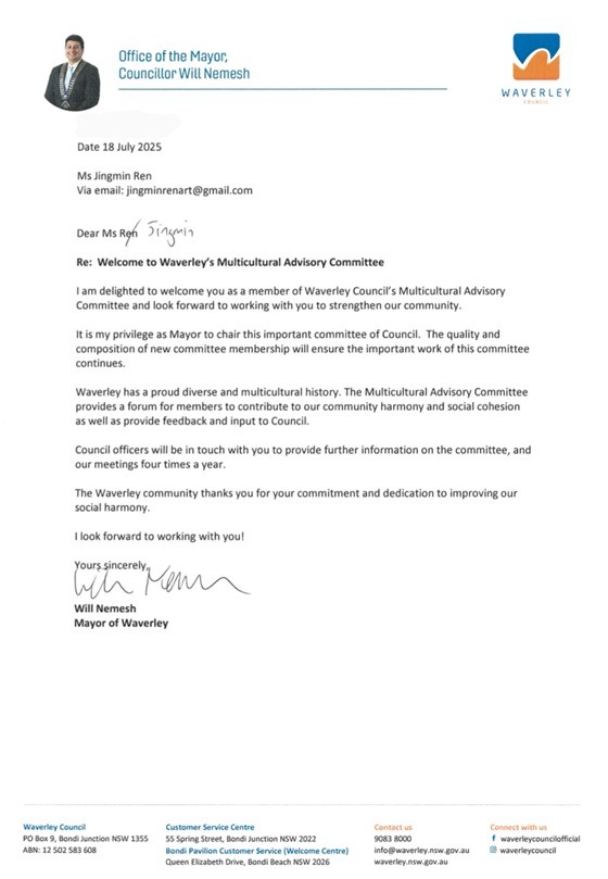 随后,她又从手机中找出一封信:“这些是新南威尔士州Waverley 市长及 多元文化顾问委员会主席Will Nemesh先生给我的欢迎函,作为唯一的华人代表参与其中的工作,昨天刚刚参加了委员会的第一次会议。下次参加会议时,我将带上《心印流年》书签,邀请大家在书签背面用自己的语言写下各自的‘初心词’,共同留下这一份心印的印记。