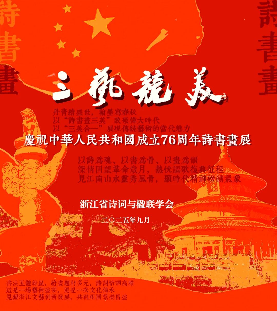 丹青绘盛世,翰墨写春秋。在庆祝中华人民共和国成立76周年之际,浙江省诗词与楹联学会以诗书画“三艺竞美”致敬伟大时代。展览汇聚诗书画精品力作50余件,以“三美合一”展现传统艺术的当代魅力。