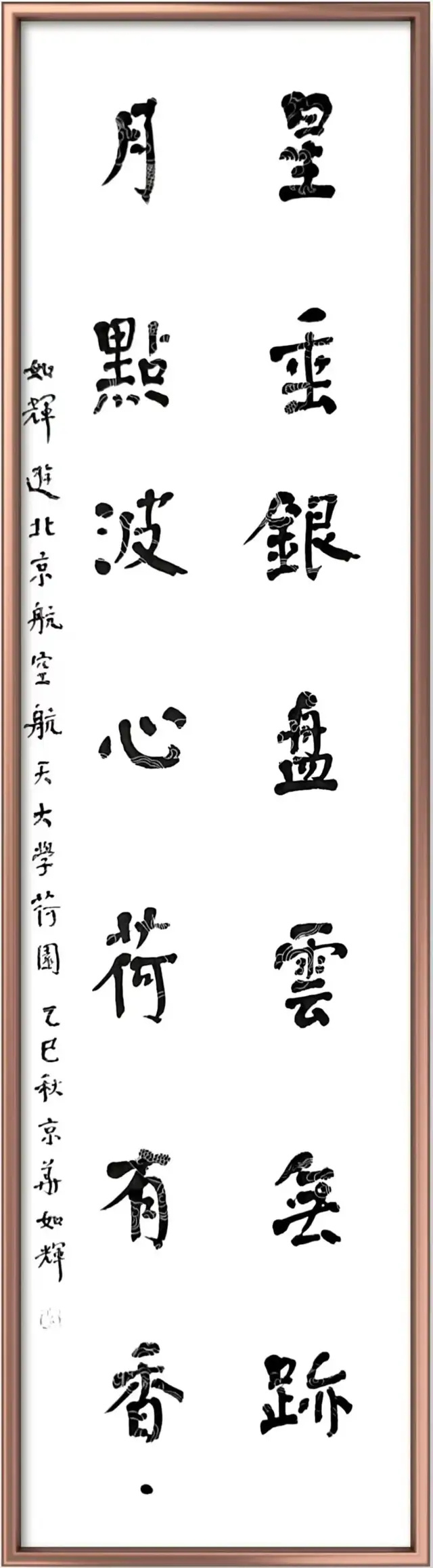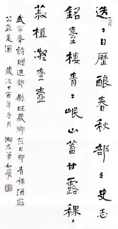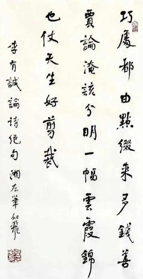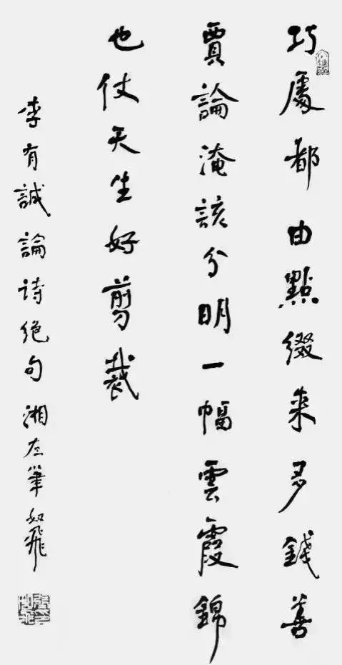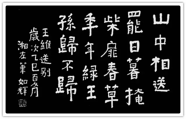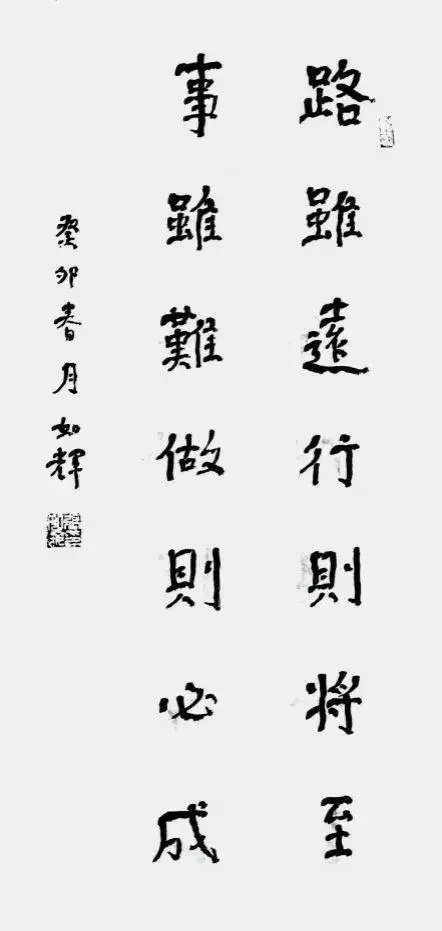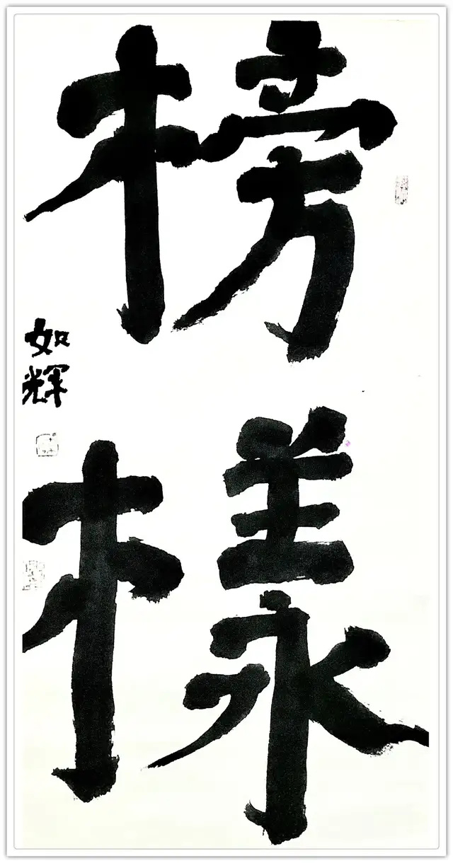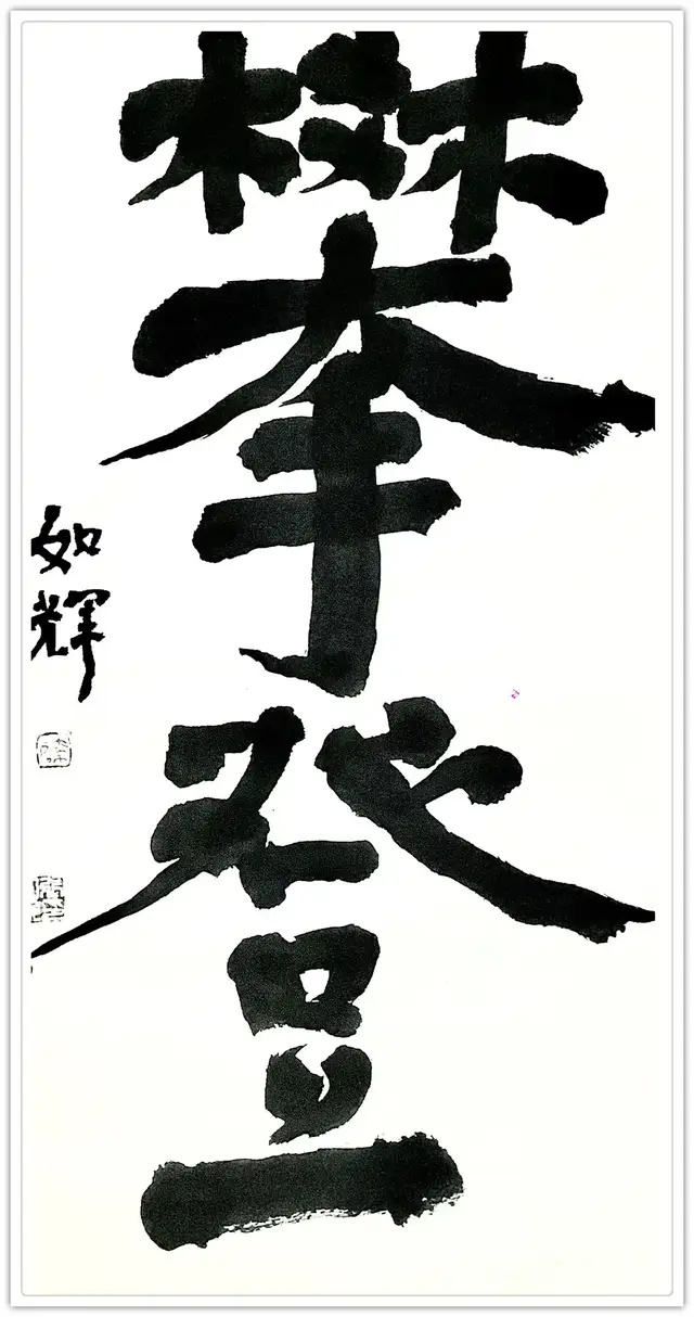 艺术的共性,在于形式和情感互动。书法家通过字形组合,而不是语义构造实施创作。其情感主要在点画、章法、结体、款识、钤印等组合关系中得到体现。而对这些关系的处理表现即可看出书法家的修养和素质。“谁有笔如椽,管领芳菲景”(潘天寿诗)。我以为,在提升书画家的修养和素质上,我和如辉永远在路上。如辉正当盛年,聪慧过人,且勤勉向学,创中国书法左笔书法之新精神,开中国书法左笔书法之新意境,是所望也,是可望也。