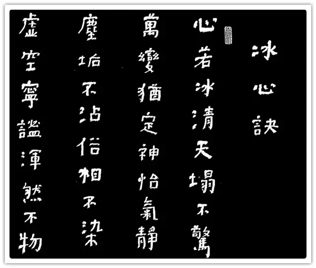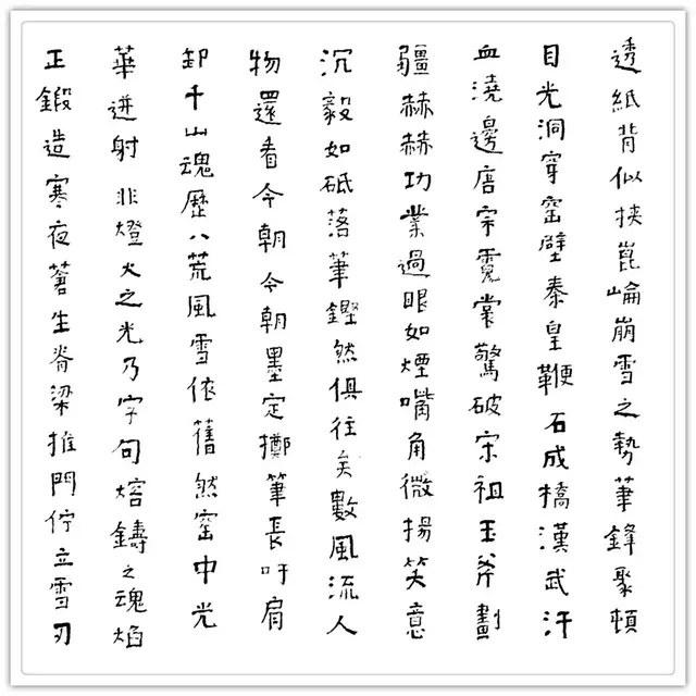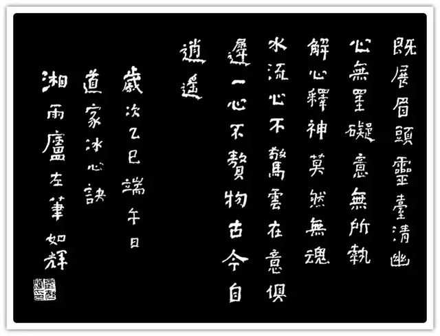 北漂十年,选“欲求工而愈不工,不合常法甚至‘毫无道理’的用笔和结体的《爨宝子碑》”着力,创左手“推、拖、顿、戳、擫五字执笔法”,追求该碑最显著的奇姿异态特征,以颜柳错落的章法,佐以爨宝子古拙、肃穆、天真的内涵,缓行涩进,楷爨互参,不溫不火,写出几分滑稽和幽默。