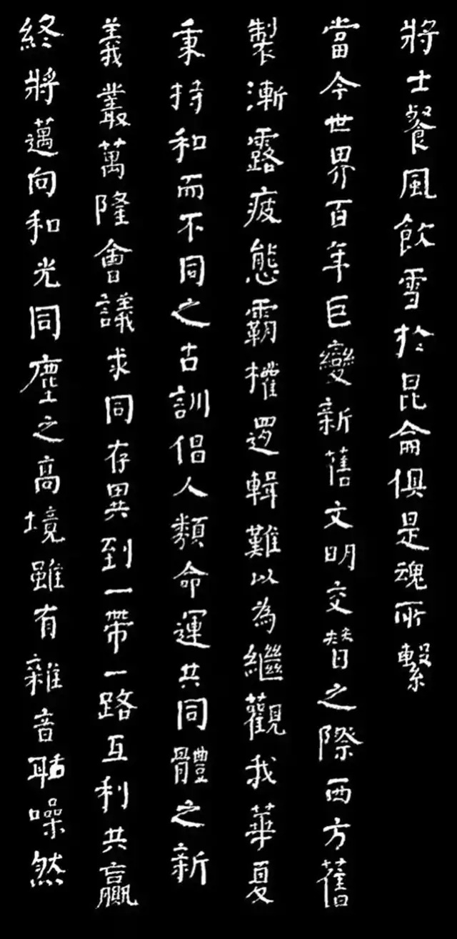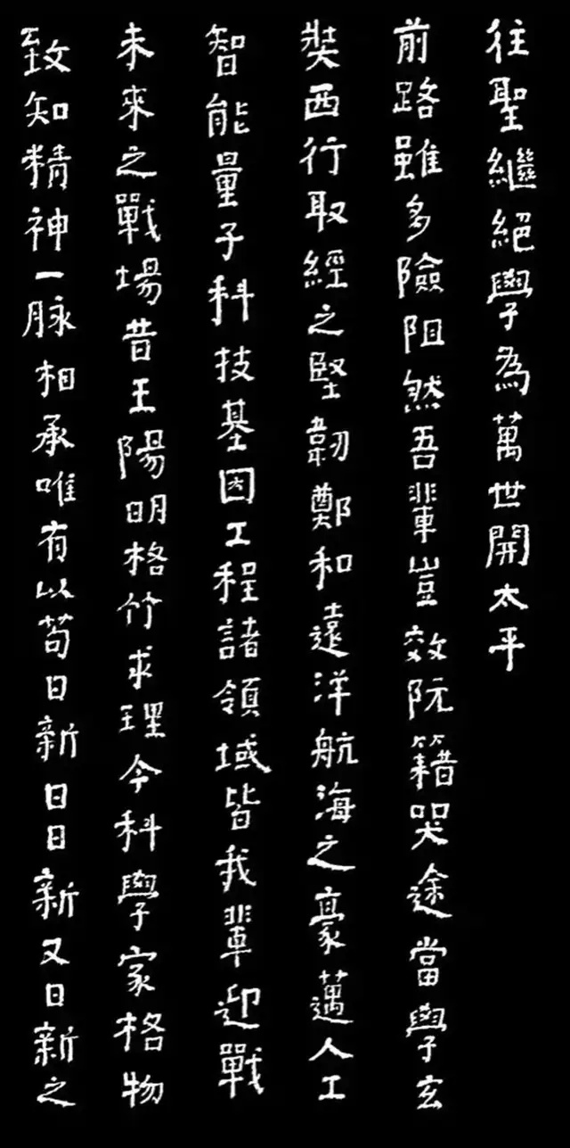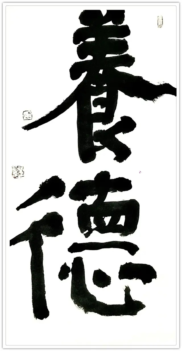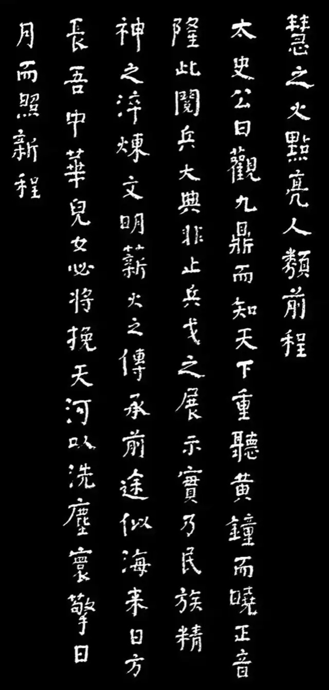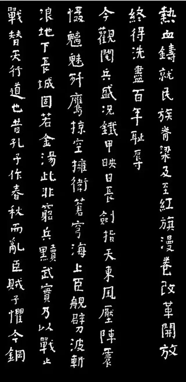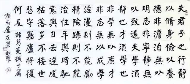 另一副作品,也是如辉在酒埠江灌区即席悬腕书写的爨体《诸葛亮诫子篇》,此作“爨中有颜,颜中有爨”,把颜真卿的宽博宏大与汉隶的朴厚奇态,“若古佛之容”揉合一体,让人不由自主地思接千载,视通万里,回溯起一千五百多年以前,西南边陲少数民族那一段扑朔迷离的历史,情有所动,心亦摇焉。