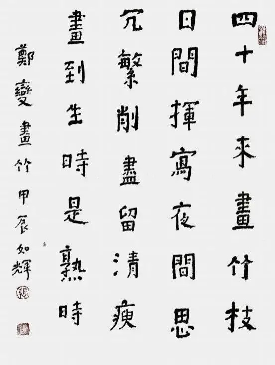 颜体被历代书家视为习楷书的重要范本。而对颜真卿楷书临习多而深、且有自已面目的当数古建宁人张如辉。张如辉,号湘雨庐。幼时玩火致右手残。六岁正逢文革,辍学家中,乃学书画,初习颜柳,后学何,又遍临汉魏碑刻、古玺、帛文,寒冬暑往四十余年,然笔法还是软弱、平板、拘谨…… 如辉恨自己书艺甚浅,五十岁时,遂负笈北游。受高人“费新我何以左笔独步书坛,乃左手更具‘兼顾虚实’优势也”之指点,豁然心胸。