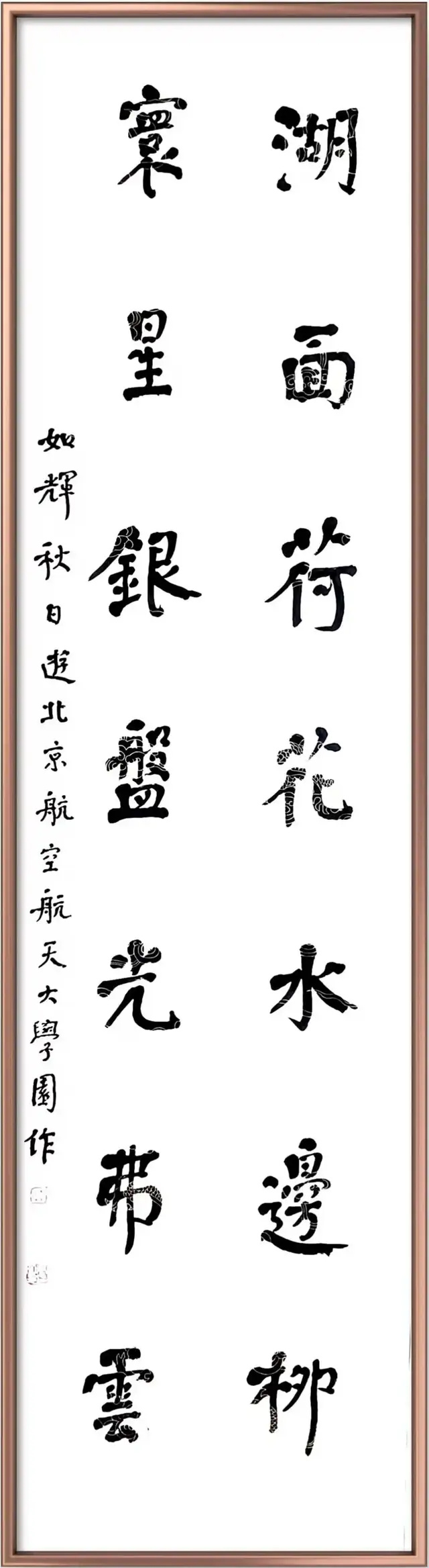 这两副作品,一幅完成于 2021 年 9 月 2 日,即如辉兄用颜楷、八尺宣纸书写的拙文《酒埠江灌区十景》序。书写此卷时,如辉如临大敌,握管时不敢放松一步,九个半钟头如兵戈相接,“一放则气象逋矣!”故作品肉里裹筋,筋里藏肉,骨丰肉润,沉郁顿挫,俯仰有情,已臻化境,而其左笔风格尤具嬗变标志意义。