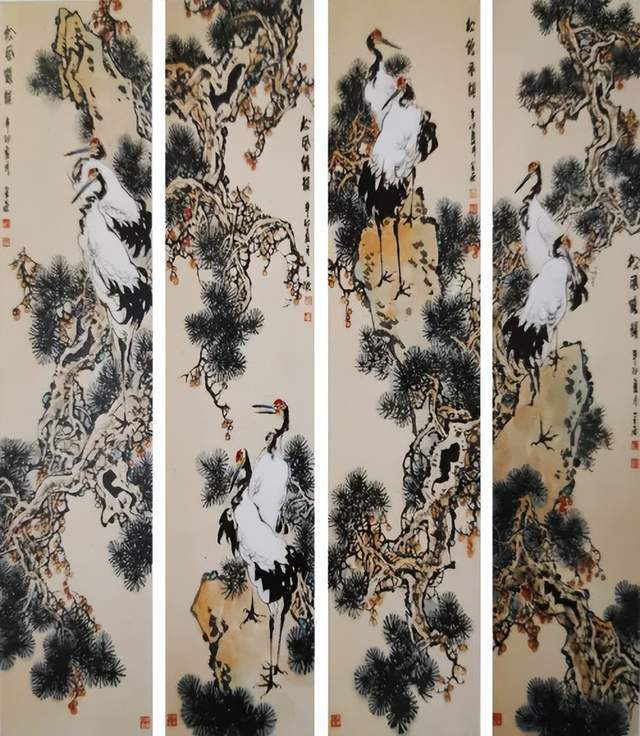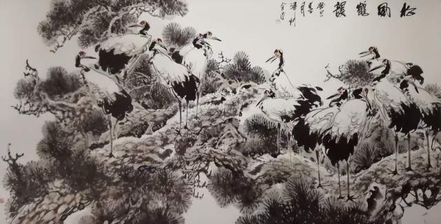 两只仙鹤栖息在松树的主干上,勾画出了人们喜闻乐见的通俗题材-健康长寿,松鹤延年。在造型刻画上,仙鹤神情安定,胜似闲庭信步,给人一种与世无争,泰然处之,安居乐业,幸福美满的感觉。最值得一提的是整个画面线条老辣而又苍润,不出干笔,多以湿笔运行,所以感觉流畅、滋润,有韵律在舞动,你的心情也会随之荡漾。张金荣的国画,可以说是纯文人画。有着丰富的文化内涵,古朴、典雅、厚重、沧桑,饱含丰富的中国古典哲学。