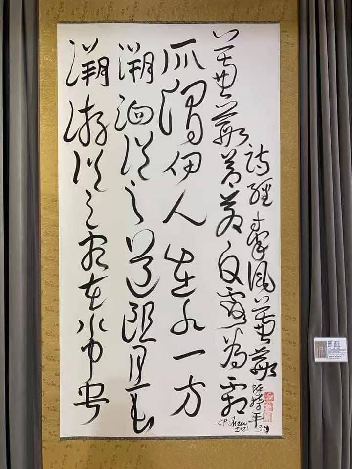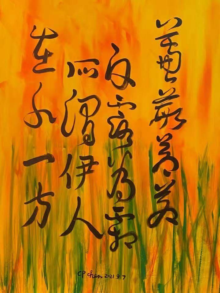 再看那组以《诗经・秦风・蒹葭》为内容的作品,“蒹葭苍苍,白露为霜。所谓伊人,在水一方。溯洄从之,道阻且长。溯游从之,宛在水中央”,诗句本身的朦胧美与追寻意,在陈教授的笔下,或化为书法的飘逸线条,或融入带有芦苇、游鱼等元素的画面中,将那种对美好、对“伊人”的执着追寻,以及其间的曲折与怅惘,细腻地展现出来。而“思亲总在夜深人静时”,也让这些作品多了一层思乡怀人的温情,在艺术之美中,勾起观者心底的情思。