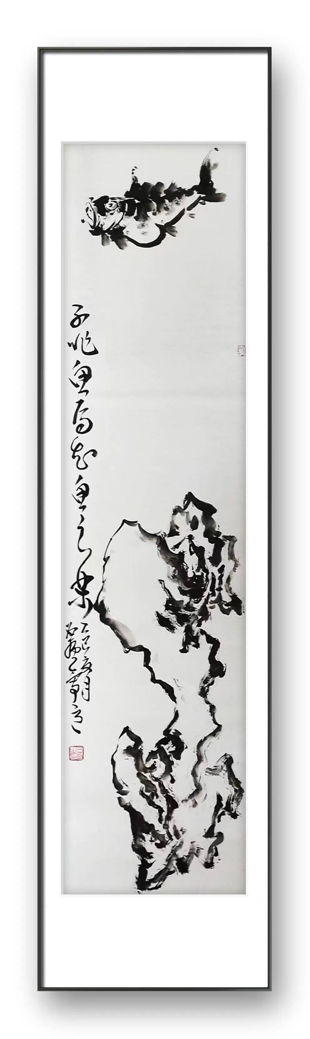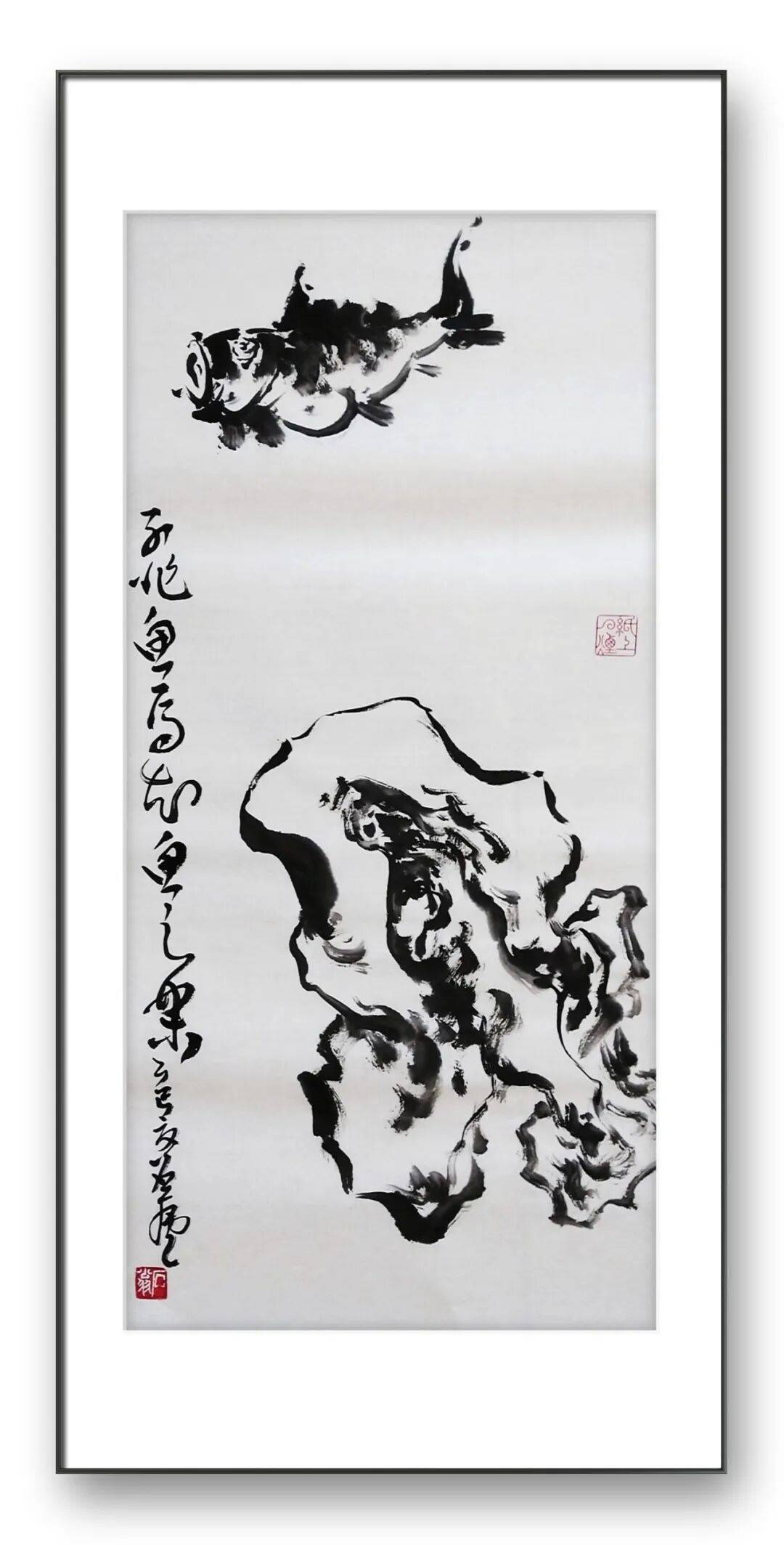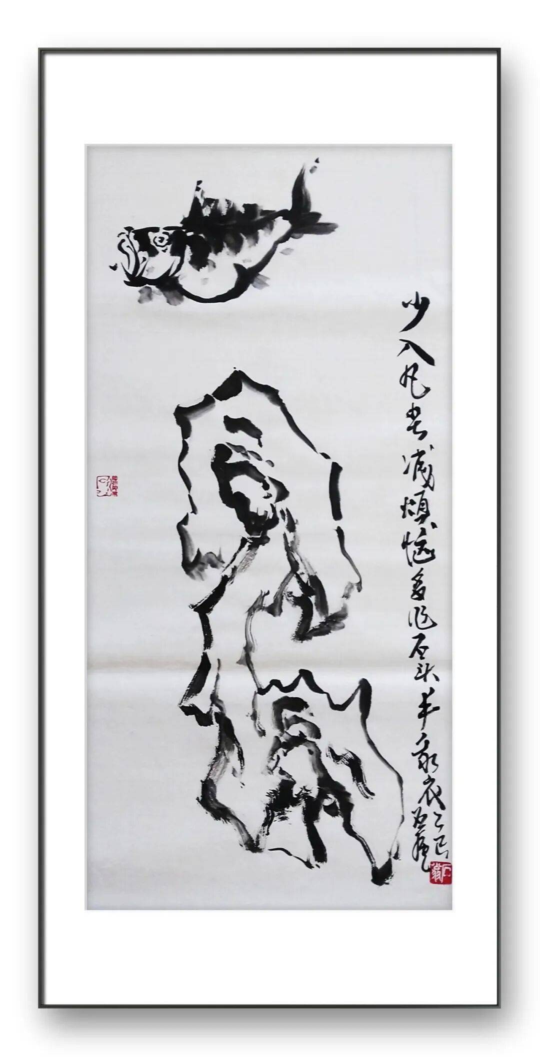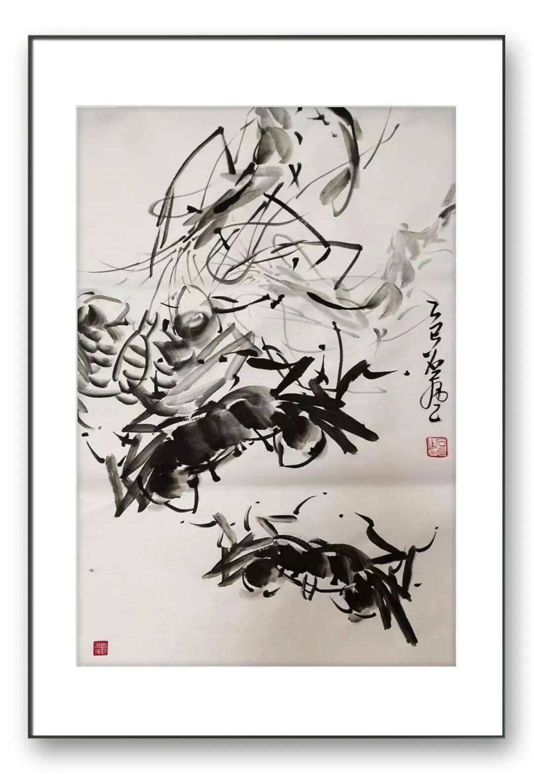 再看其水族题材的作品,如虾蟹、游鱼等,同样充满意趣。画虾时,石庐先生以简洁的线条,勾勒出虾的身躯、鳌足与长须。那虾的肢体,看似随意挥洒,实则精准把握了虾的形态结构,尤其是虾须,柔韧而富有弹性,似在水中悠然摆动,将虾的灵动活泼展现得淋漓尽致。画蟹则着重表现蟹的张牙舞爪之态,墨色的浓淡变化,让蟹壳的坚硬质感与蟹爪的锐利之感呼之欲出,仿佛能看到蟹在水底横行的模样。游鱼的画面,更是生机盎然,鱼的身姿矫健,在水中或游或停,墨色的晕染营造出水流的虚幻感,使鱼仿佛真的在水中自在遨游,给人以鲜活的生命律动之感。这些水族作品,没有过多的色彩渲染,仅以墨色便将水中世界的生机与意趣完美呈现,足见石庐先生对笔墨的掌控力与对生活观察的细致入微。