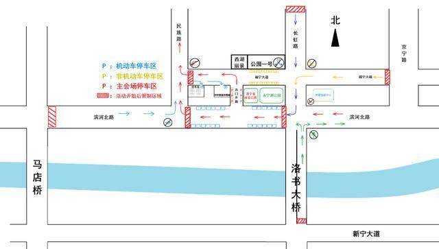 (二)由长虹路北向南、福宁大道东向西、滨河北路东向西、洛书大桥南向北前往会场的车辆可将车辆停放至滨河北路长虹路至民族路段两侧(车头向西停放);由滨河北路西向东前往会场的车辆可将车辆停放至华中贯通农博城停车场内;前往会场的非机动车停至福宁大道长虹路至西门外路段两侧。