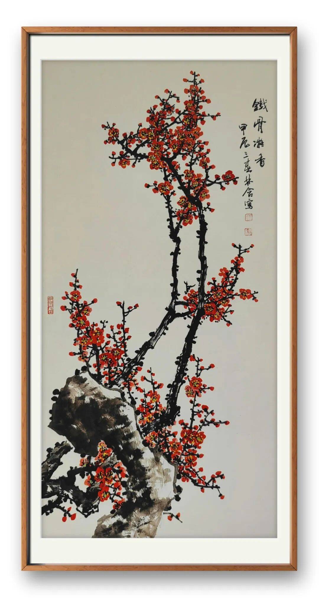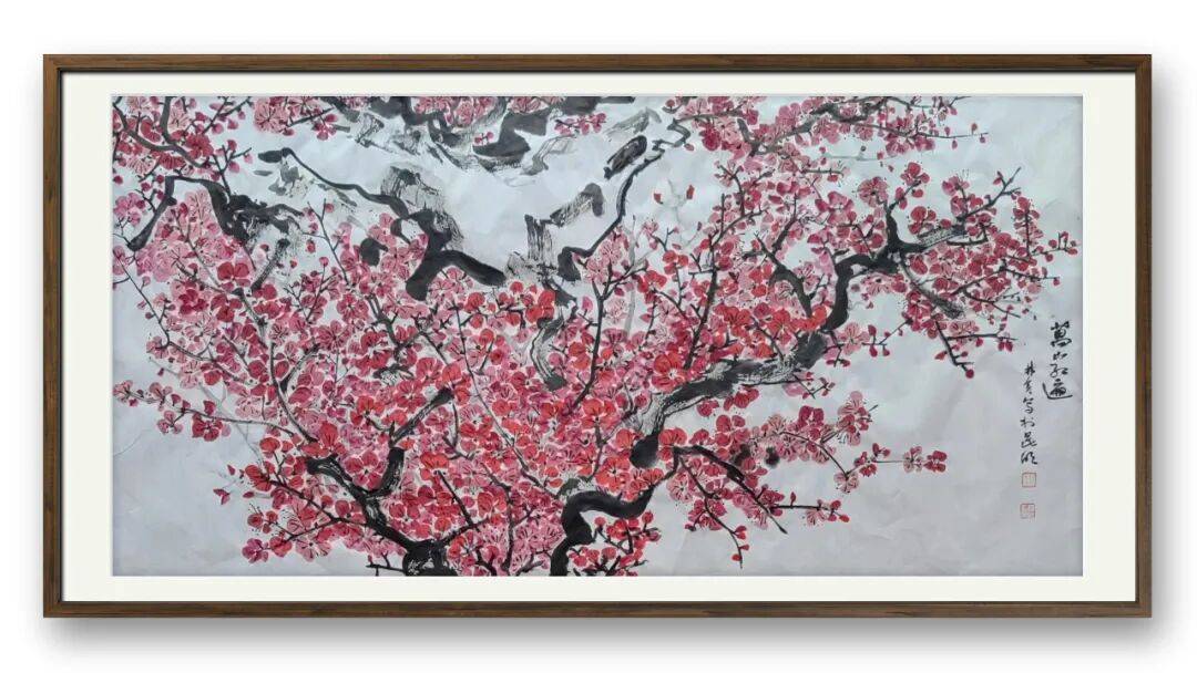 若说山水显老师的开阔胸襟,那梅花便见其高洁品性。老师画梅,不追艳丽之姿,独取清雅之韵。一枝素梅,寥寥数笔,却简练而不单调,花瓣舒展间,似有暗香浮动;一树红梅,墨色与红色交织,丰富而不杂乱,花苞饱满处,尽显生机盎然。无论是墨梅的苍劲、红梅的明艳,还是粉红梅的温婉、黄梅的淡雅,她皆能精准把握每种梅花的特质,笔下梅花,或孤芳自赏,或竞相绽放,皆气韵生动,仿佛从自然中移栽而来,尽得造化之妙。这份对梅花的通透理解,源于她耐得寂寞的心境,在喧嚣尘世中,以笔墨为媒介,借梅花诉说着对纯粹艺术的追求。