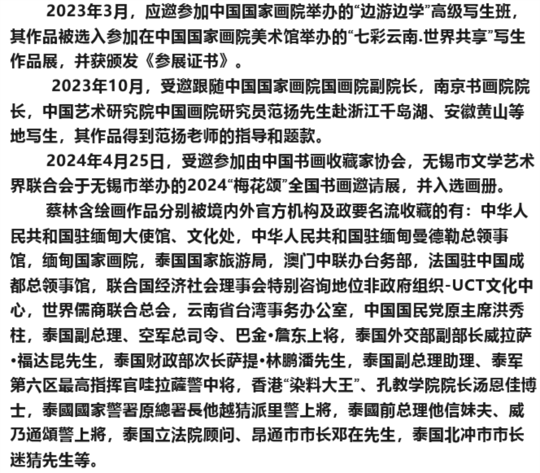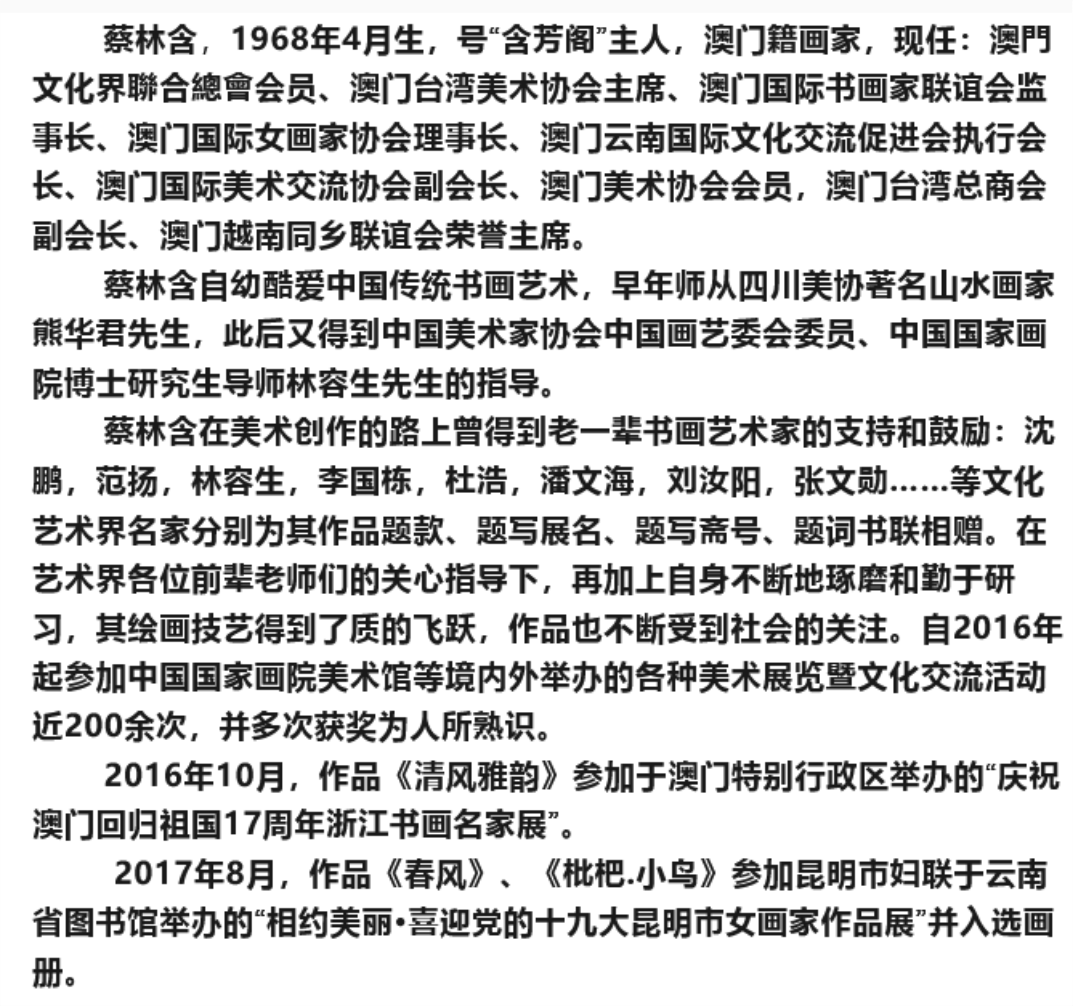 蔡林含老师的书画,无华丽辞藻般的炫技,却以真诚的笔墨、深刻的内涵,在当代画坛留下独特印记。她以笔为媒,以墨为魂,绘山河、染梅竹、画葡萄,每一幅作品都是她艺术追求的缩影,更是值得后人细细品鉴、传承的艺术瑰宝。