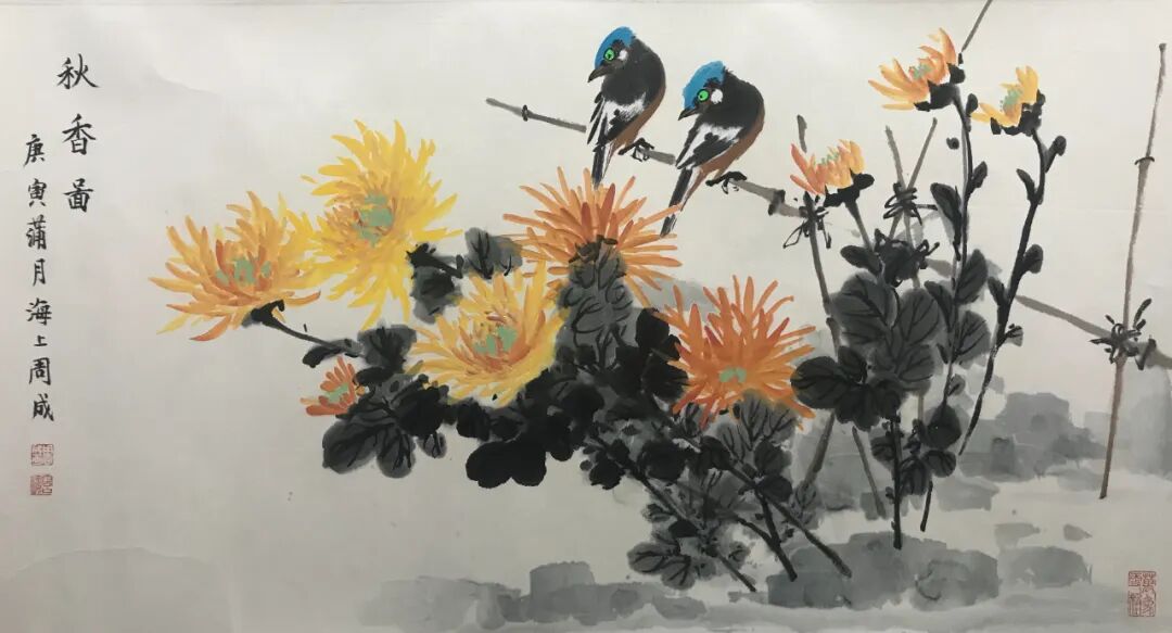 周成(字:新沂)1941年5月出生于江苏省盐城千秋堤秦南农村。祖父周福和带领长大成人。1950年跟晚清最后一位秀才还为政读书。1956年重返上海。1958年进上海宜川中学,童年被校方送进上海福利会少年宫国画组,随江寒汀、唐云、乔木先生学习中国画。在校三年曾连获上海市国画比赛第一名。1961年入伍在31军93师政治部(总参26中队)。1968年到上海招商局,1984年被调进上海海运局工会。1962年在部队时经秦征、吴耘、哈琼文介绍被中国著名山水画家魏紫熙先生为师专攻中国山水画及研究中国画理论。回到上海后又受到艺术大师刘海粟,谢稚柳,唐云先生的指导,同时与谢之光交上朋友,先后又受到王个移、黄幻吾、吴青霞、苏渊雷等先生的青睐。尤其在1979年9月陆俨少先生把我叫到杭州的浙江美院,告诫我:“艺术精益求精,好好努力,要做一个上海山水画的承前启后之人。”1984年春三月,钱松岩、宋文治、亚明、魏紫熙、武中奇等从日本开完画展回国在上海大厦见了面,相识后对我开拓山水画的艺术境界起到了关键作用,推动了本人艺术造旨更上一层楼,于是遍历祖国名山大川,从中国的黑山白水到西北的天山南北,从长江源头到黄河壶口,从东海的千岛舟山到茫茫雪原的昆仑山,无处不留下我的探艺足迹。山河之美打开了过去封闭的眼界,祖国之大,放大了容纳在脑海中的艺术意境。祖国人文的丰富历史填补了自己贫瘠的脑袋。于是汉赋、诗经、唐诗、宋词、明清古怪文学,充实了自己空虚的记忆。向艺术高峰攀登永无止境。初出江湖,身强力壮,争强好胜。乔木先生曾再三告诫:“为人当老实,出笔不让人。”于是在艺术道路上由点到面,积少成多,聚沙成塔,使艺途越走越宽。由底向高,由下里巴人向白雪阳春攀登,走遍河山,山河近,踏遍高山,我成峰。路漫漫兮,踏坷而行。野苍苍兮,宇宙洪荒,求艺终身兮,始于足下。