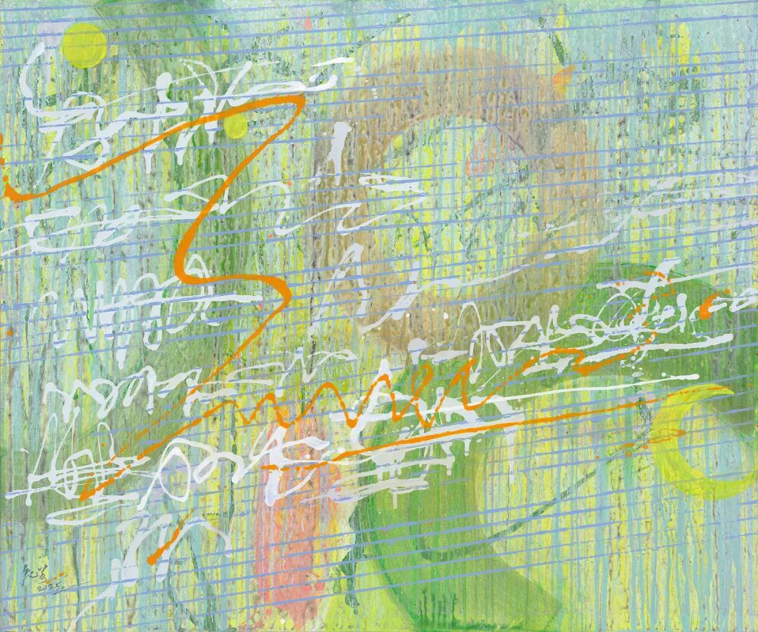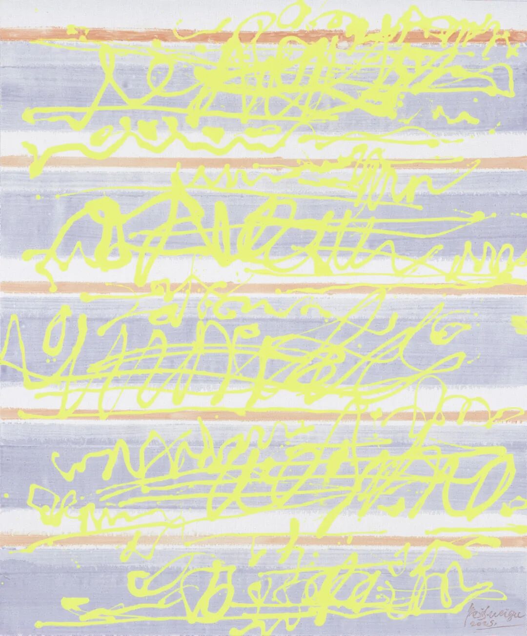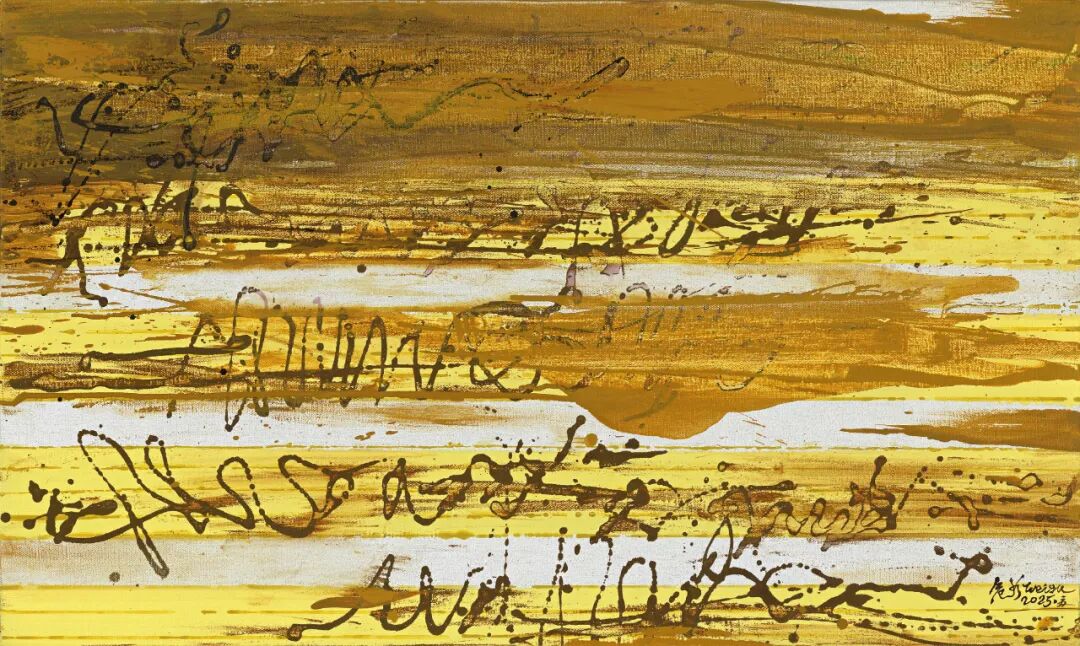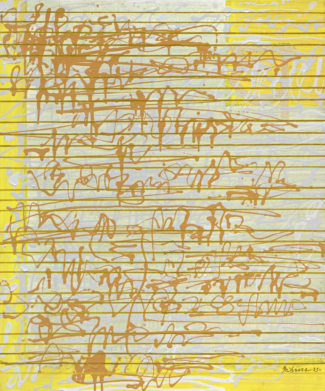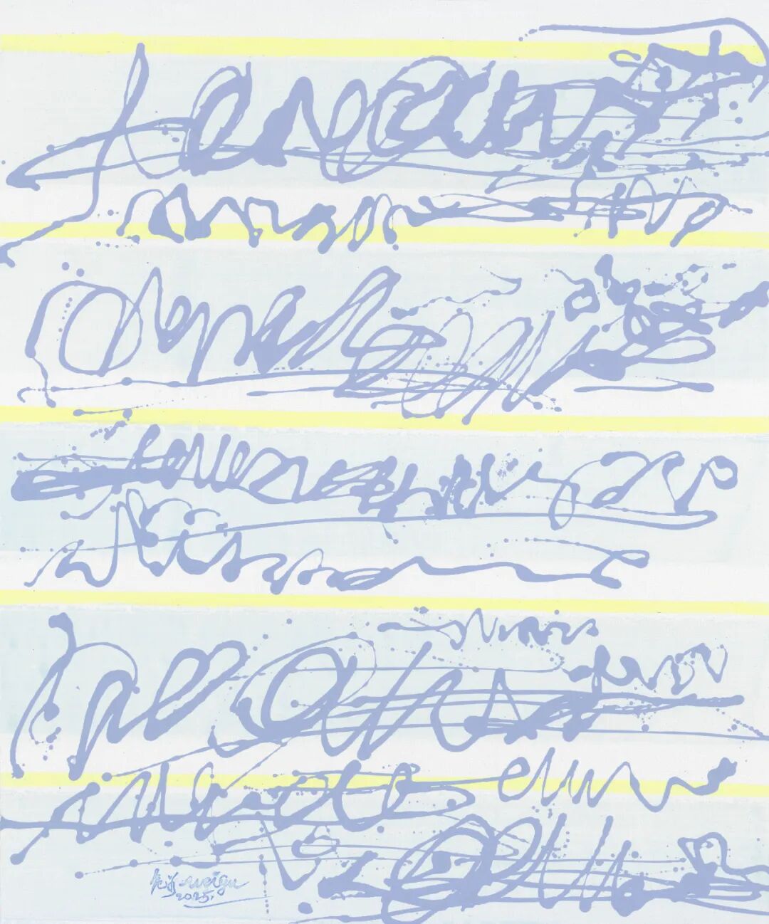 从创作谱系来看,四个系列呈现出清晰的演进逻辑。《脉动》系列以自动书写为主要特征,那些不可辨认的拟态“草书”、乐谱和涂鸦,既是对书写本体的质询,也是对数字时代信息混沌的隐喻。在《脉动.祷文》中,明晰的几何框架与任性的书写相互碰撞,形成了“证实”与“证伪”的谐趣和辩证诘问。这种控制与失控的制衡,恰如其分地印证了德勒兹的"块茎"理论——秩序与混沌并非对立,而是相互生成的动态系统。《脉动.舞》则通过涂鸦符号与波普色彩的并置,实现了对书写权威的幽默解构,这种反书写策略既延续了达达主义的批判精神,又指涉了当代数字文化的意涵。深入辨识可以发现,聂危谷倾注于具身书写过程中痛快淋漓的痕迹表达之底层,则是其书写语言与符号对于深层无意识的发掘与反本质主义的突进。