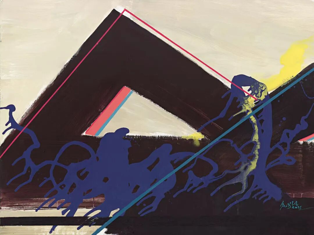 《冥想》系列则转向宇宙尺度的符号探索。极简主义的建筑元素、彩虹、星链和星座等意象,构建起独特的宇宙语法。在《冥想·三角体》中,稳定的几何形态与泼溅的有机形相互映衬,其视觉张力隐喻了微观世界与宏观宇宙的结构同源性。三角形在宇宙结构中具有普遍性——晶体生长、星系螺旋、量子纠缠矩阵,皆呈三角几何。从落笔的瞬间性到宇宙的光年尺度,时间以多维方式被折叠在画面之中。