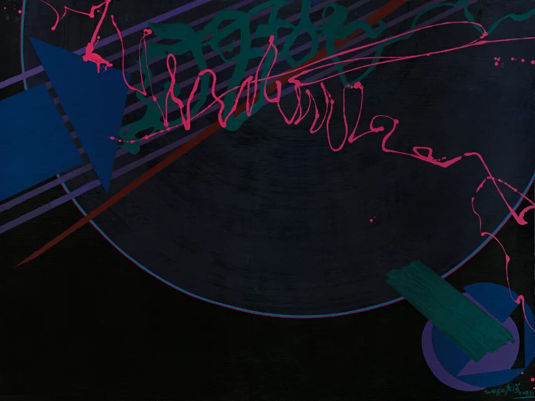 《秘境》系列将书写性拓展至自然维度,那些表现深海、深山、迷雾、黑夜等神秘境界的意象,实则成为自然的"元书写"。作品《秘境·熵》,深暗画面中倒置的规则半圆与跌宕跳跃的色线形成微妙惬意的对话,这种视觉结构既涵容着宇宙的几何秩序,又点睛了自然界的有机特性。从现象学视角看,此类作品呼应了梅洛-庞蒂的知觉理论,指涉"真实"存在于视觉与触觉、秩序与混沌的裂隙之中。