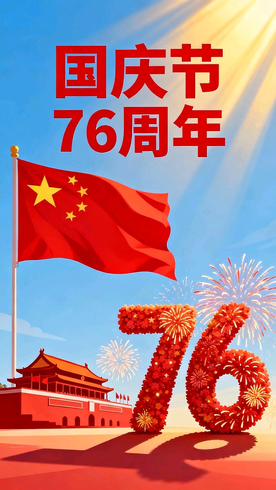 乙巳国庆,岁在七十六载。天安门广场,红旗如海,花团锦簇。阅兵方阵,步伐铿锵,铁甲洪流,威声动天。战机列阵,划破长空,彩烟绚丽,映日成霞。群众游行,载歌载舞,彩车巡展,展各地风情。夜放烟花,光耀九霄,“人民万岁”,响彻云汉。