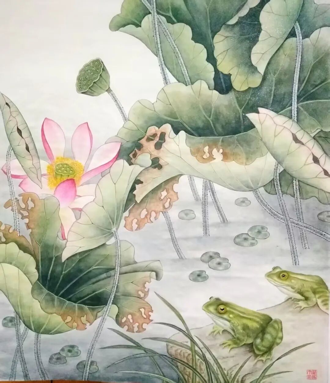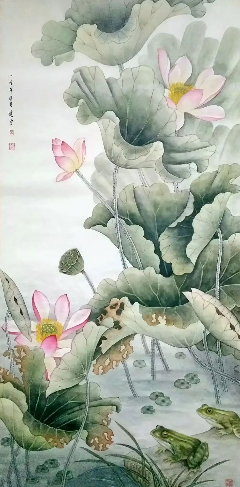 观其《莲花图》,那默然绽放的莲花,以其圣洁的花瓣和明亮的黄色花蕊,尽显其“出淤泥而不染”的高贵之美。吴道宁运用其精湛的着笔技艺,精心勾勒出莲花每一片花瓣的纹理;那层叠交错的花瓣,栩栩如生,让人仿佛能触摸到其被清露打湿的质感,那莲花恰似正在微风轻拂中轻轻摇曳,散发出一股淡淡的幽香,令观者不由自主地沉浸在这份宁静与祥和之中。
