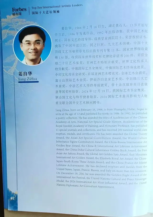 十五种职业,十五种经历,十五种思维,拜生活为师,拜人民为师。日日与时间赛跑,常熬一锅稀饭用三餐。为支撑丈夫的文学书法事业,妻退休后,大年三十都不回家,日日在外打两份工。世间先有伯乐,随后才有千里马。若无伯乐,即便是千里马也成了百里马,十里马,甚至沦为了躺平之马。现今摘取了中国开派巨匠、国之巨匠、九大艺术领袖、中国十大顶文艺领袖勋章。出版专刊专辑11本,国家世界级珍藏册139部,捧回国际奖杯15座。曾含泪放弃与李白汇编成集,诗歌已与萨士比亚,普希金,泰戈尔,苏东坡,旦丁,达芬奇,米开朗基罗等中外名家荣登大雅之堂。书法作品入编《巴黎奥运艺术展》,《中美英馆藏珍品》,《世界顶级收藏》册中。共和国红色巨匠