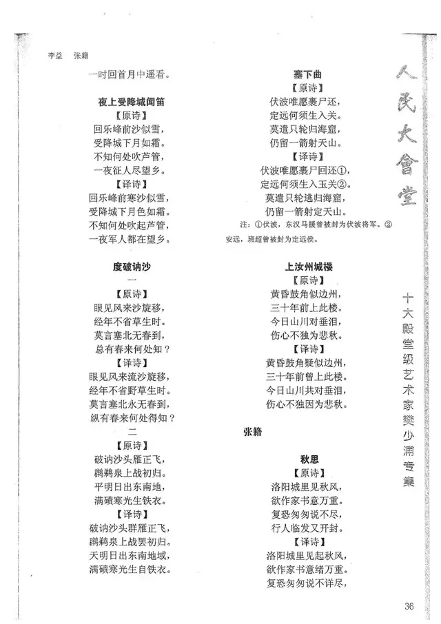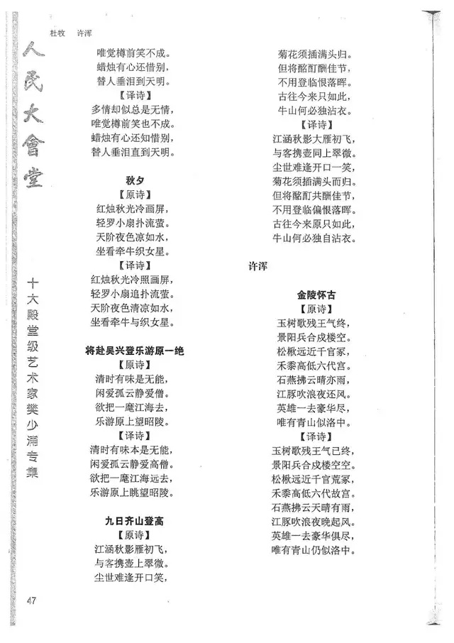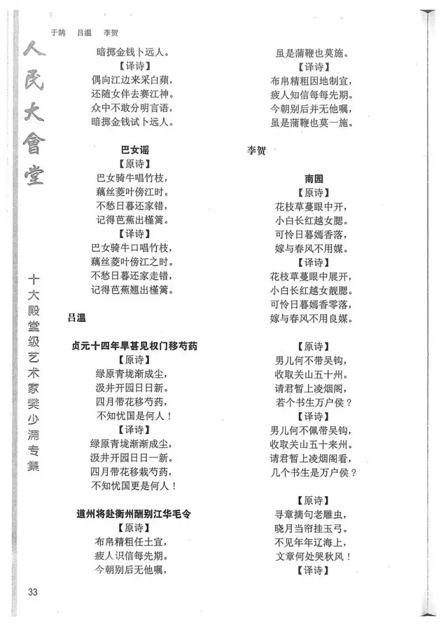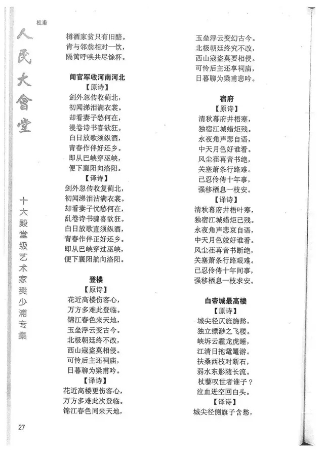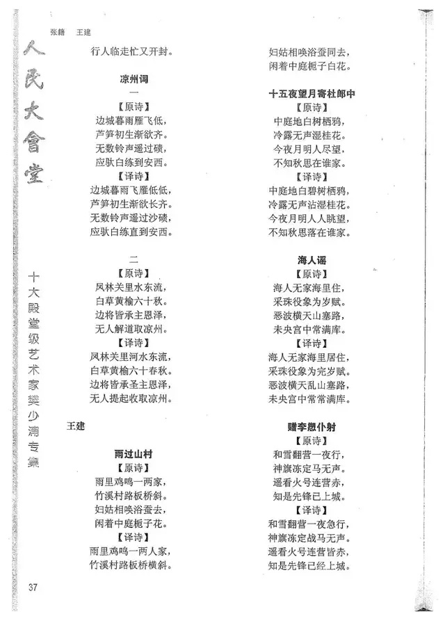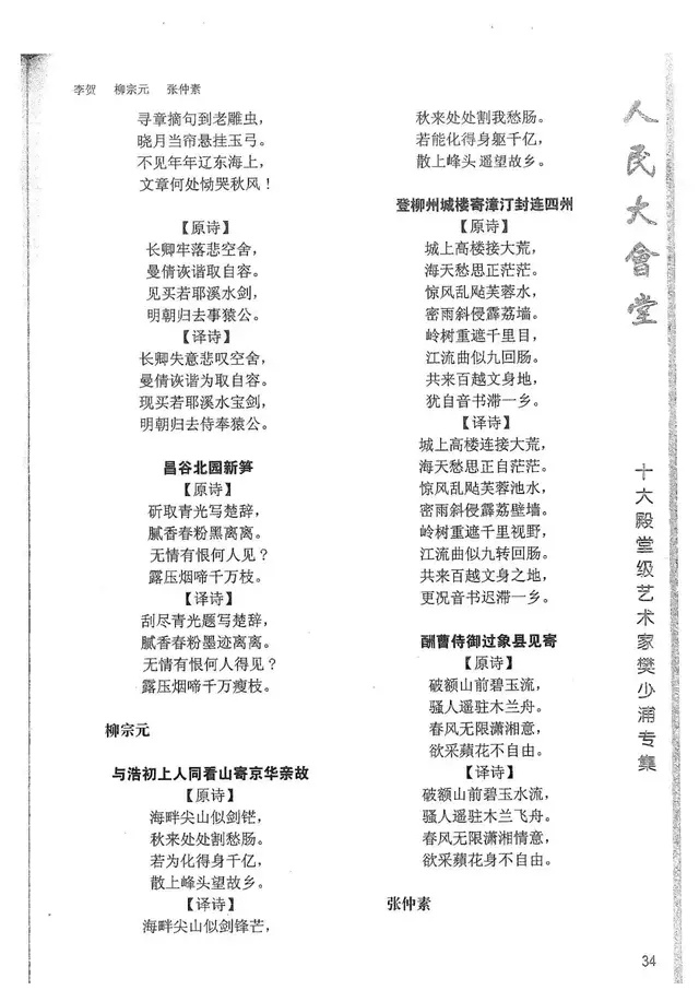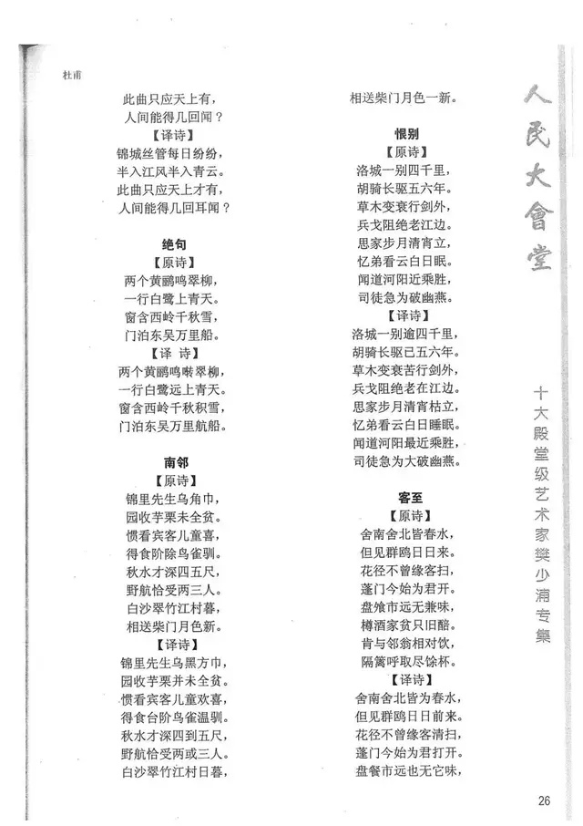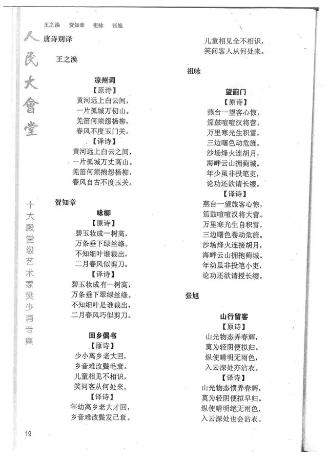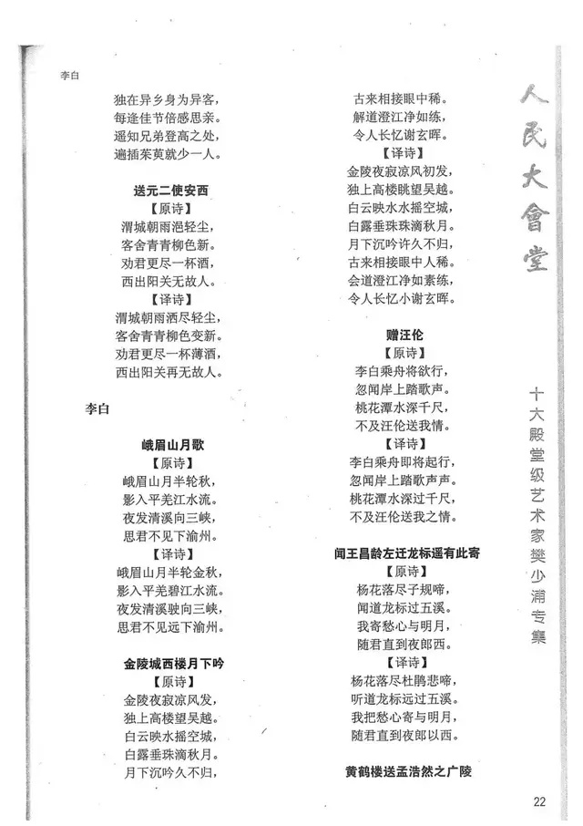 樊少浦《唐诗别译》(修订版)的显著特点在于:传"真”与变"新”的合谐统一。即既尊重原作,最大限度地保畄其原始经典形态,又以自创的八言律丶绝为载体,注入新的时代元素,从而打造古典诗歌的当代版。