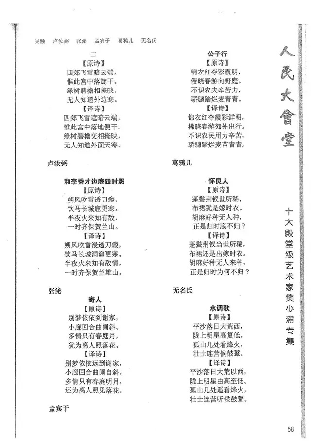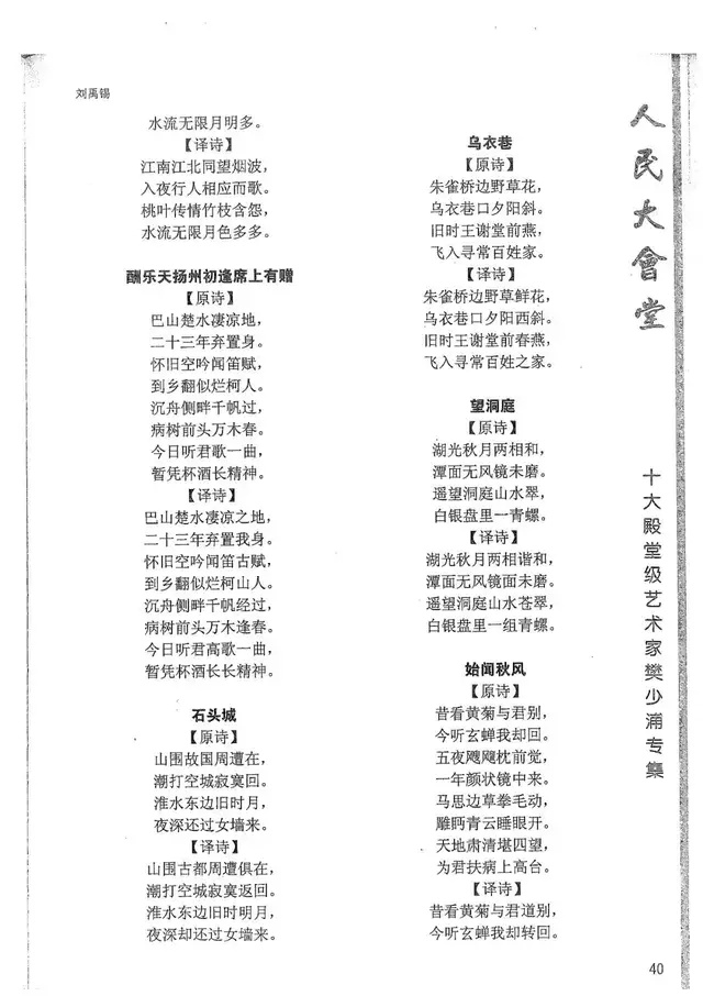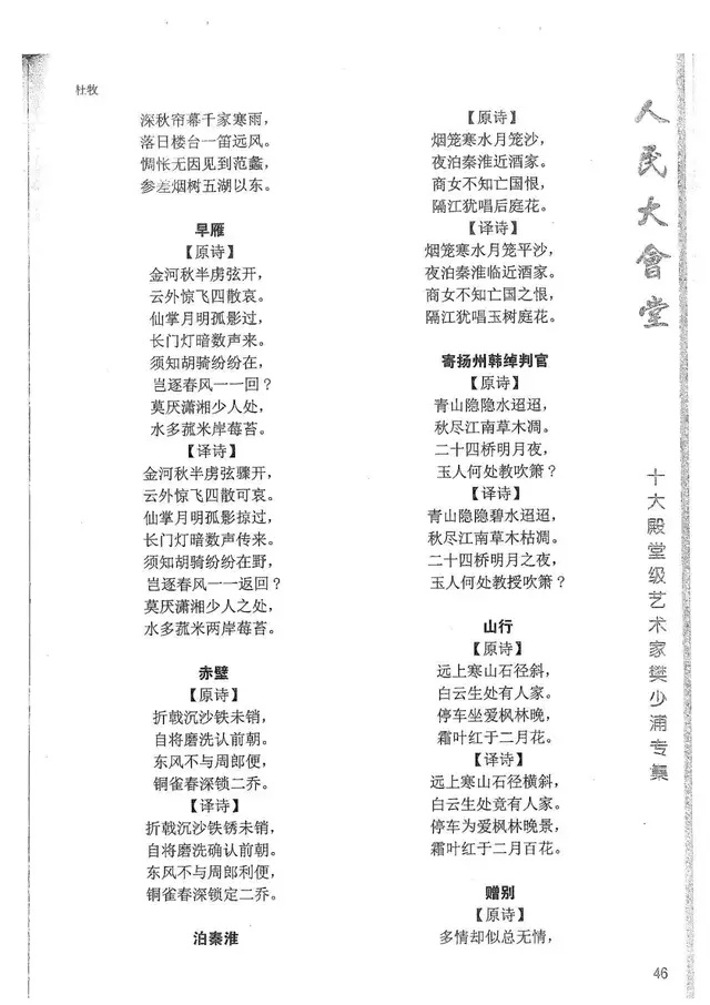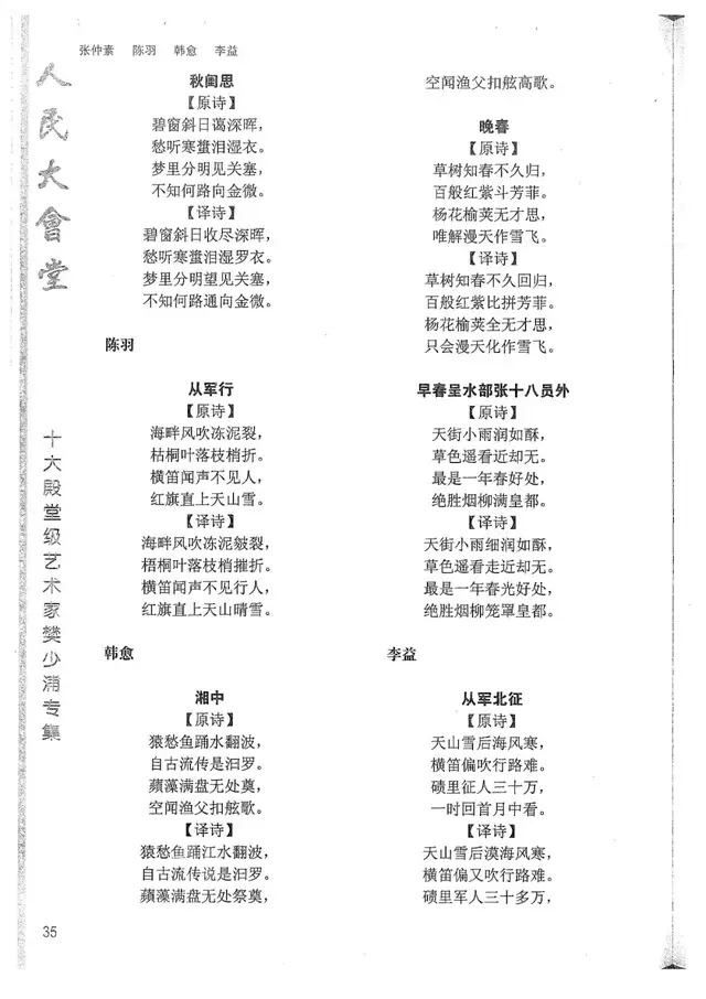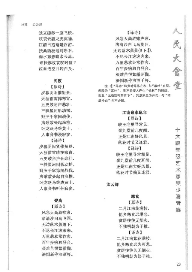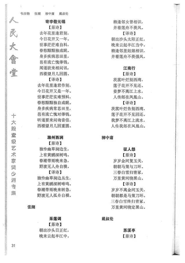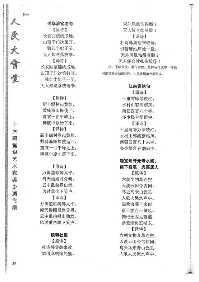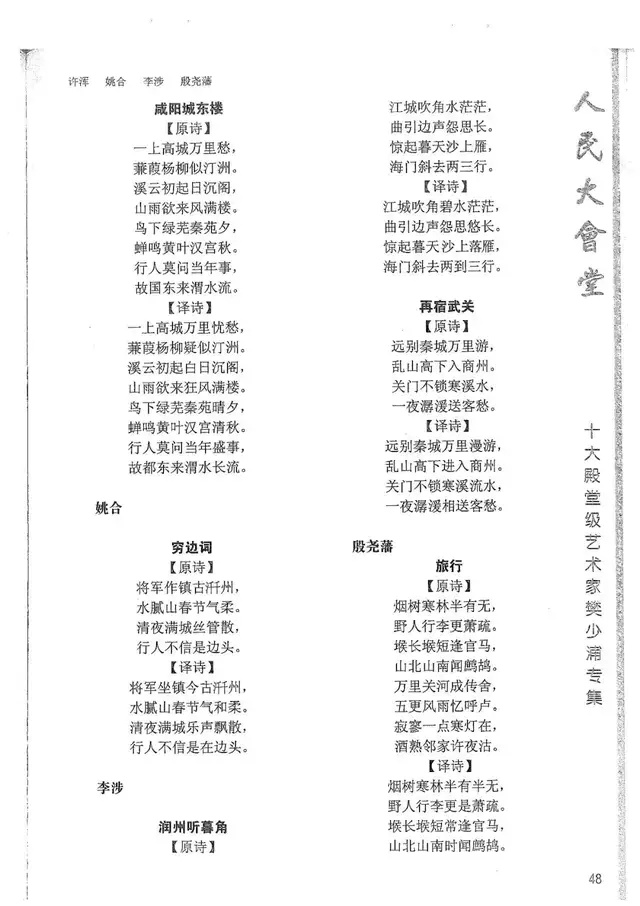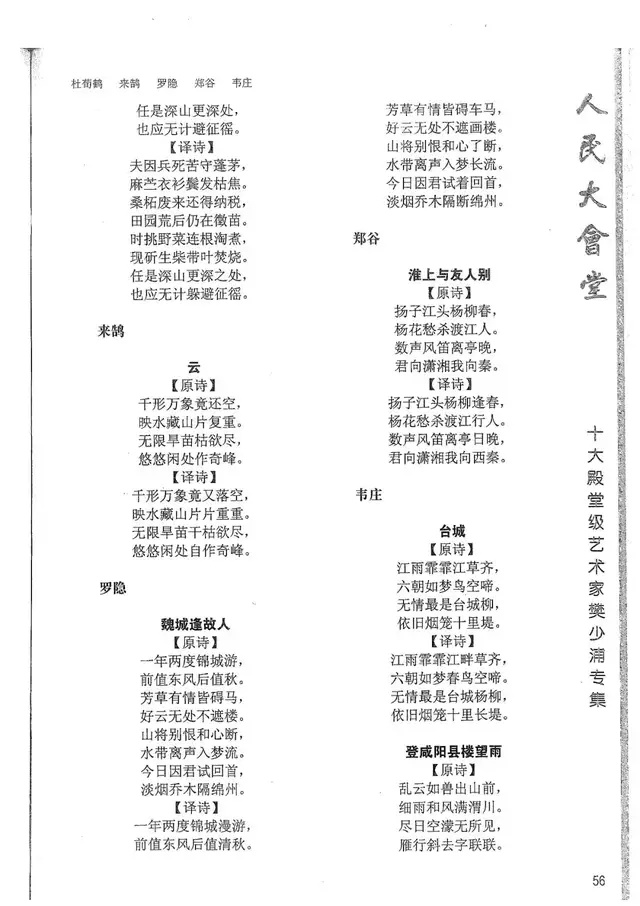 樊少浦《唐诗别译》(修订版)的显著特点在于:传"真”与变"新”的合谐统一。即既尊重原作,最大限度地保畄其原始经典形态,又以自创的八言律丶绝为载体,注入新的时代元素,从而打造古典诗歌的当代版。