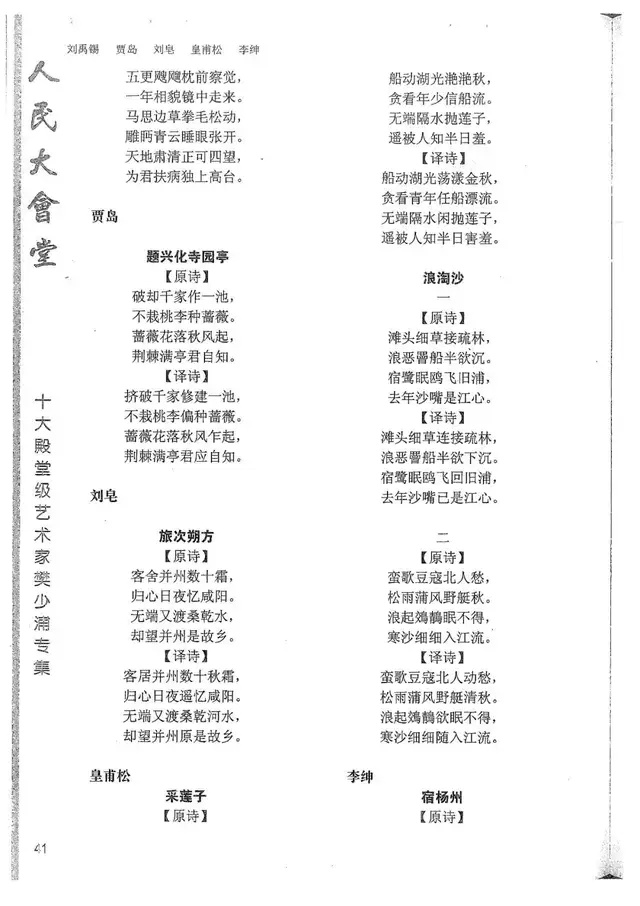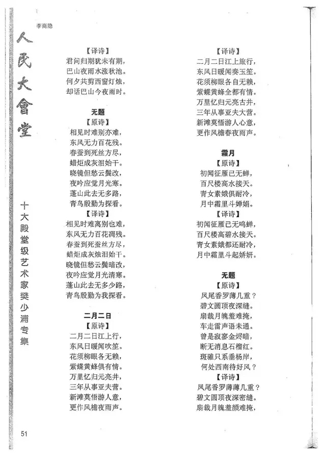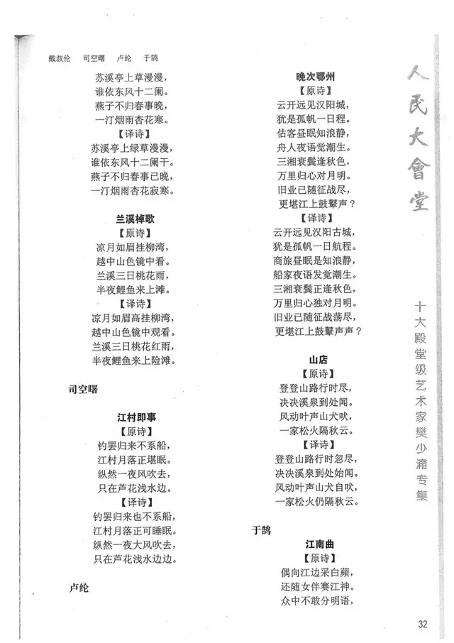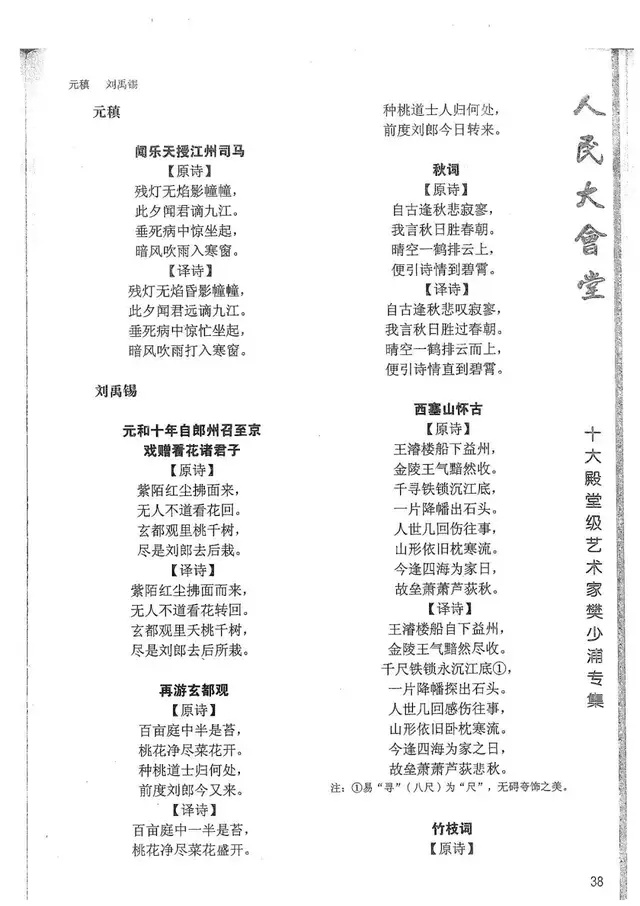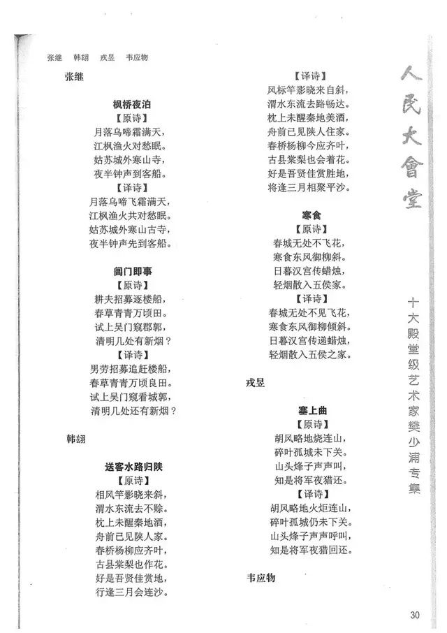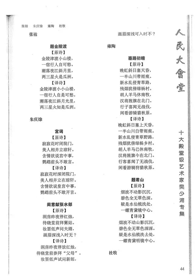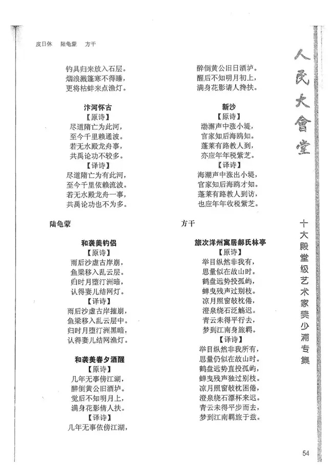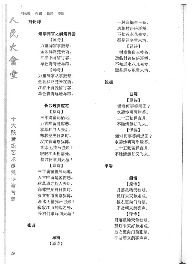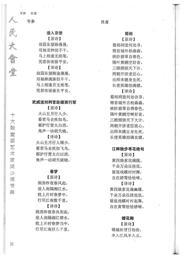 樊少浦《唐诗别译》(修订版)的显著特点在于:传"真”与变"新”的合谐统一。即既尊重原作,最大限度地保畄其原始经典形态,又以自创的八言律丶绝为载体,注入新的时代元素,从而打造古典诗歌的当代版。
