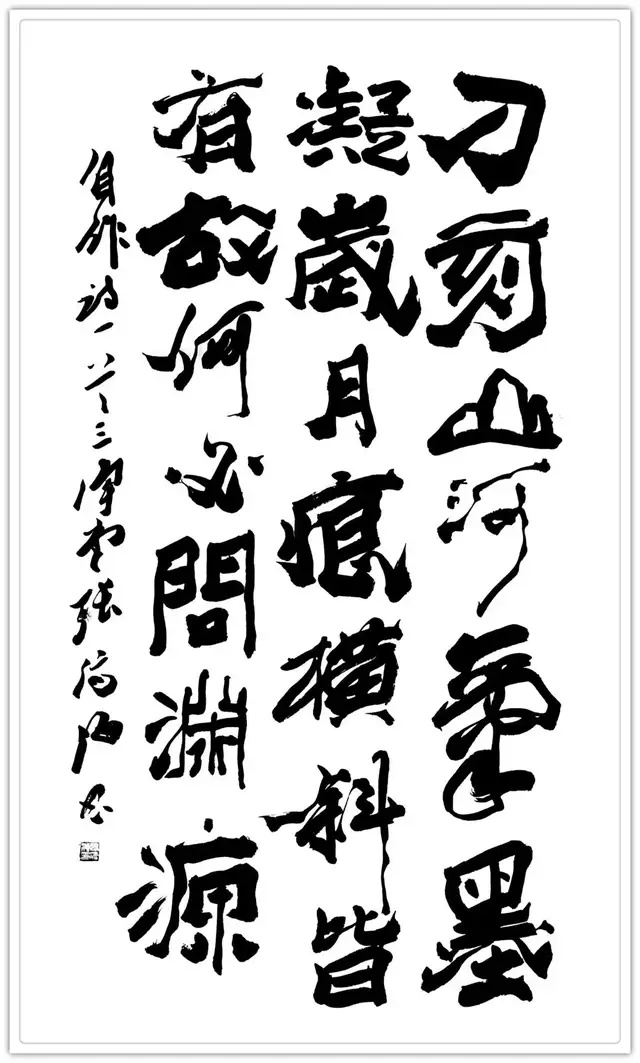 “爨八体”的史价值,首先在于对传统碑学的创造性转化。汉魏“二爨”碑刻——《爨宝子碑》的朴茂古拙与《爨龙颜碑》的雄强奇崛,历来是碑学研究的经典范本,但因其隶楷过渡的特殊性,鲜有书家能将其融会贯通。张济海数十年沉潜其中,不仅吃透了碑刻中“刀劈斧凿”的金石气,更突破性地将“二王”体系的帖学灵动融入其中。他笔下的横画如剑刃劈山,藏锋蓄力;竖笔似古柏擎天,震颤含劲,既保留了魏晋碑刻的高古之气,又注入了现代审美的张力,使千年碑学在当代焕发新生。这种创新绝非凭空臆造,而是建立在对传统深度解构与重组之上的艺术重构,恰如唐人以“颜体”“柳体”活化楷书,张济海以“爨八体”为碑学延续了生命力。