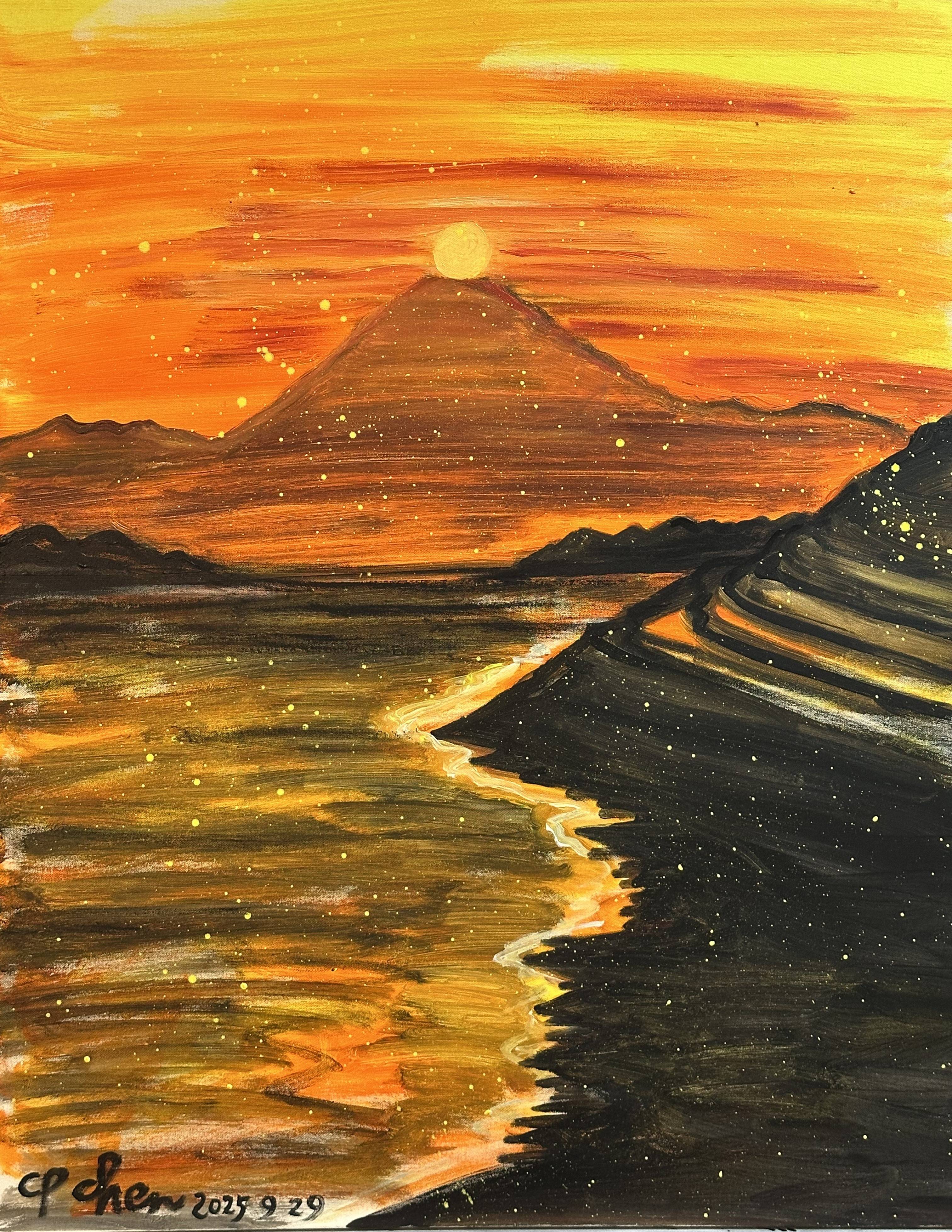 另一幅作品则满是“空寂”之美,落日熔金,山峦层叠,长河蜿蜒,天地间仿佛只剩光影流转,在绚烂的橙黄色调中,营造出一种辽阔又静谧的空寂感,让观者于画面中可寻得内心的宁静与悠远。