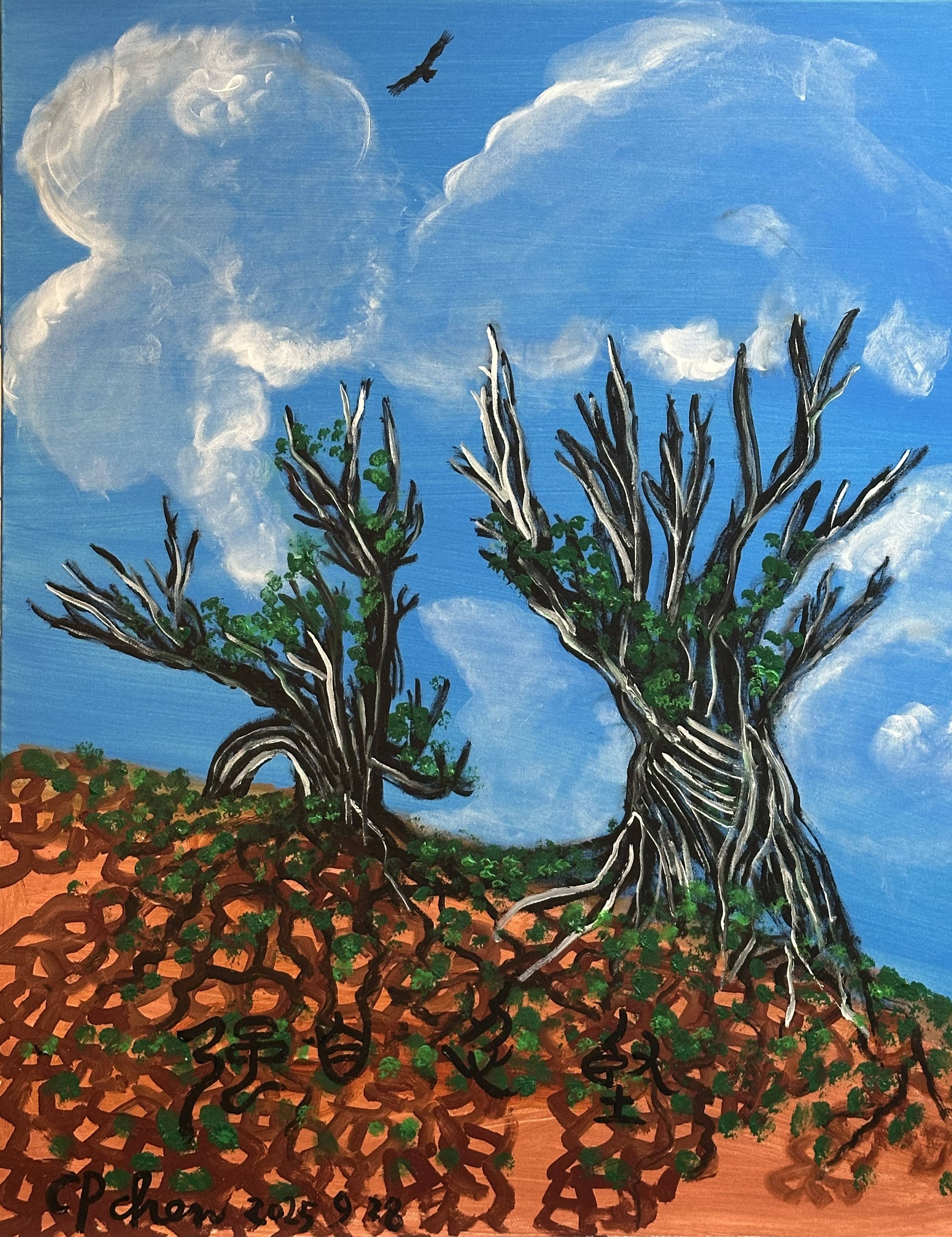 《坚忍自强》一作,枯树于红土之上倔强生长,枝干虬曲却有新绿点缀,苍鹰在蓝天翱翔,既显生命在逆境中的坚韧不屈,又传递出奋发自强的精神力量,将生命的倔强与抗争具象化。