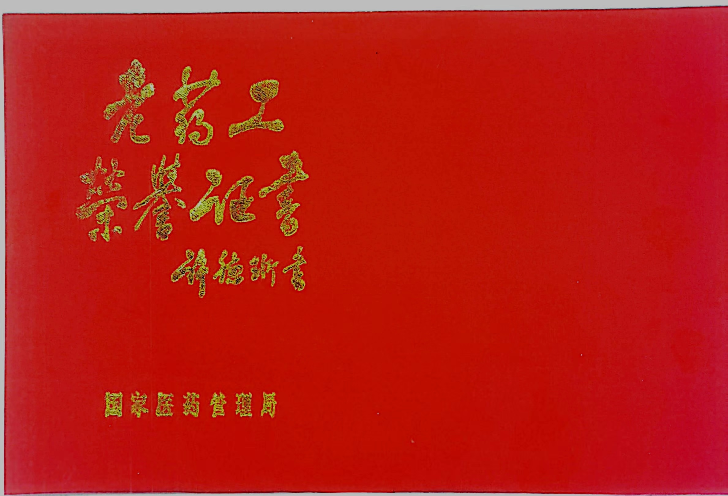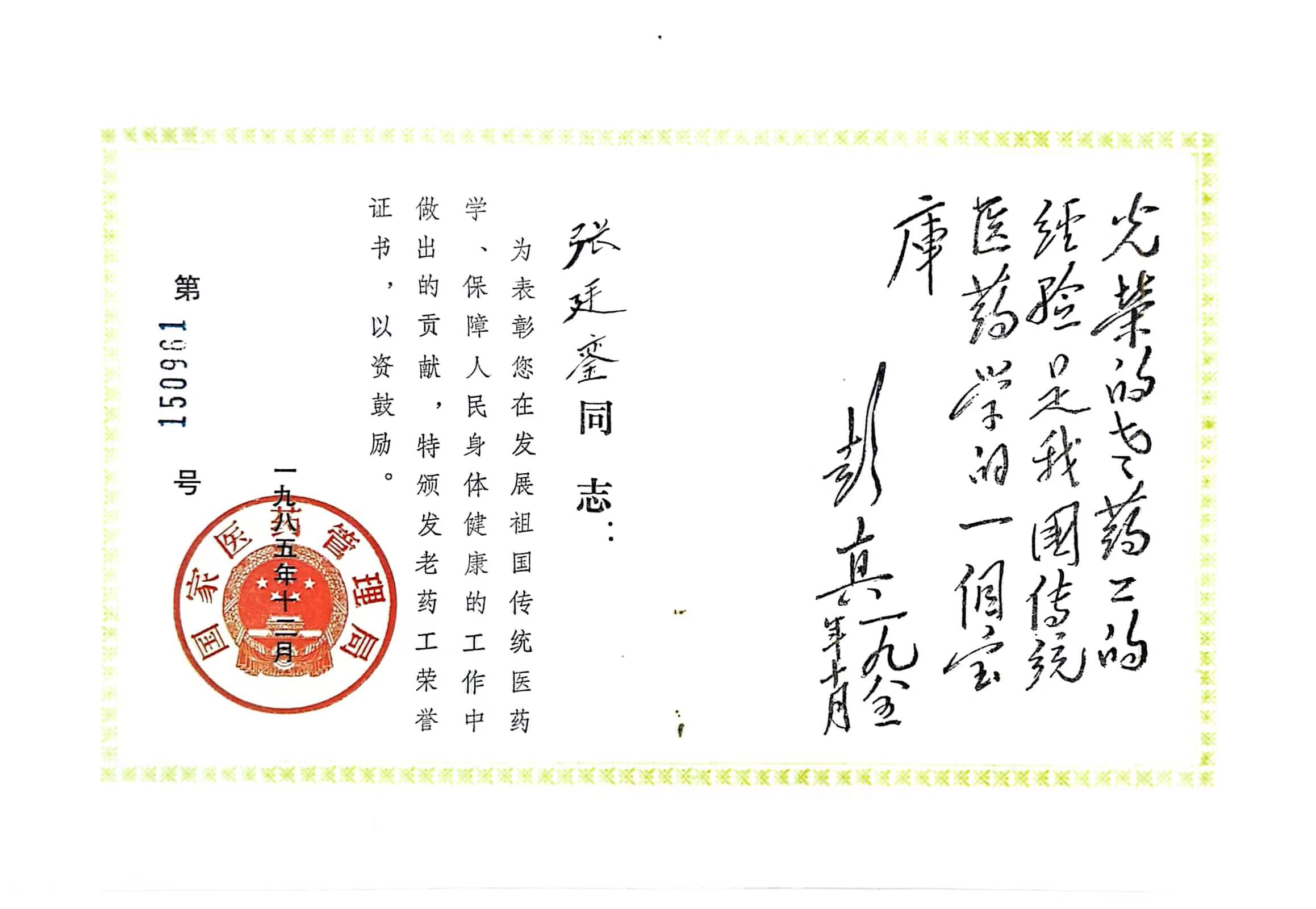 张廷銮老人获得国务院时任副总理彭真同志题词、国家医药管理局颁发的 “老药工”荣誉证书。