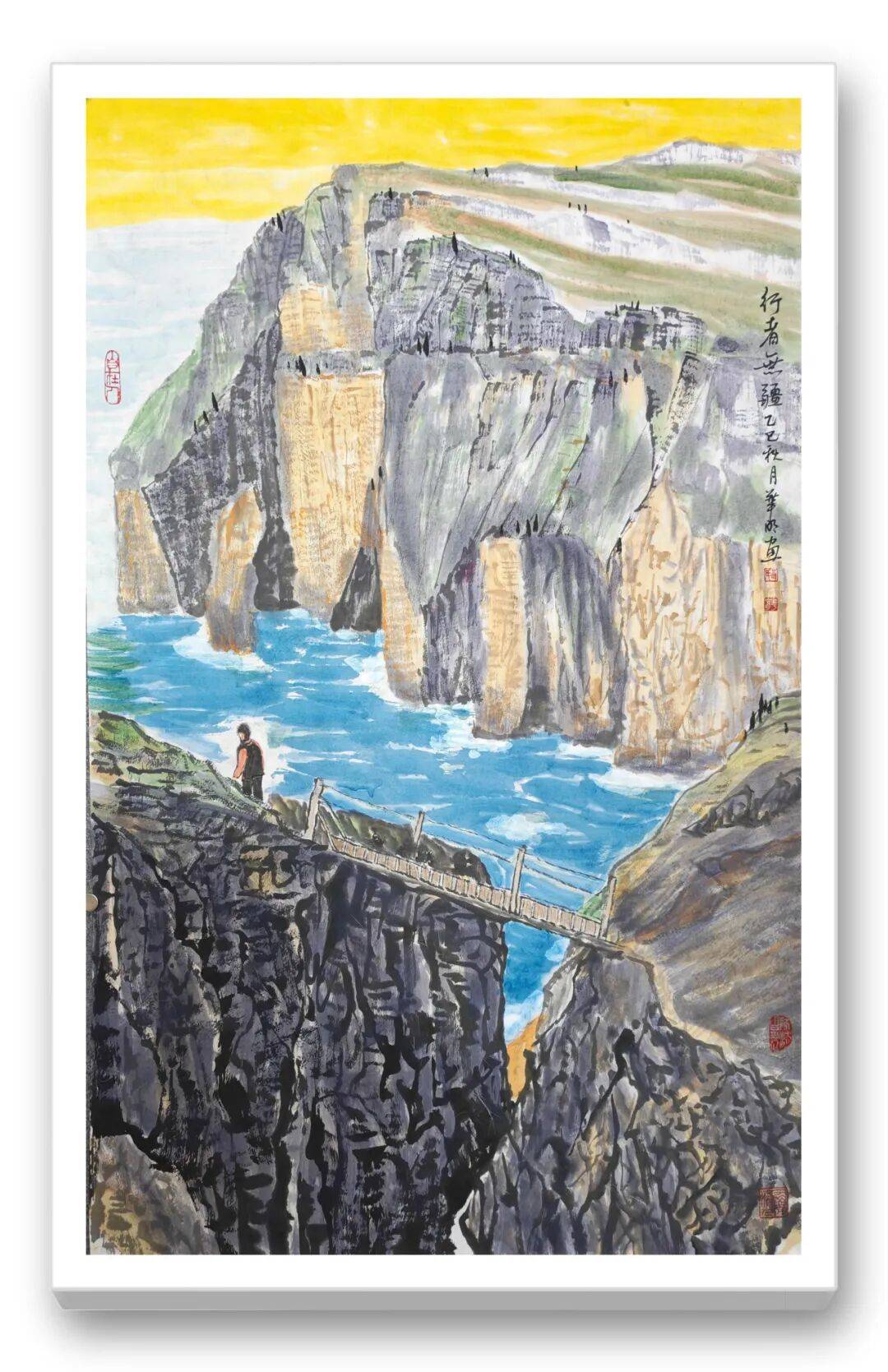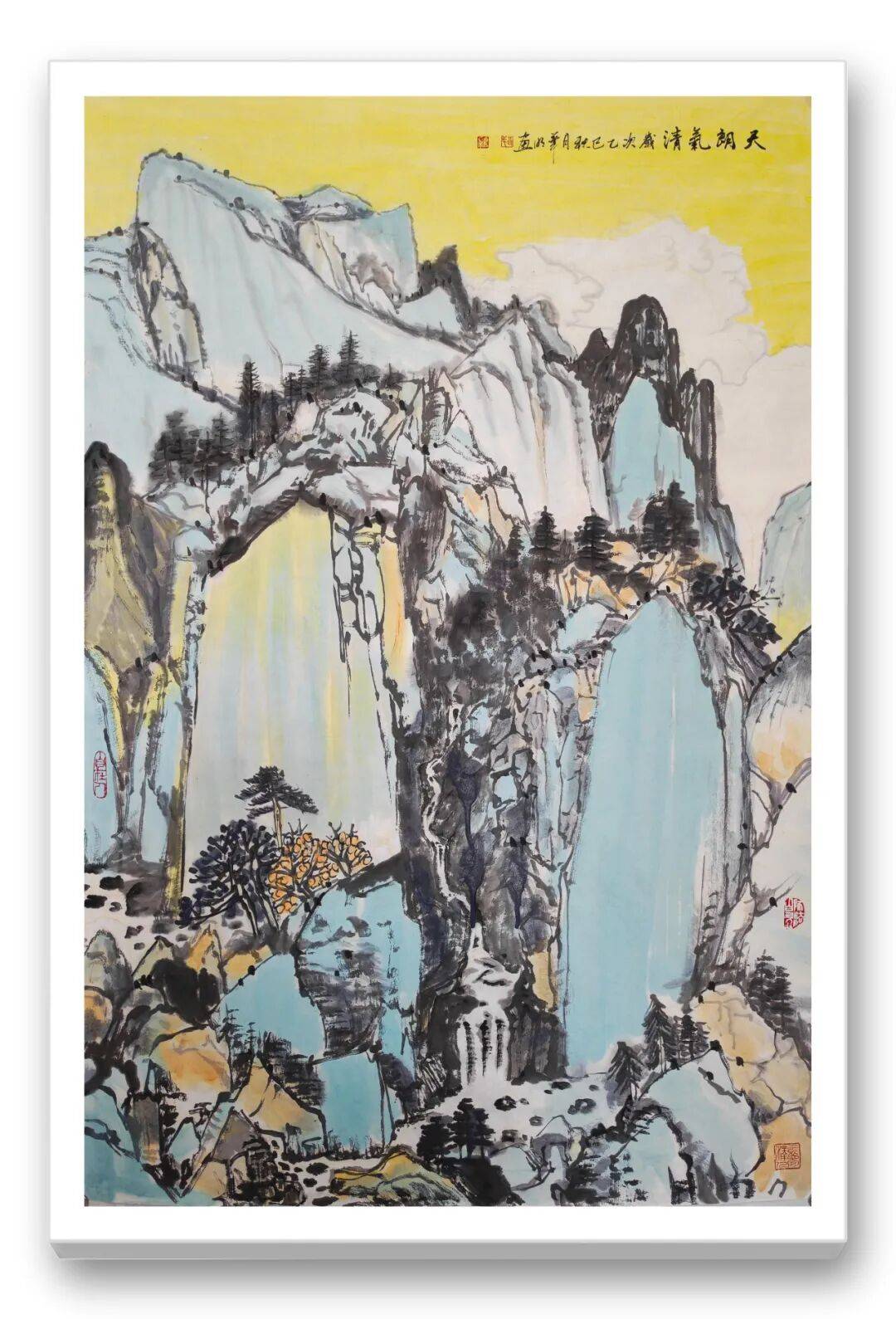 而在墨与彩的关系处理上,聂华明老师突破了传统山水画“水墨为上”的固有模式,大胆且巧妙地运用色彩,使画面焕发出新的生机。传统山水画的色彩多为浅绛、青绿等较为素雅的色调,以辅助水墨营造意境。但聂老师的作品中,色彩不再是水墨的附属,而是与水墨相互交融、相互映衬的重要元素。画面中的山壁,一侧是澄澈的蓝,一侧是暖调的黄与橙,色彩的碰撞既形成了强烈的视觉冲击,又通过水墨的调和,让色彩过渡自然,不显突兀。蓝色的冷寂与黄橙的暖融,恰似秋光中的清寒与和煦并存,既展现出秋天特有的节气氛围,又在色彩的对比中,赋予了画面现代艺术的形式美感,使传统山水在色彩的助力下,更具时代气息。