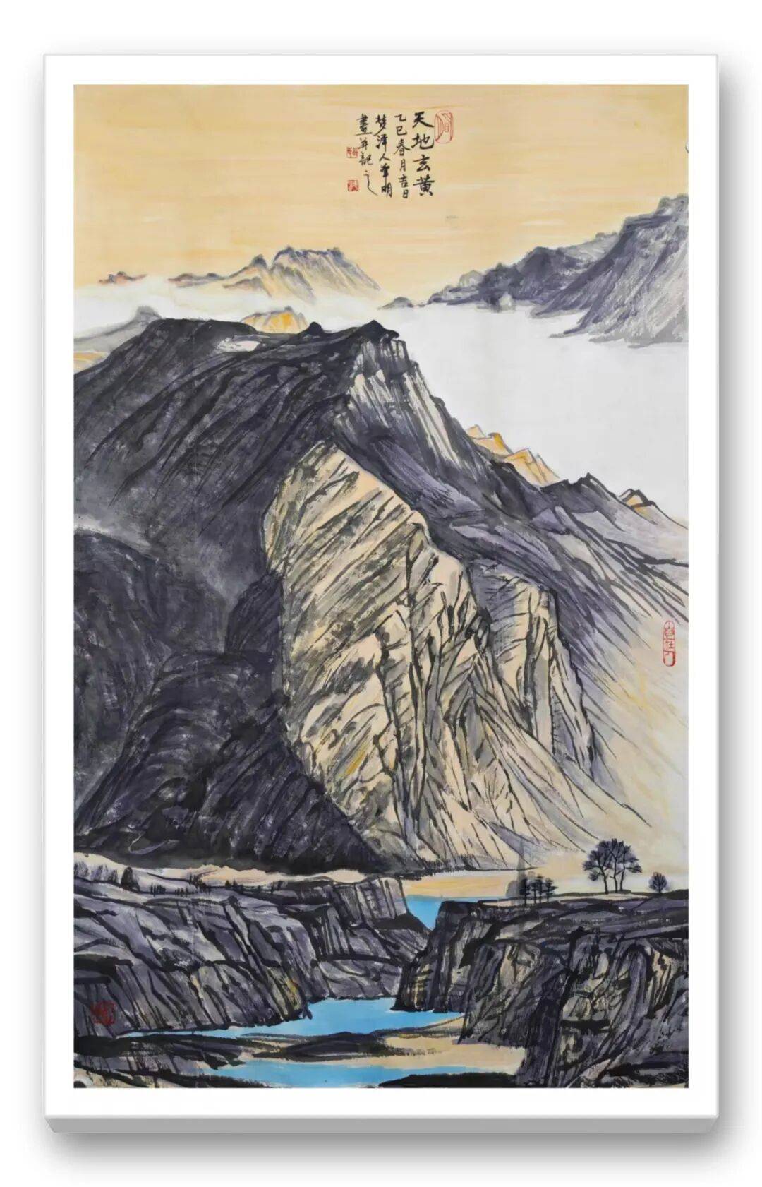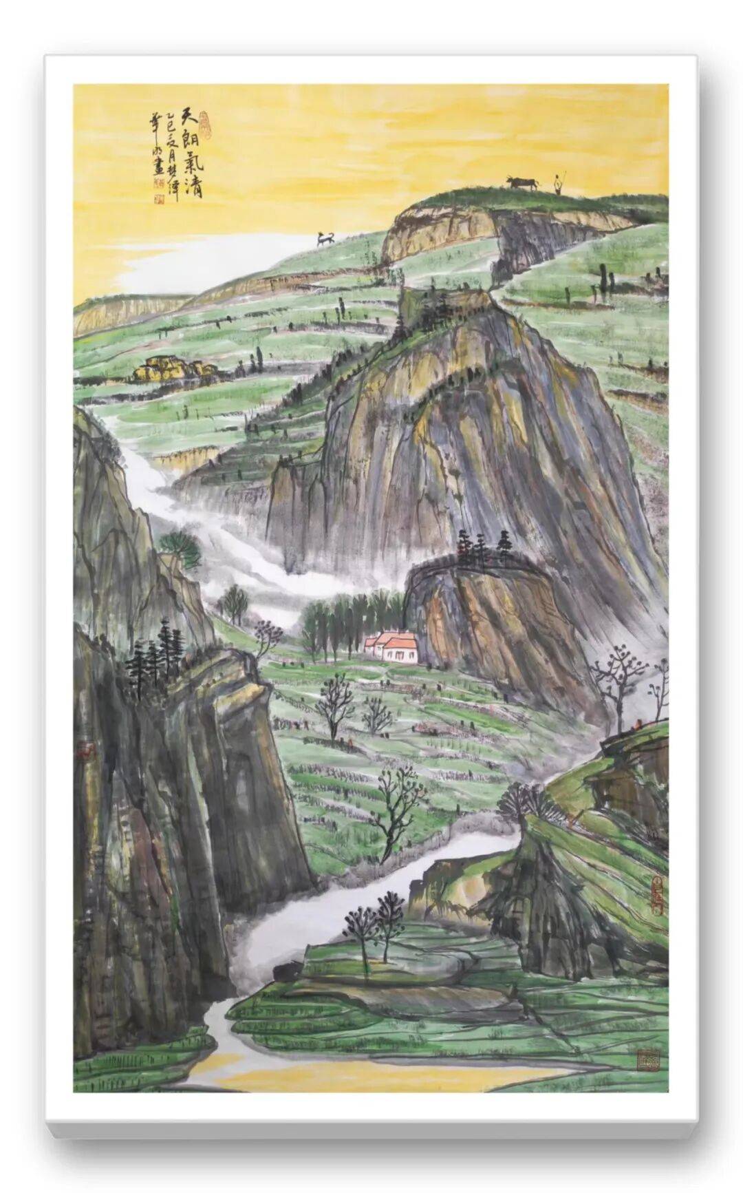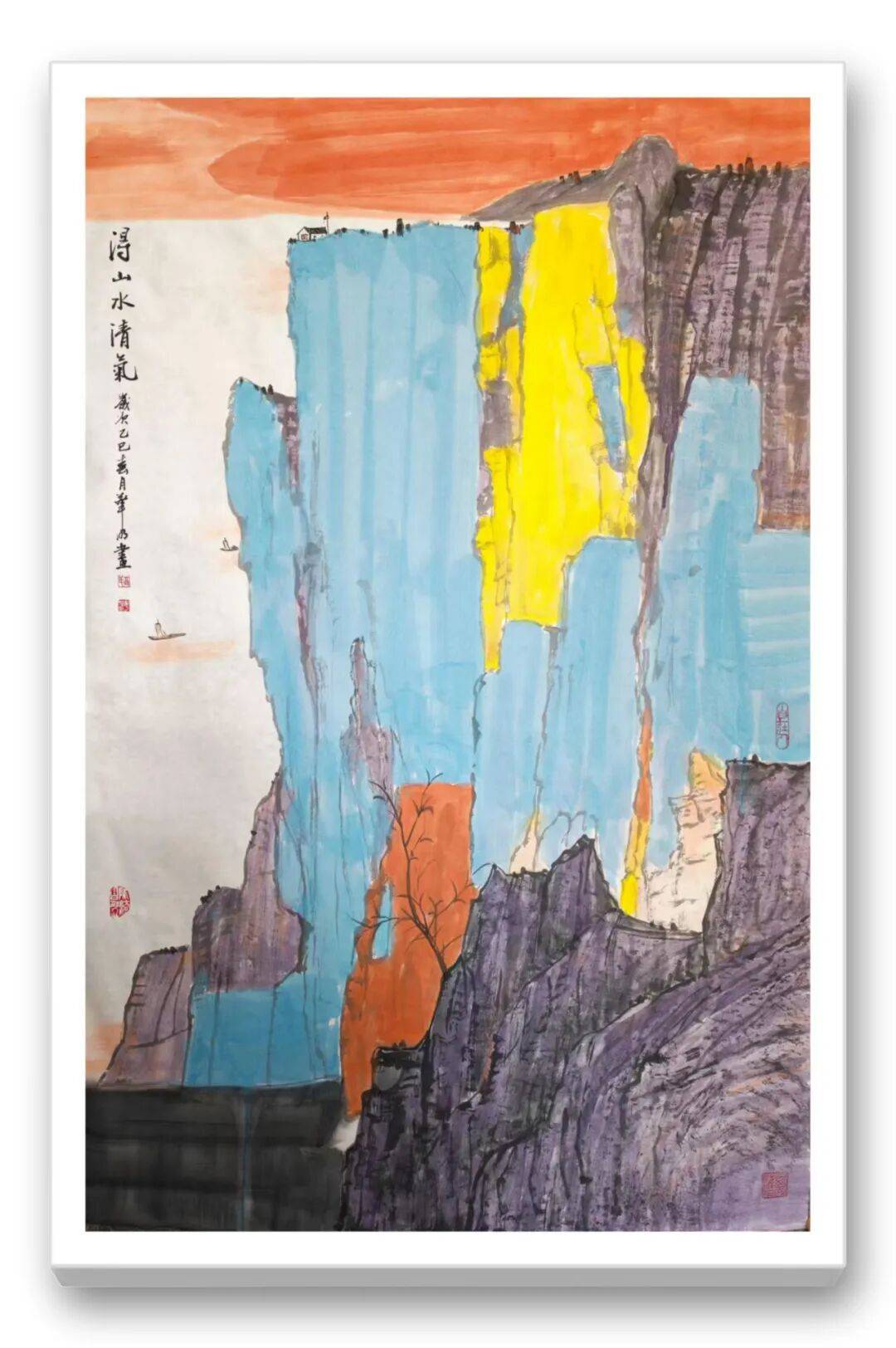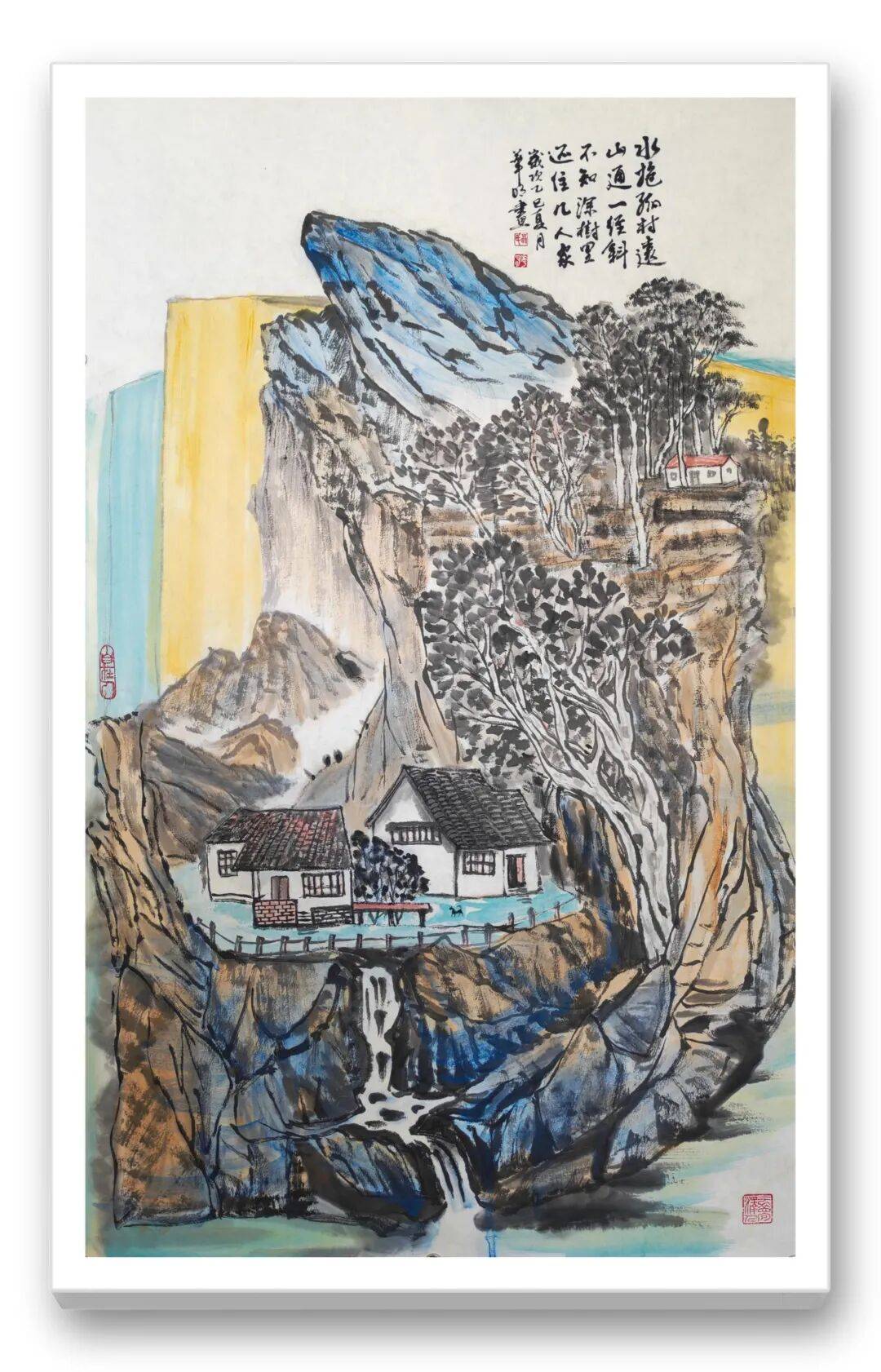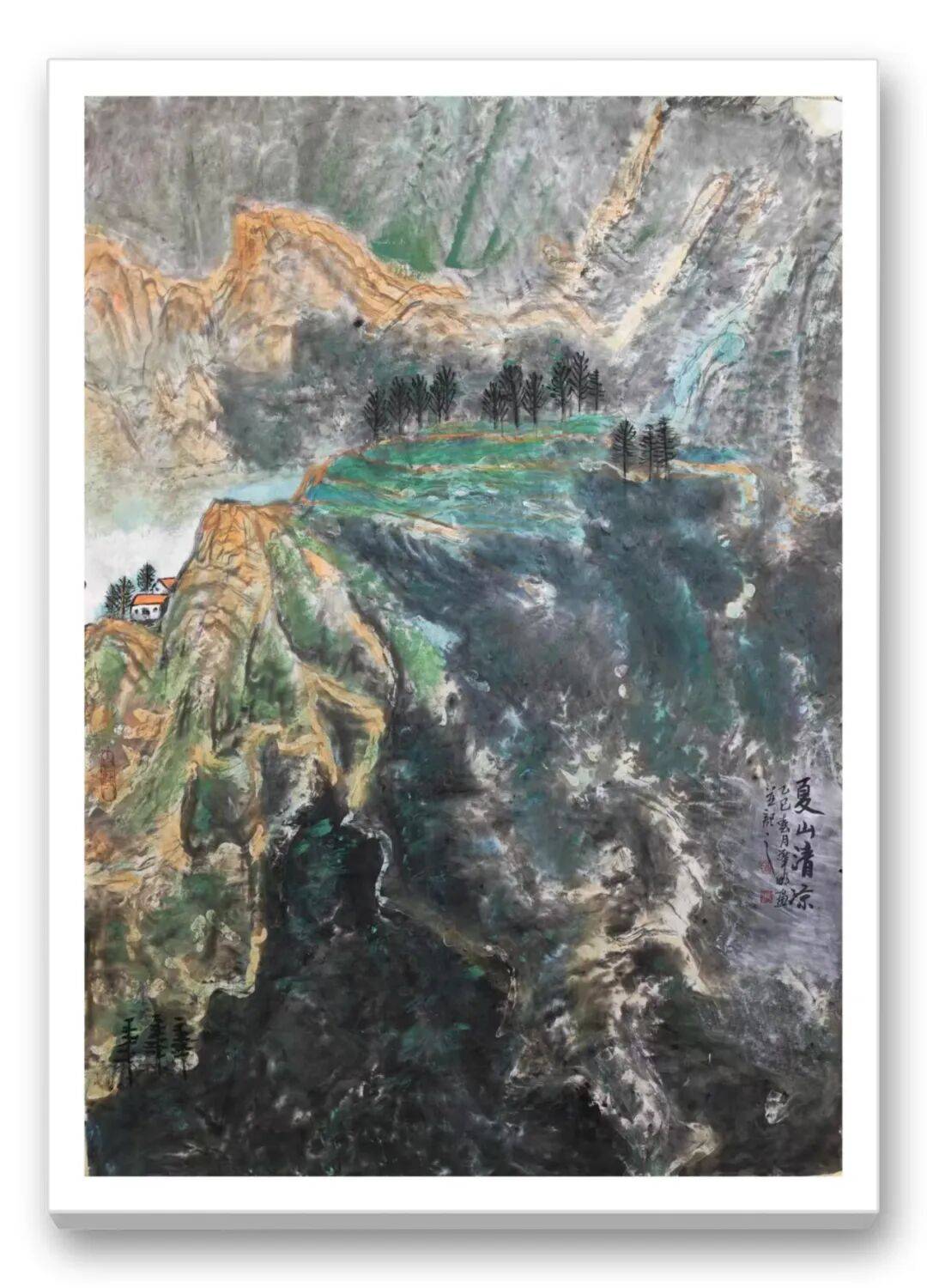 从构图来看,聂华明老师的山水画既遵循传统山水画“高远”“深远”“平远”的构图法则,又融入了现代构成意识。传统构图注重画面的开合、主次、呼应,以营造出“可行、可望、可游、可居”的意境。聂老师采用高远与平远结合的构图,近景是陡峭的山崖,中景是蜿蜒的河流与错落的屋舍,远景是连绵的山峦,层次分明,让观者的视线能在画面中自由游走,仿佛真的置身于那开阔清朗的山水之间。同时,他又巧妙运用现代构成的理念,对画面中的元素进行提炼与重组。在《夏山清凉》里,山体的形态被概括成富有韵律的块面,树木、屋舍等点缀其间,既保留了山水的自然形态,又通过块面的大小、色彩的对比等构成手法,使画面具有强烈的形式感,让传统山水的意境表达更具现代视觉张力。