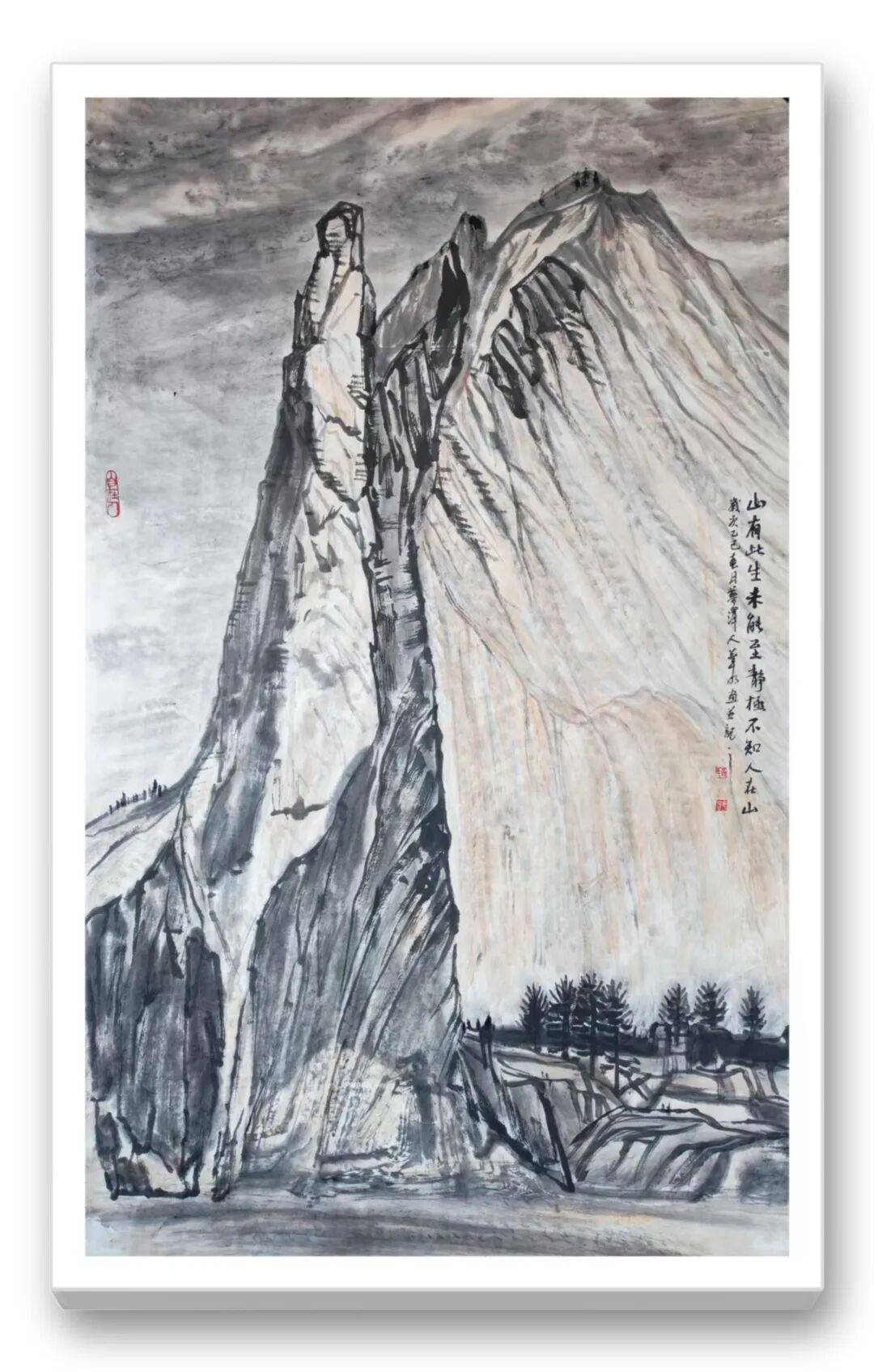 聂华明老师的山水画,首先在笔墨运用上尽显传统功底。中国山水画的笔墨,是画家精神与情感的外化,是历经千年传承的艺术精髓。聂老师深谙此道,其笔下的山石皴法,或如斧劈,刚劲利落,尽显山石的巍峨峭拔;或似披麻,温润含蓄,勾勒出山体的浑厚质感。那陡峭的山壁,以浓淡干湿变化丰富的墨线皴擦而成,每一笔都仿佛蕴含着山石历经岁月的沧桑力量,墨色的层次变化,将山石的阴阳向背、凹凸起伏精准呈现,让观者能深切感受到传统笔墨所营造出的空间感与立体感。