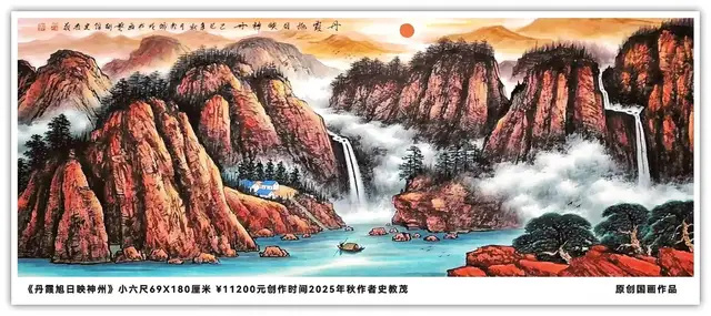 借山水澄怀观道,史教茂先生的画作,业精则得于勤,对笔、墨、纸、水的有机结合和巧妙运用,得益于对中国画的深刻理解和感悟。尤其是在彩墨山水和写意花鸟的表现形式上,更显示出其独特的个性。他的作品以创新入笔,以大气夺人,作品中生活气息浓厚,寓意幽深,符合中国道教文化中人与自然和谐共生的规律,凝聚着厚实的画风,每幅作品都暗藏着深远的美好祝愿和对祖国山河的美好祝福。