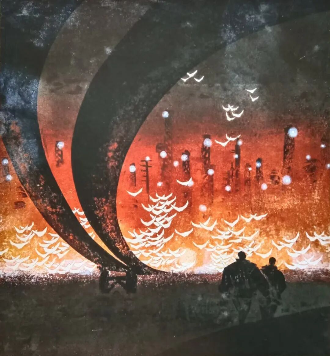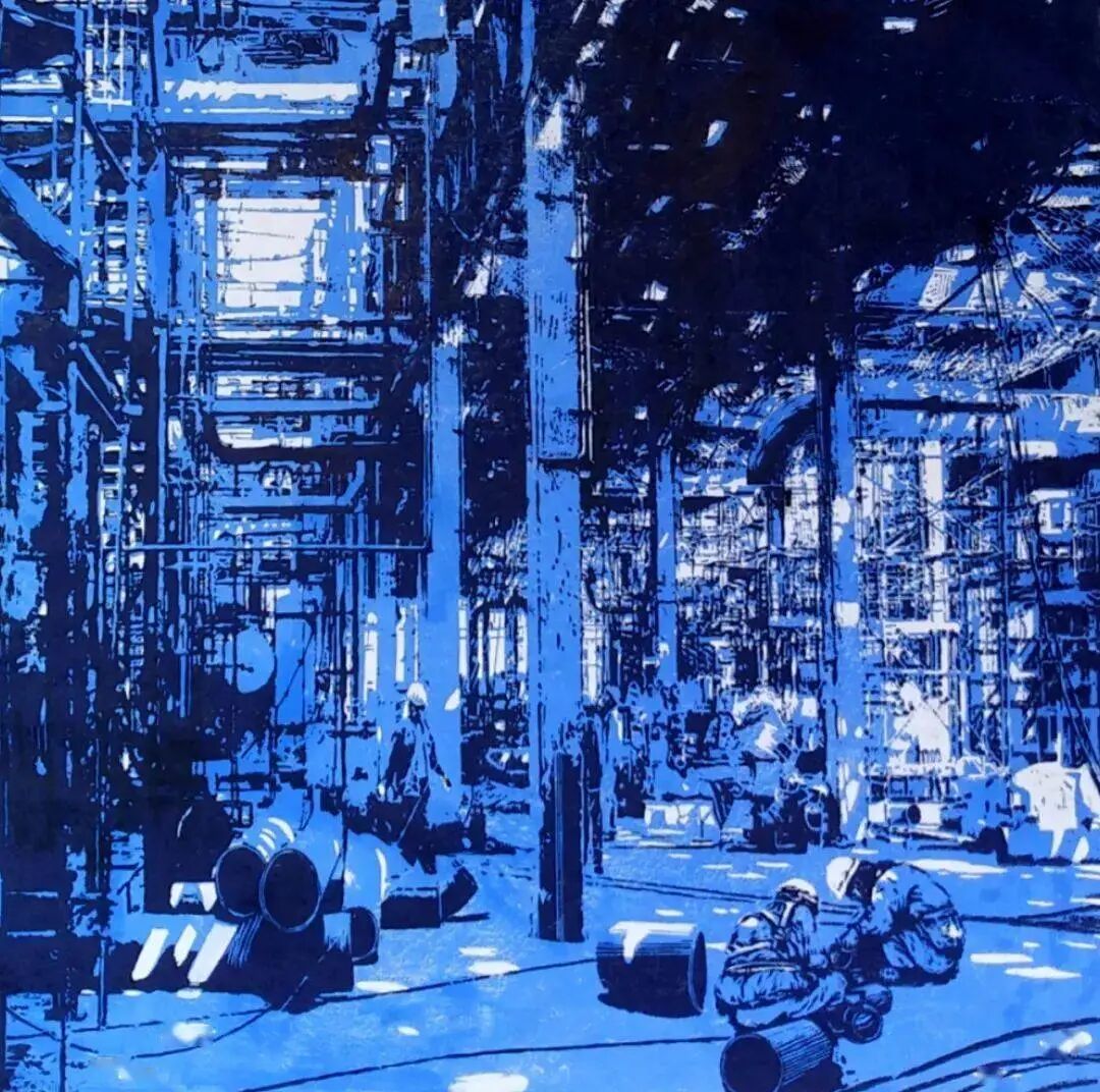 这种转化,得益于宿青松对艺术语言的精妙掌控。他深谙版画艺术的精髓,善于运用概括而有力的线条、饱满而富有层次的块面,以及黑白灰的纯粹语言,构建出既坚实又充满律动的视觉世界。在他的画面上,工业的“硬”与艺术的“柔”达成了完美的统一。