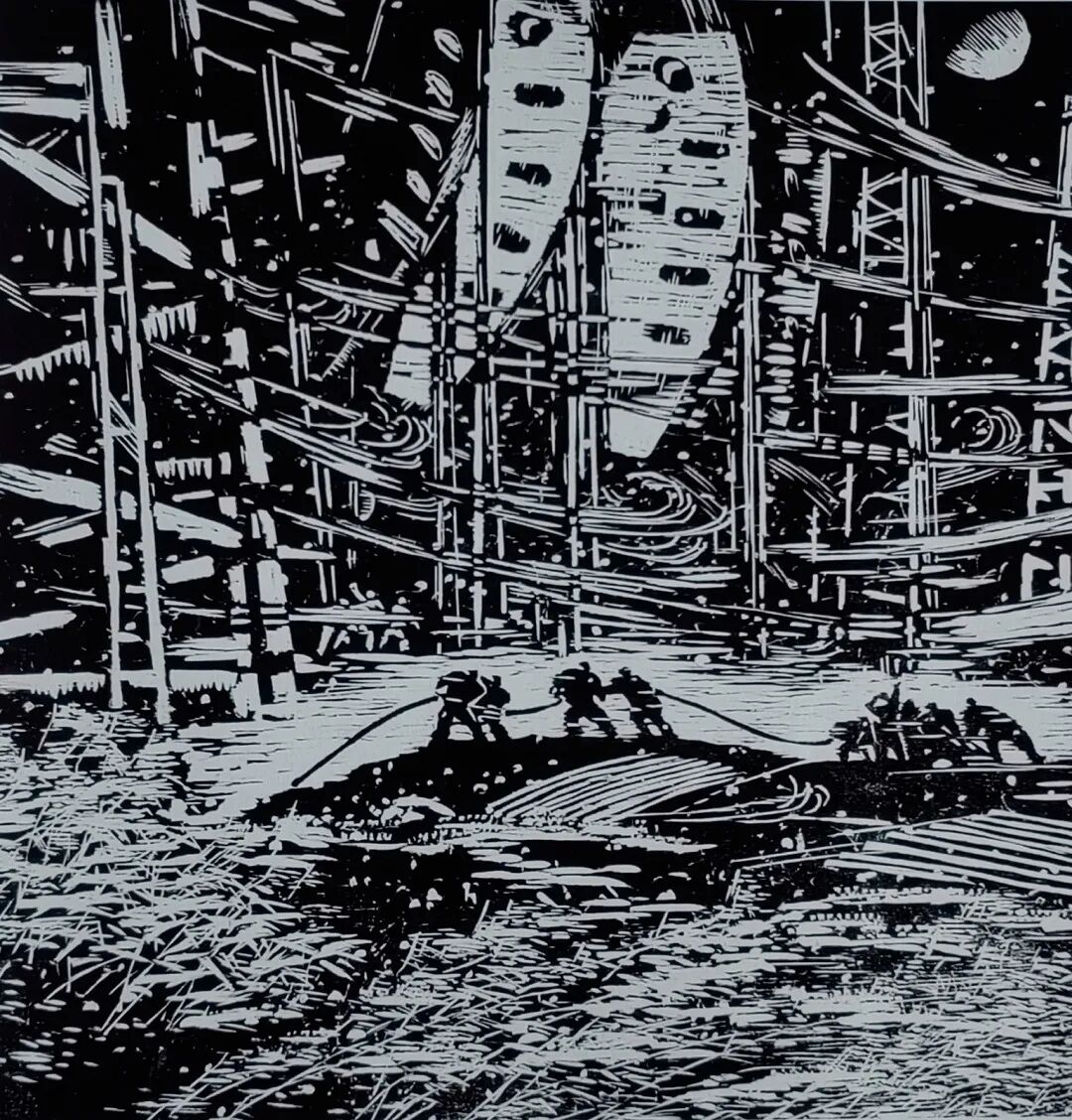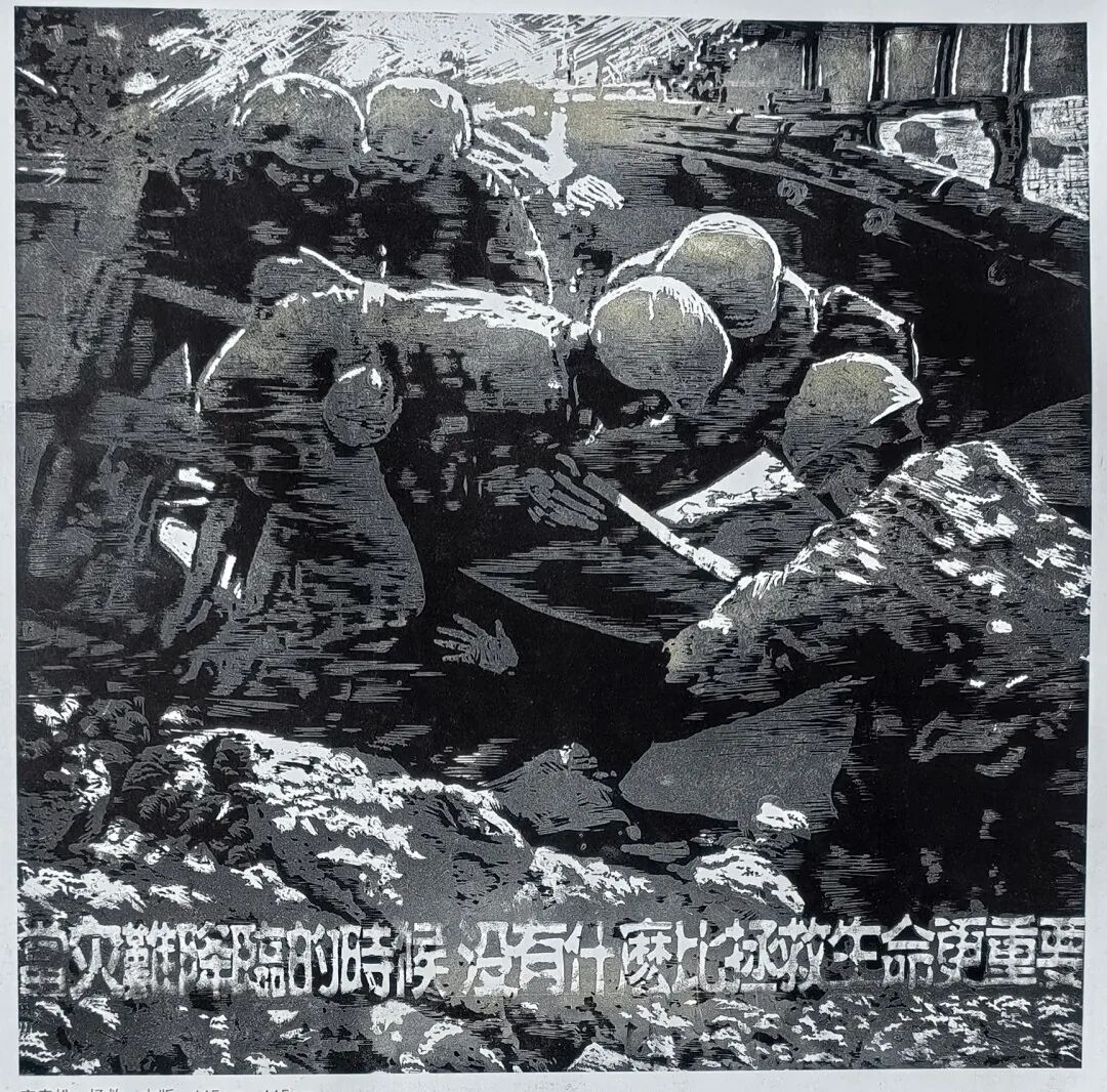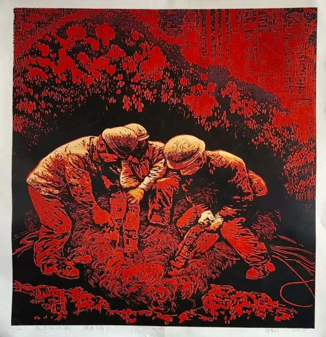 以代表作《钻头》为例。这绝非一幅简单的工业零件图谱。在他的刀下,钻头被赋予了强烈的雕塑感和生命力。那坚硬的螺纹、锐利的锋尖,通过黑白灰的强烈对比和富有表现力的刀法,呈现出一种无坚不摧的意志力。它不再仅仅是挖掘地层的工具,而是成为了工业精神的图腾,象征着劳动者攻坚克难的坚韧灵魂。同样,《会战路上》或许没有直接刻画人山人海,但通过宏大的场景、流动的线条和富有动势的构图,我们仿佛能听见机器的轰鸣、感受到建设者们的澎湃激情。这些作品的核心,始终是“人”的精神投射。