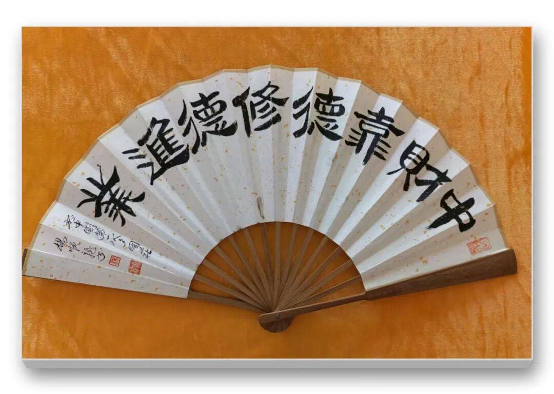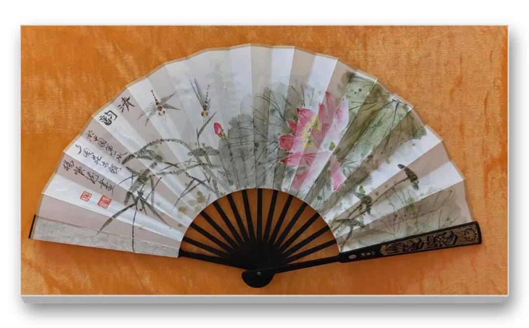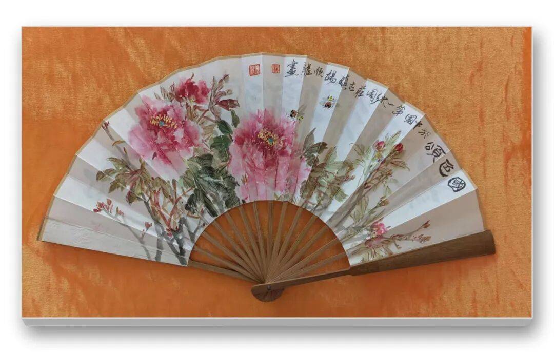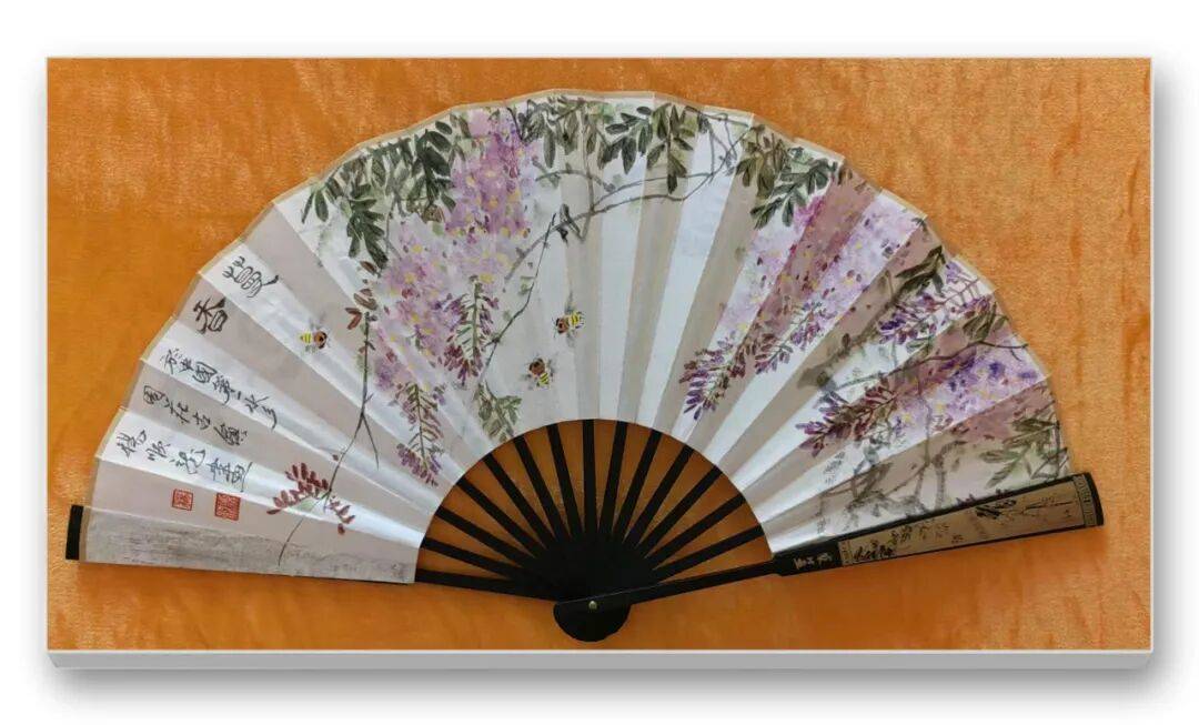 在杨顺龙老师的书画世界里,每一笔、每一划都似在诉说着与艺术的深情对话,将传统笔墨的精髓与对生活的感悟熔于一炉,为观者呈现出一场酣畅淋漓的视觉与精神盛宴。折扇之上,尽展灵动意趣。绘牡丹者,色彩浓淡相宜,花瓣层层叠叠,似有暗香浮动,蜜蜂点缀其间,更添生机,仿佛能看见它们在花间翩跹采蜜的模样;绘紫藤者,紫花垂蔓,枝叶舒展,那朦胧的紫色似在微风中轻轻摇曳,蜜蜂穿梭,让静态的画面有了动态的韵律,折扇的形制又为这些景致增添了几分雅致与精巧,手持这样的折扇,仿佛能于夏日暑气中寻得一份诗意的清凉。