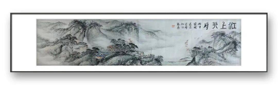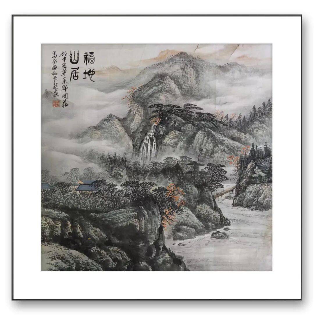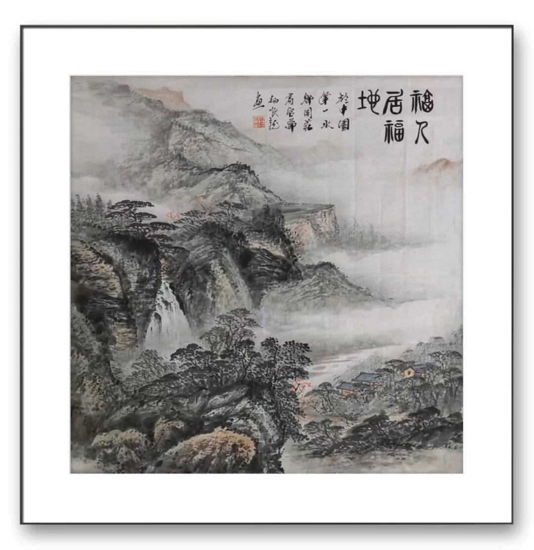 杨顺龙老师的山水之作,尽显天地浩渺与文人情怀。山峦巍峨,云雾缭绕,瀑布飞流直下,山脚下屋舍俨然,营造出静谧祥和的世外桃源之境,仿佛能让人感受到居于此处的悠然与幸福;以阔大的视野描绘出连绵群山与滔滔流水,云雾在山间流转,似将山水的悠长与情意的绵长都融入这无尽的天地之间,笔墨苍润,意境深远,展现出传统山水画“咫尺山林,万里江天”的独特魅力。