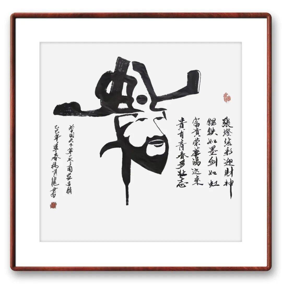 杨顺龙老师这种创新形式打破了传统书法的常规,极具视觉冲击力。书法线条富有动感与张力,或粗或细,或曲或直,勾勒出的人物形象生动传神,仿佛财神爷跃然纸上。旁边的题诗 “张灯结彩迎财神,银铁如墨剑如虹,富贵荣华鸿运來,贵有青春多壮志”,字体流畅洒脱,与主体创意书法相得益彰,既表达了对财富与美好生活的向往,又展现出青春壮志的豪情,使作品兼具艺术观赏性与文化内涵。