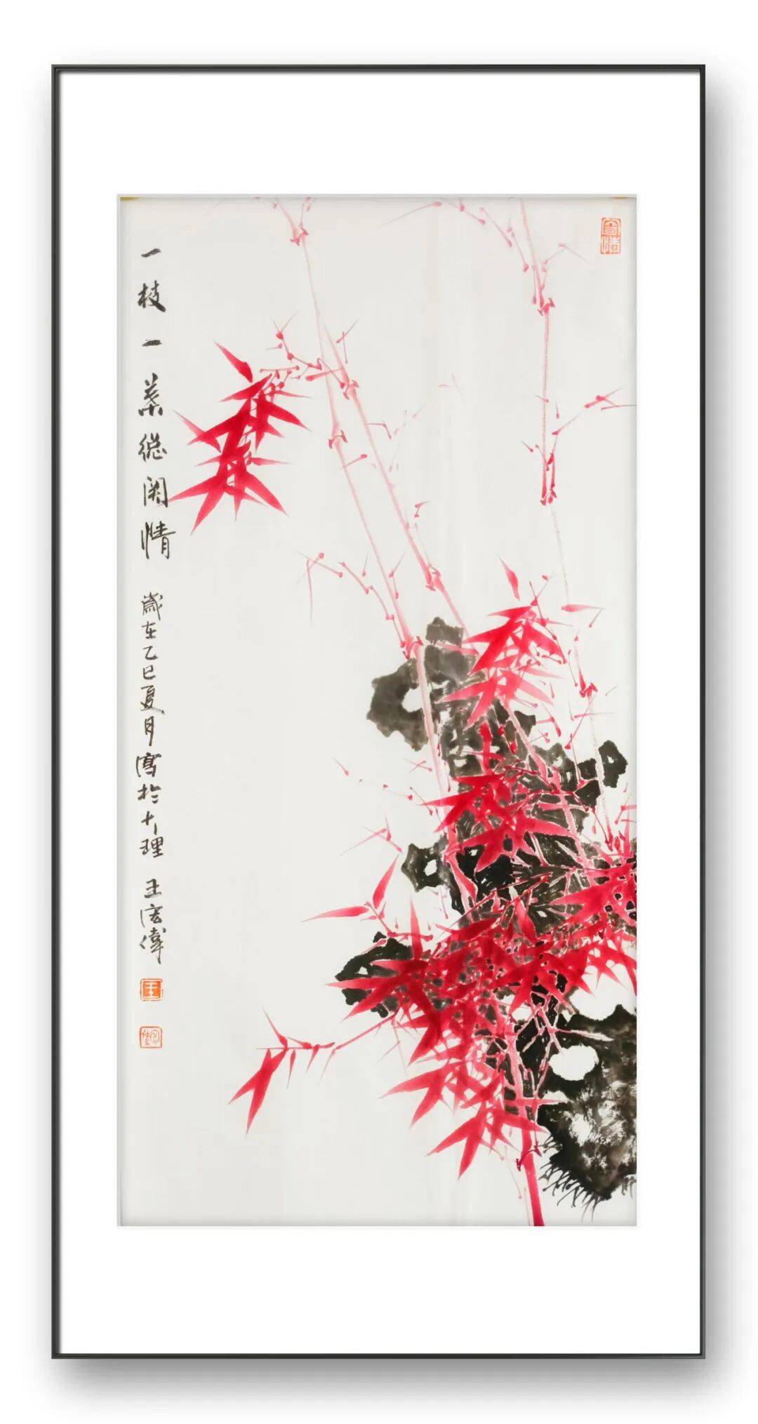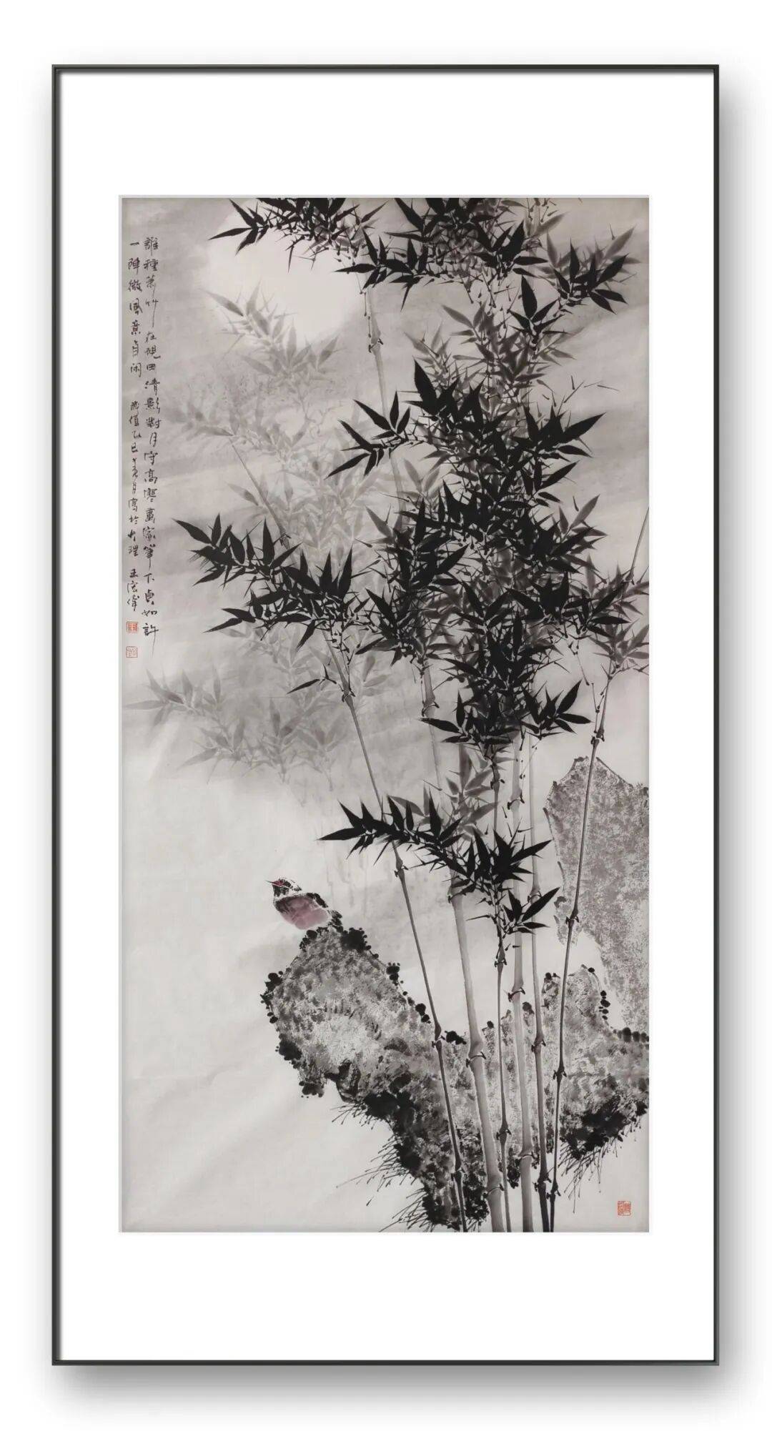 自然与心象的交融,赋予王宏伟的竹画独特的精神内核。他始终以观察自然为创作根基,将大理的风露晴雨融入笔墨——笔下修竹或在微风中摇曳生姿,或在晨雾里挺劲孤直,每一片竹叶的翻卷、每一节竹干的纹理,都源于对自然物象的精准捕捉。更难得的是,他并未止步于形似再现,而是经内心熔炼升华,让竹成为人格的投射:瘦竹嶙峋如铁,暗合“未出土时先有节”的士人操守;繁枝交错相依,彰显抱朴守真的品格。这种将物象转化为精神图腾的创作,使他的作品超越了单纯的题材表达,直抵文人画“以物喻志”的核心要义。