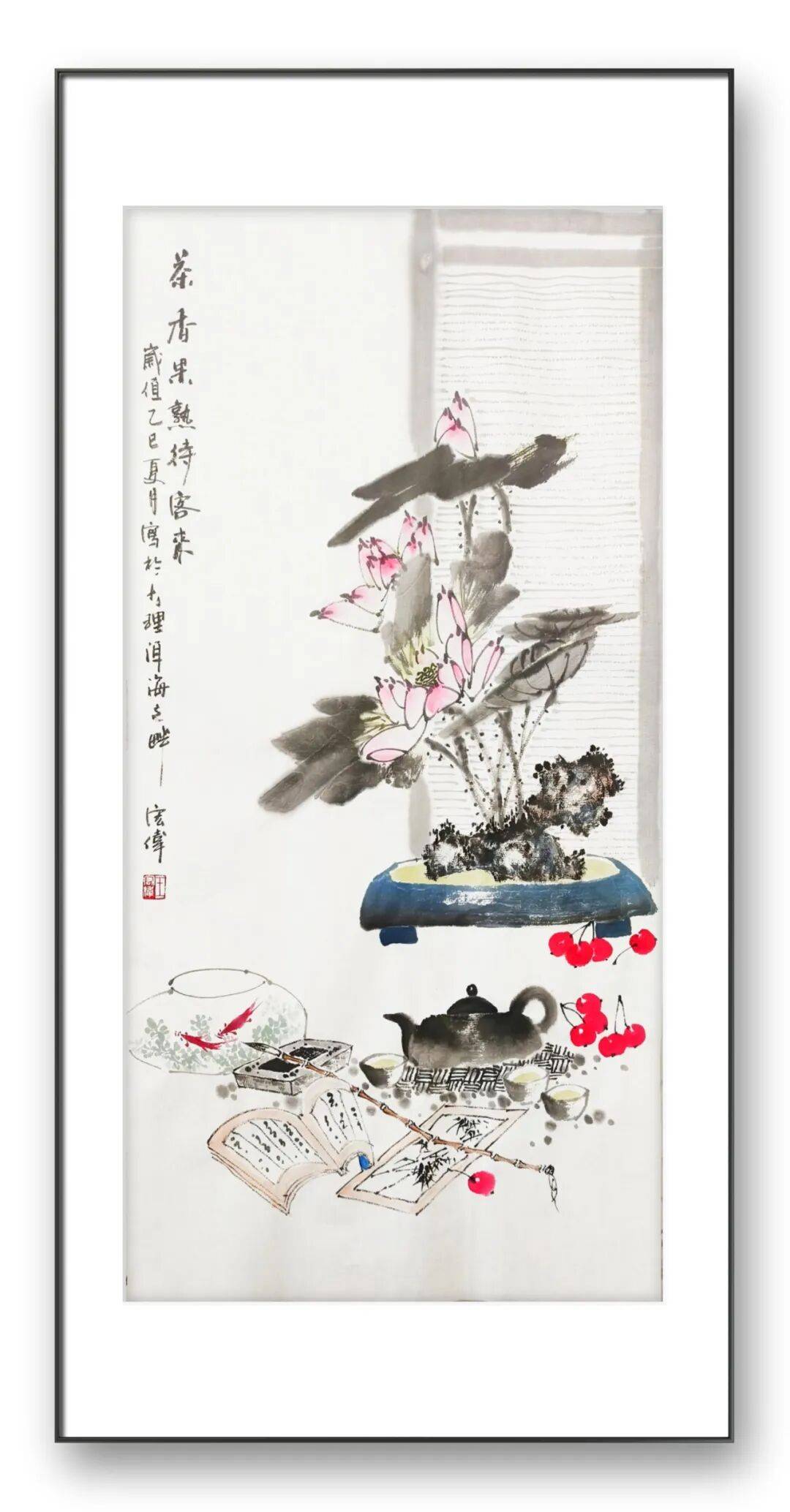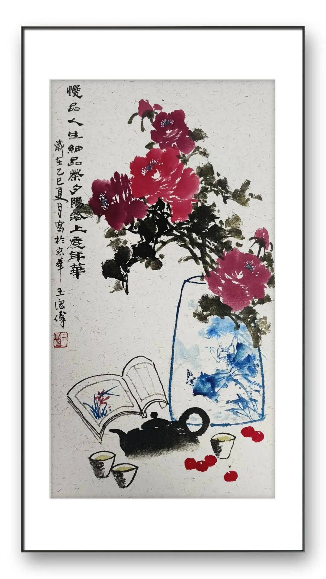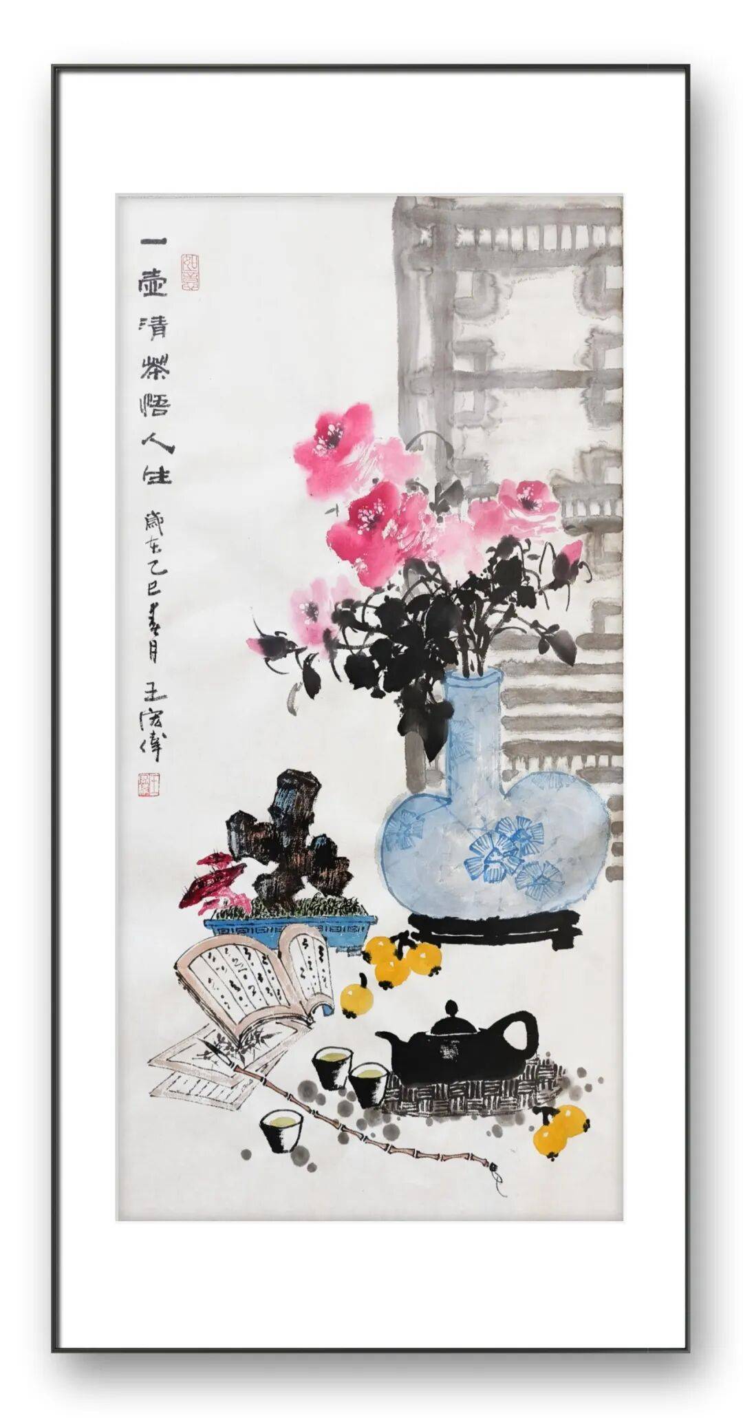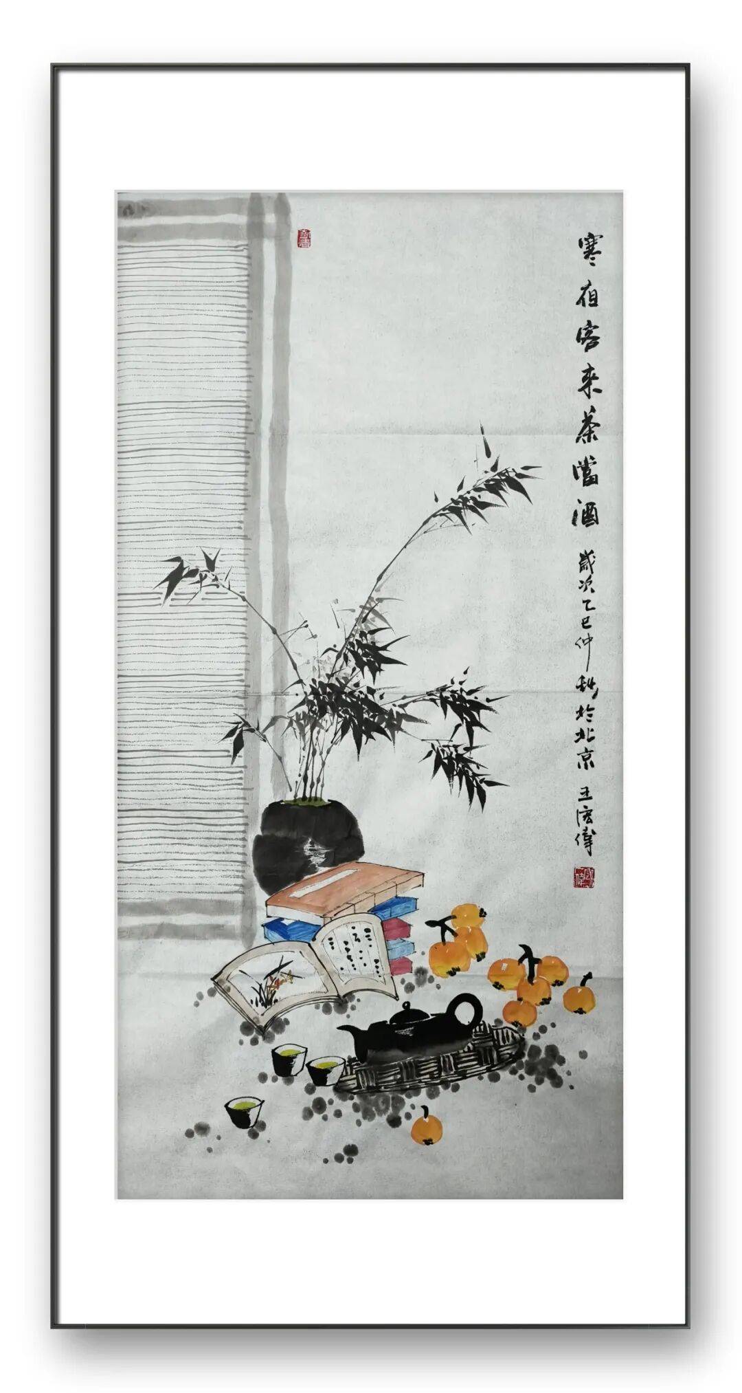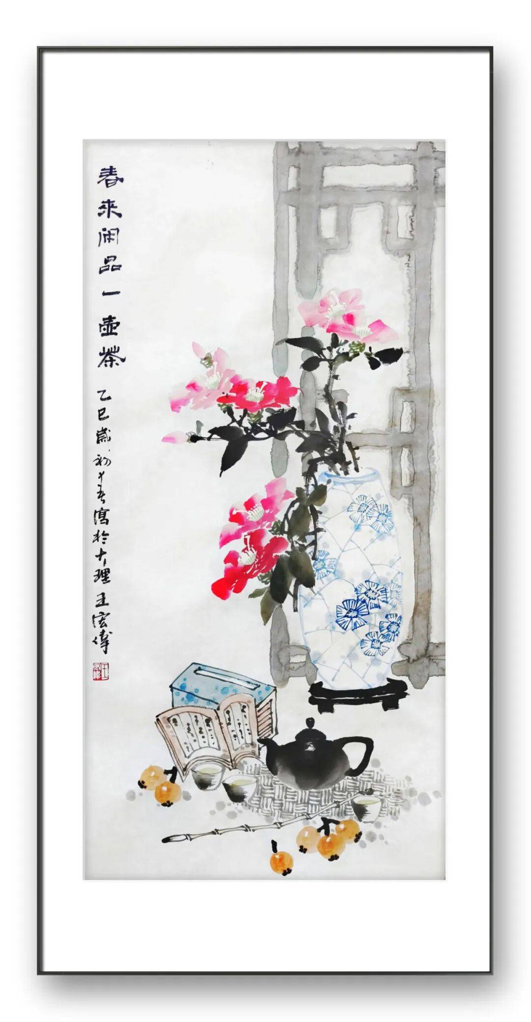 在传承中创新,是王宏伟竹画的鲜明特质。他善用散点式构图,让竹枝疏密有致、虚实相映,于繁乱中见章法,于空灵中藏意境。画面中点缀的麻雀、茶具等元素,更成为点睛之笔——《竹雀图》中独立梢头的雀鸟,既暗合传统寓意,又注入生活气息,消解了古典竹画的孤寂感。他更突破水墨藩篱,以朱砂点染梅花与墨竹形成冷暖碰撞,用工笔青花瓶与写意修竹构成古今对话,甚至在光影处理中融入西方印象派的朦胧质感,在跨文化审美中拓展了文人画的视觉张力。